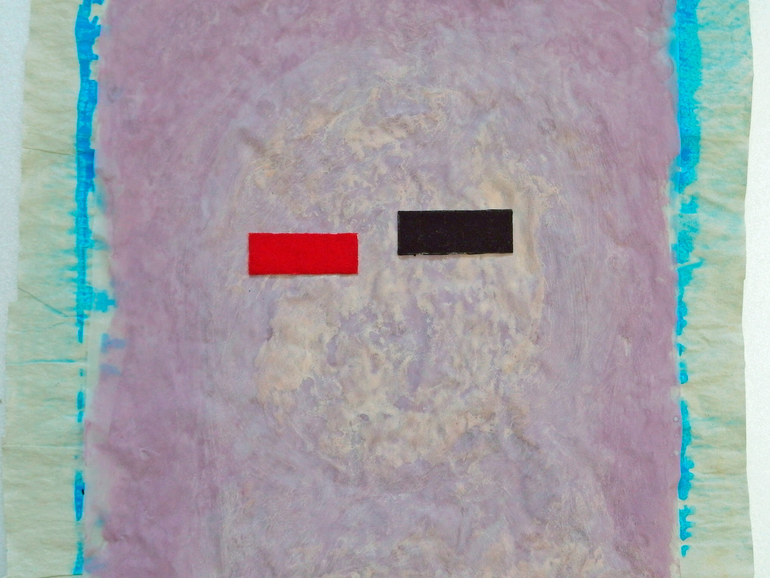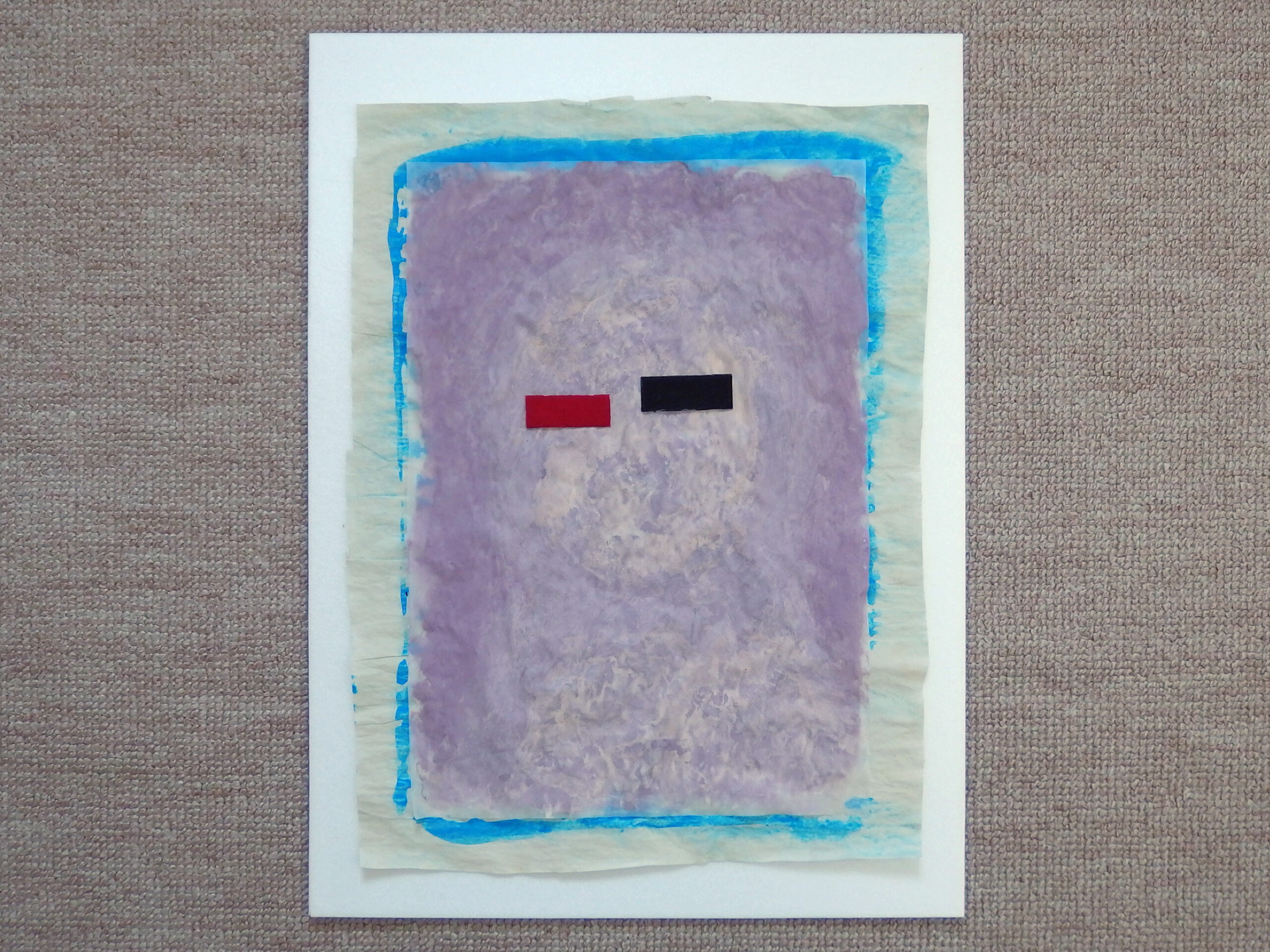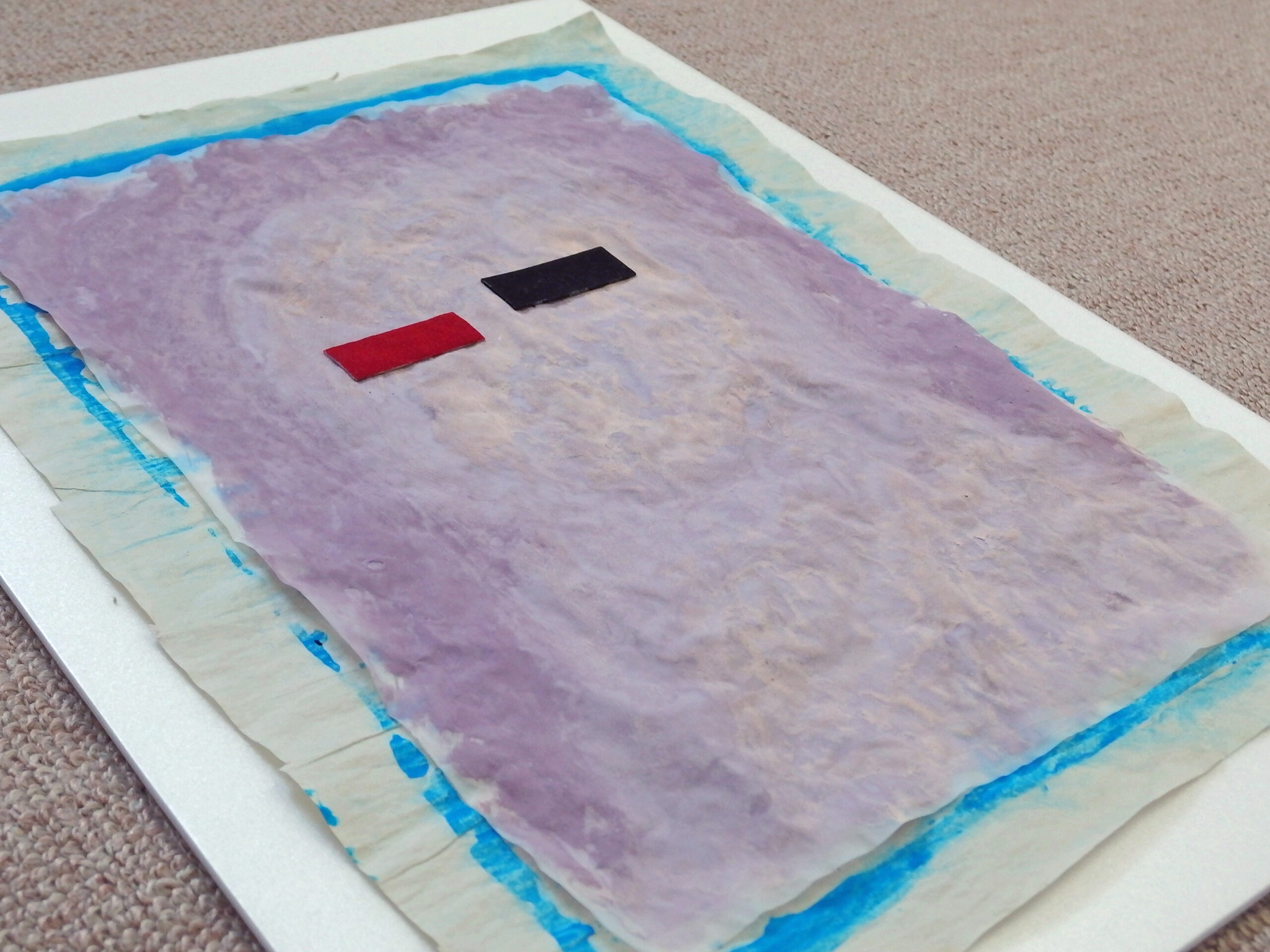 天然素材の和紙に膠を使うのが「日本画」の常識ですが、あえて人工素材を使っています。
