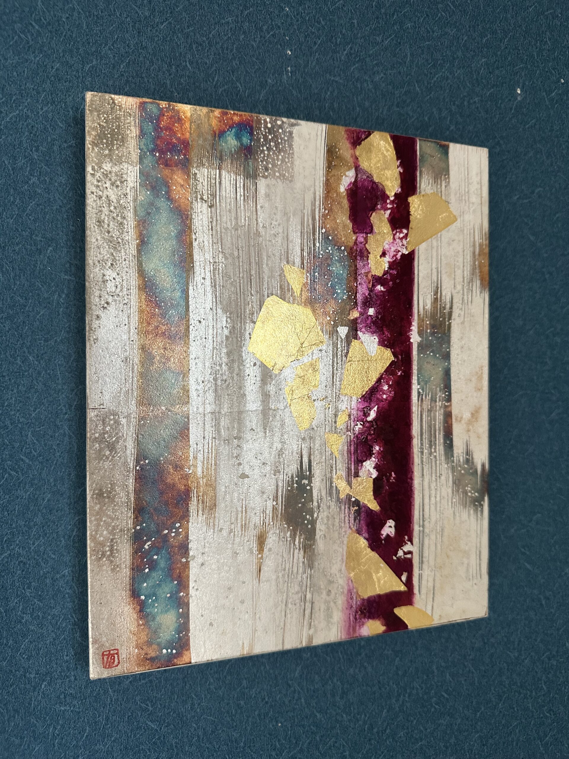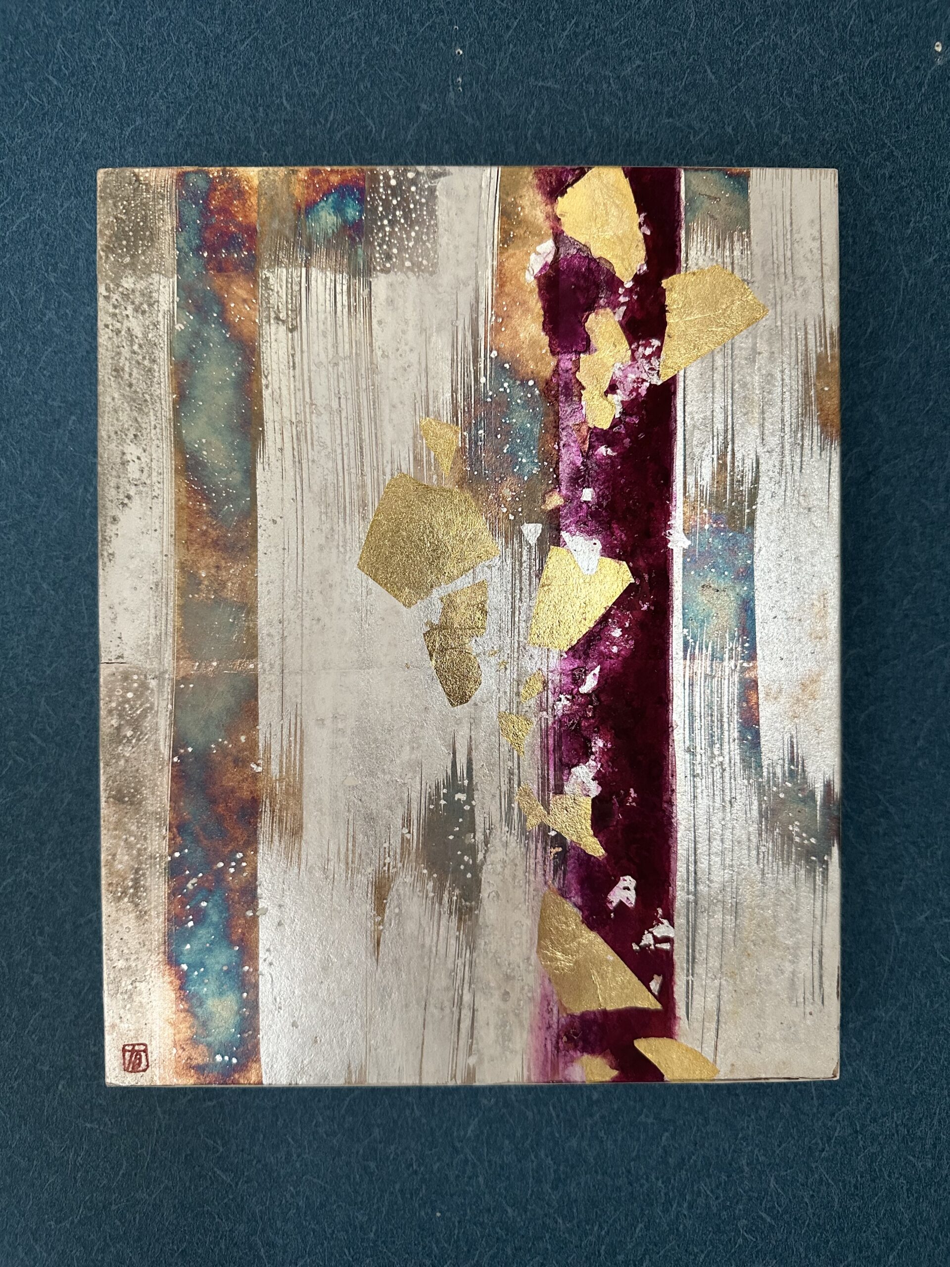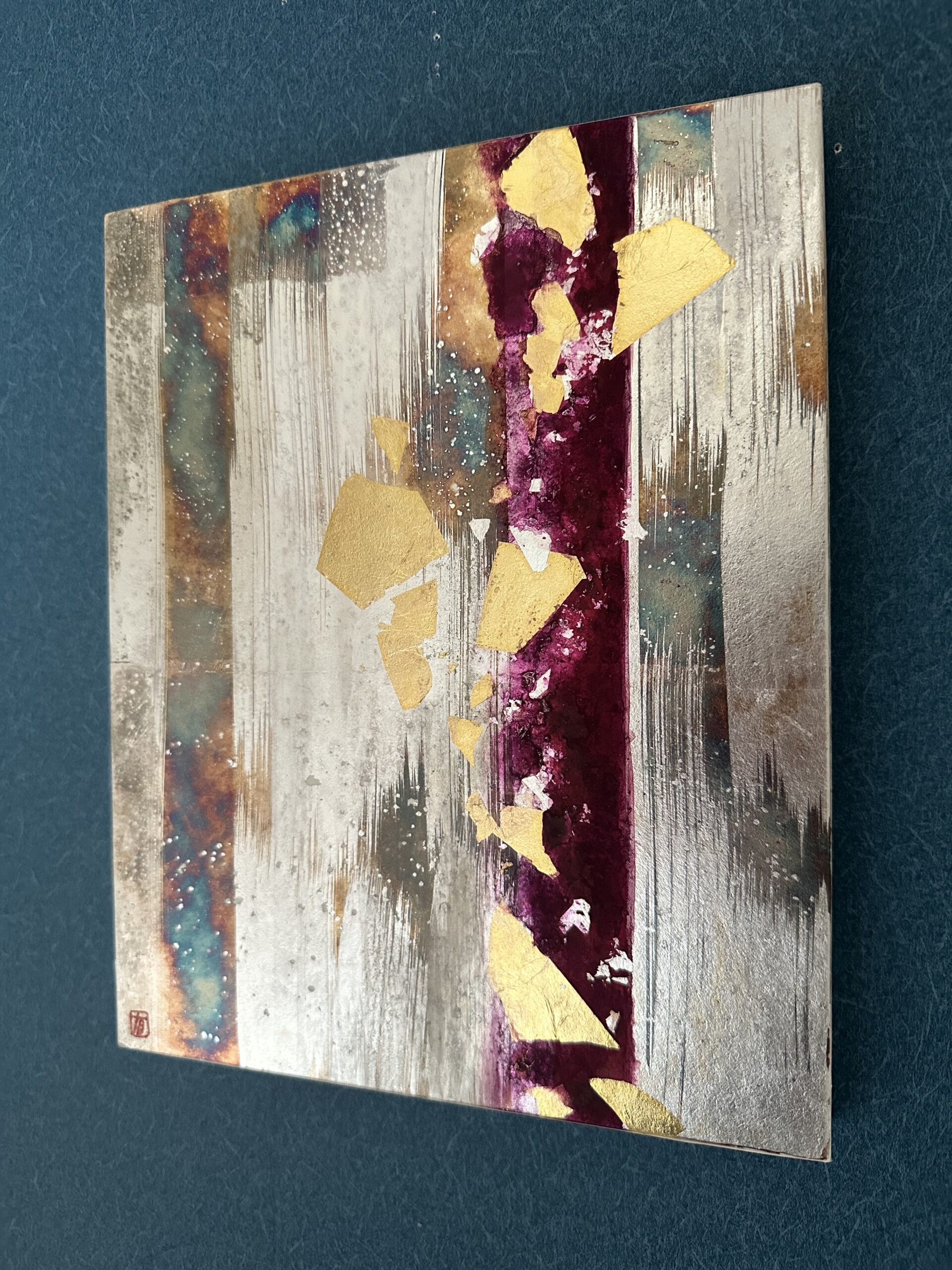 箔を使用した作品は、光のあたり方によって輝き方が変わります。日中の窓から入る自然光、夜の照明の光など、光の違いにより表情がかなり変わります。また、箔の変色を抑えるためのコーティングをしておりますが、時間経過とともに少しずつ色味が変化します。その変化もお楽しみいただけますと幸いです。