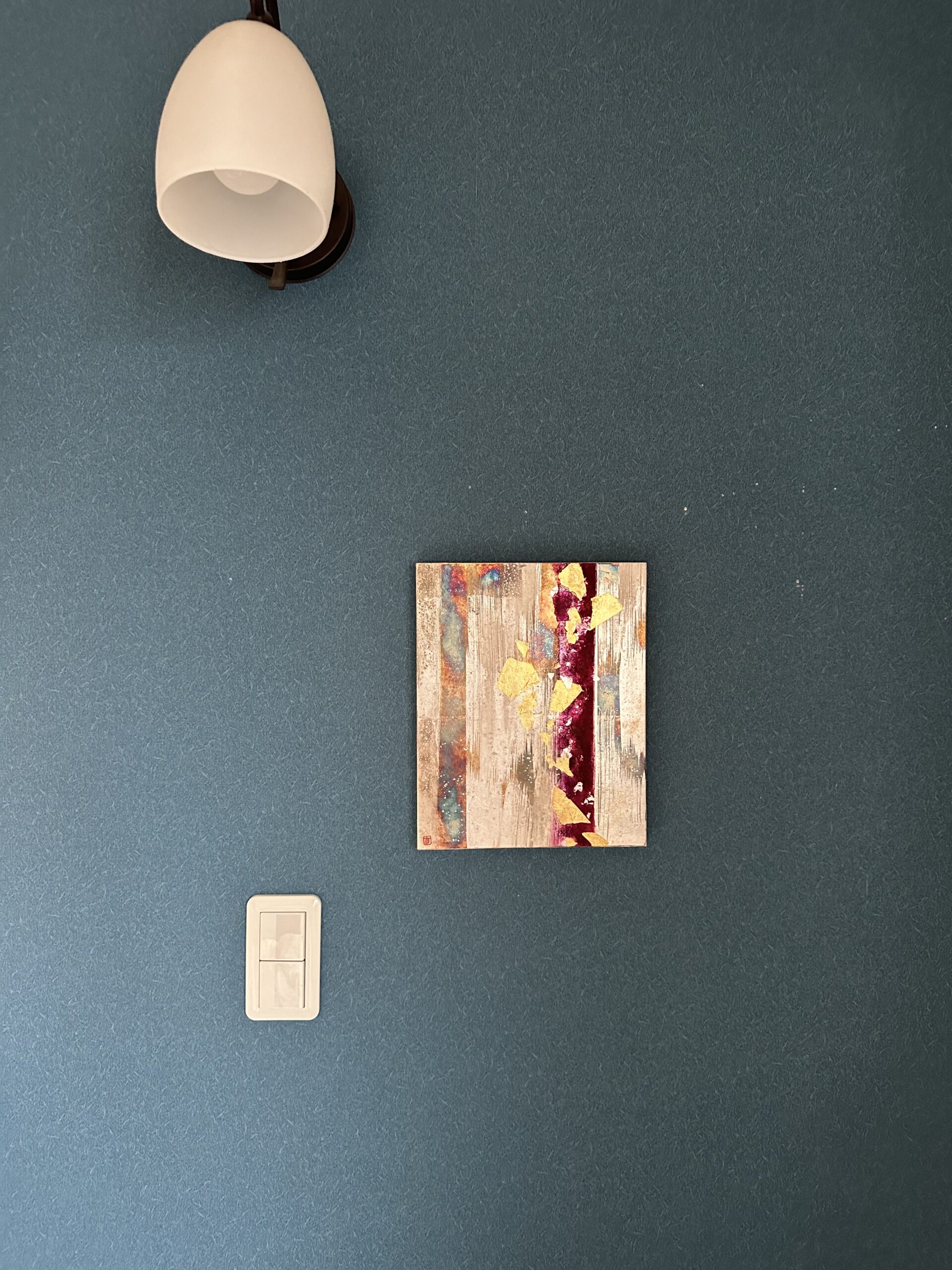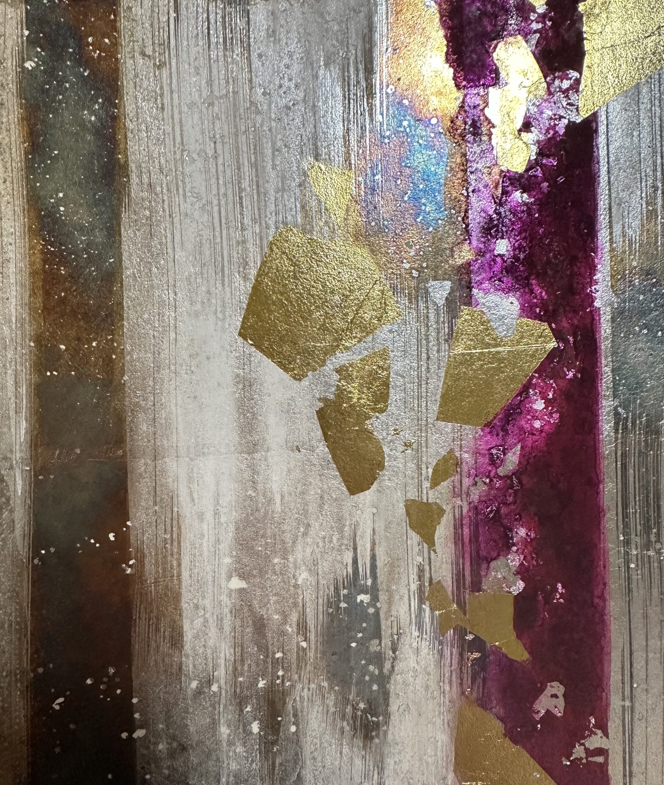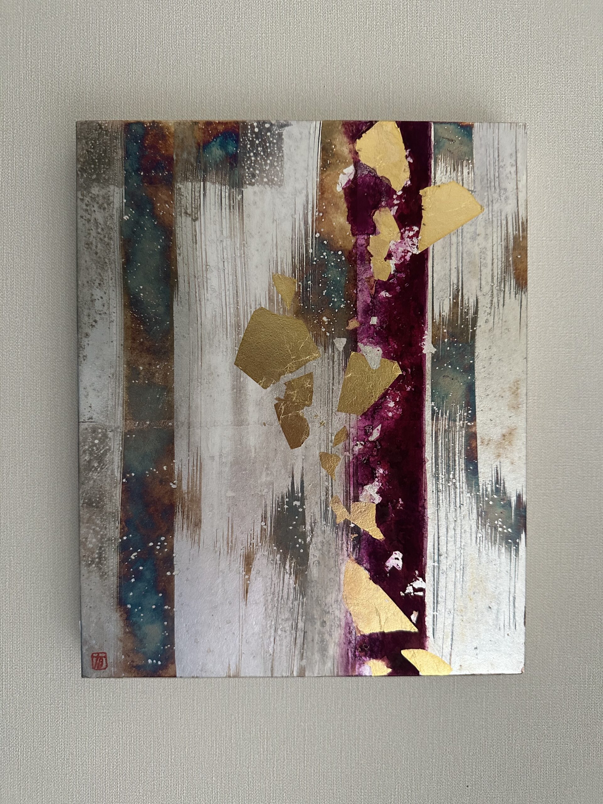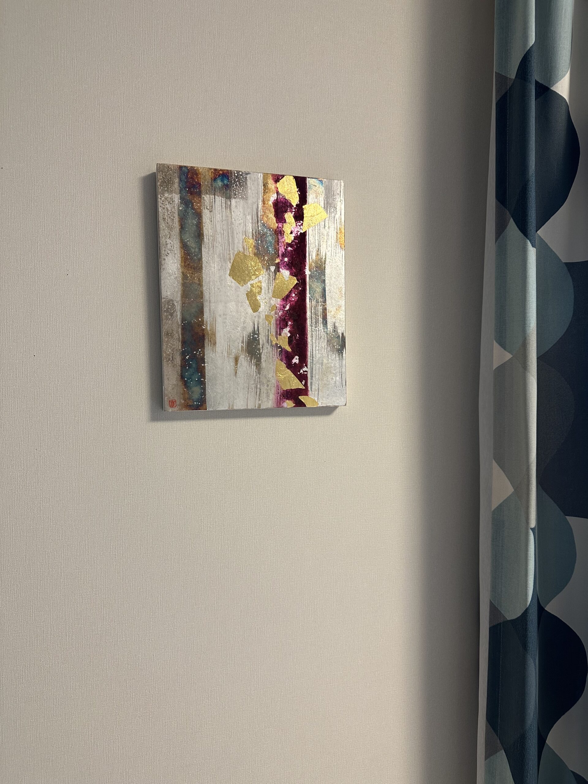 箔を使用した作品は、光のあたり方によって輝き方が変わります。日中の窓から入る自然光、夜の照明の光など、光の違いにより表情がかなり変わります。また、箔の変色を抑えるためのコーティングをしておりますが、時間経過とともに少しずつ色味が変化します。その変化もお楽しみいただけますと幸いです。