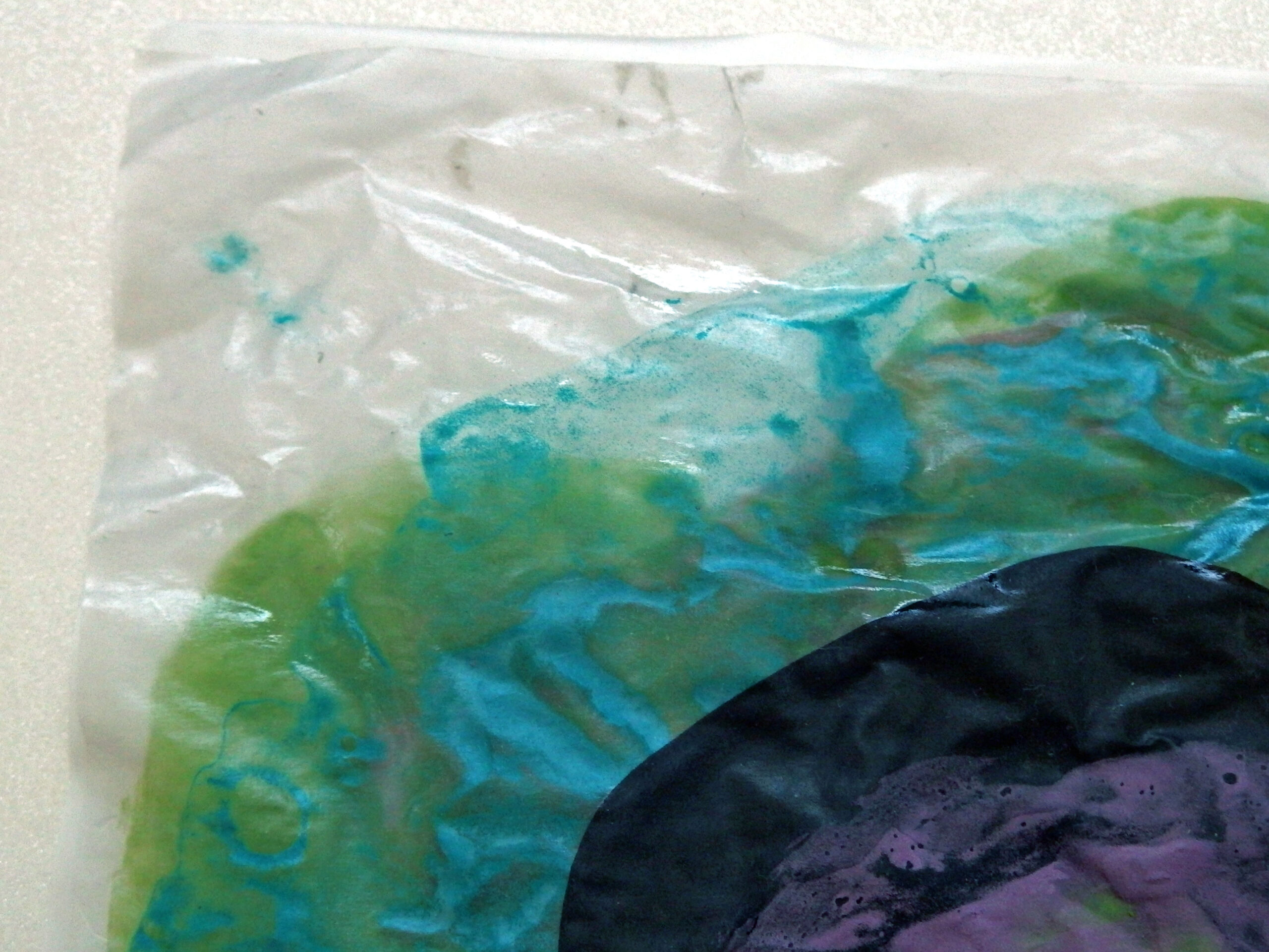 天然素材の和紙に膠を使うのが「日本画」の常識ですが、あえて人工素材を使っています。