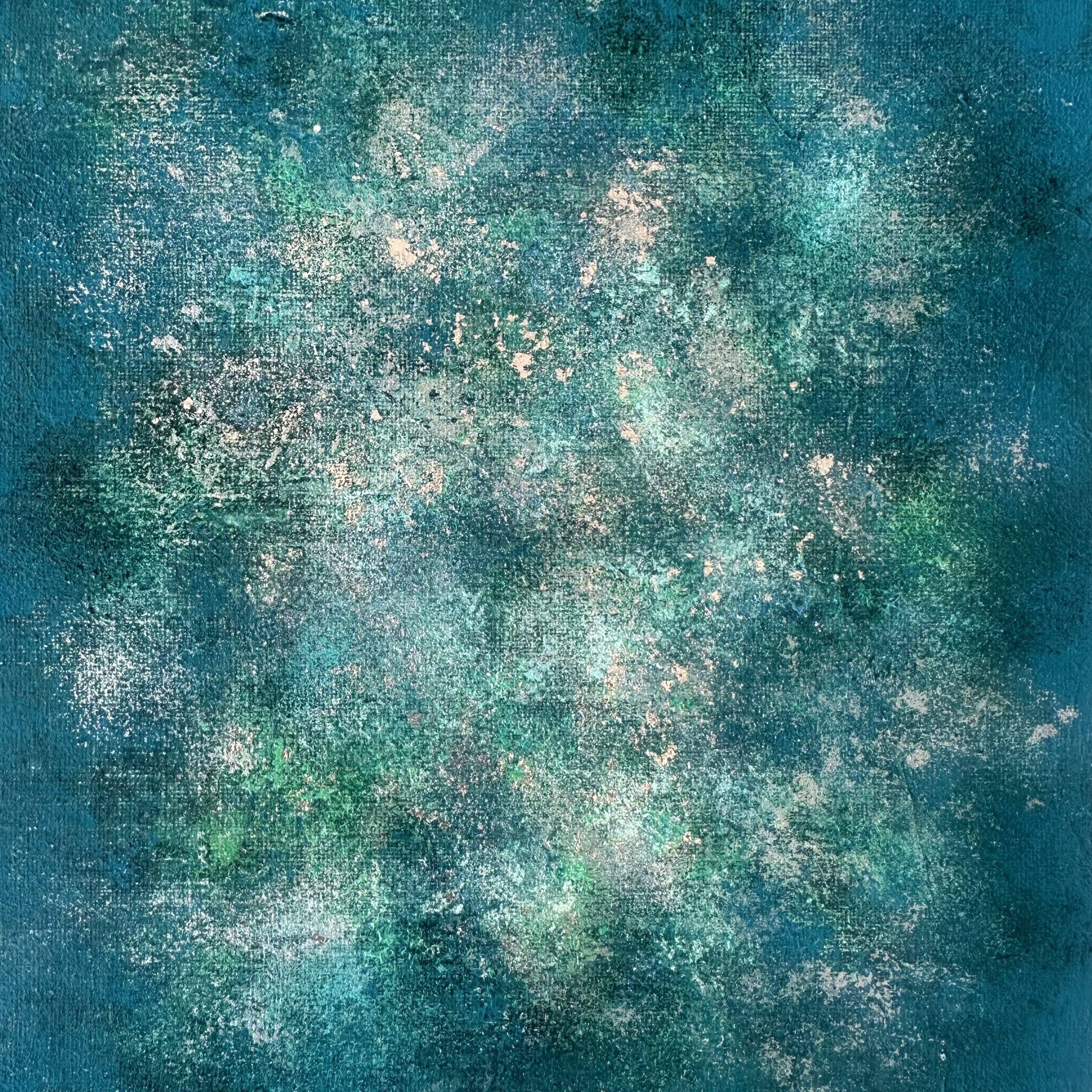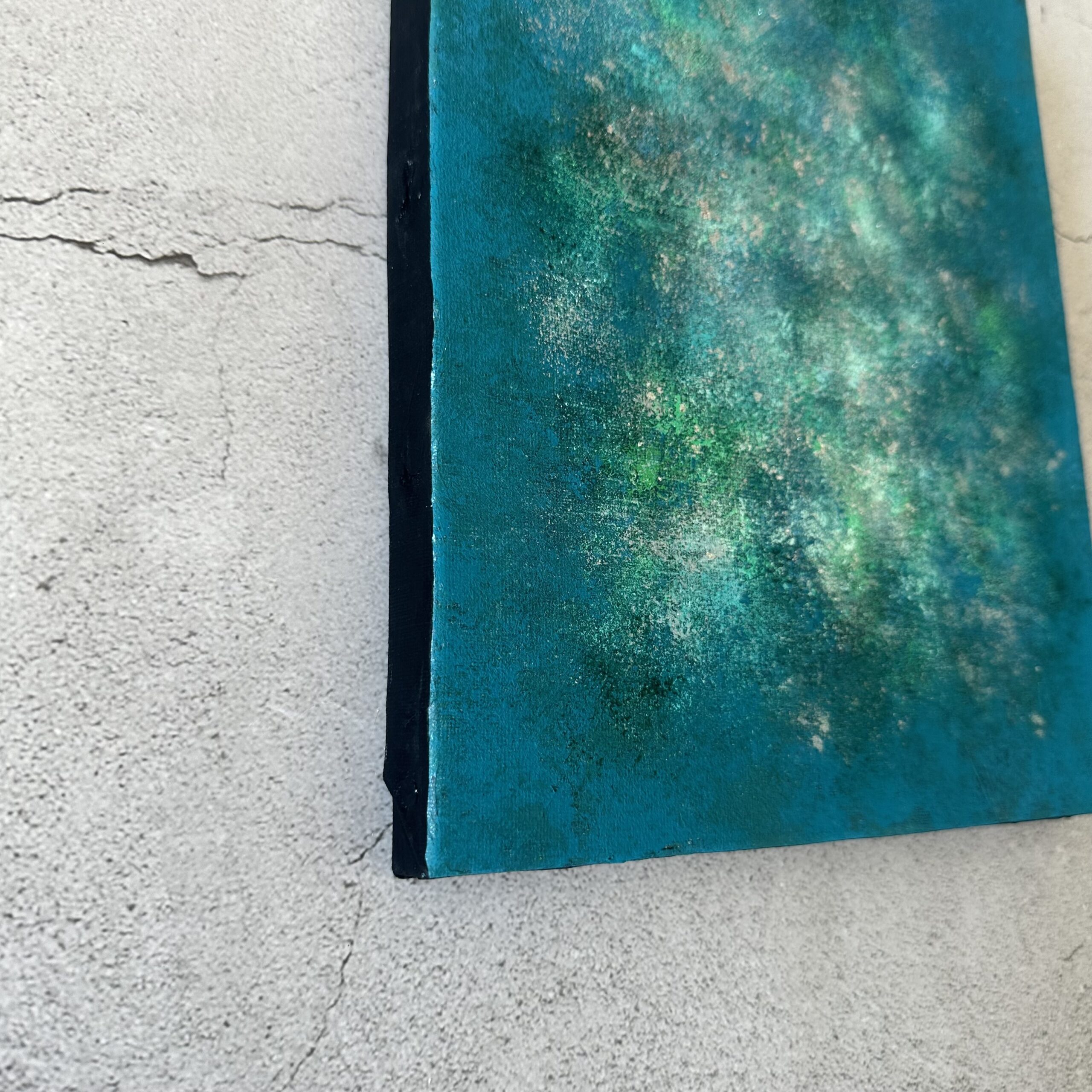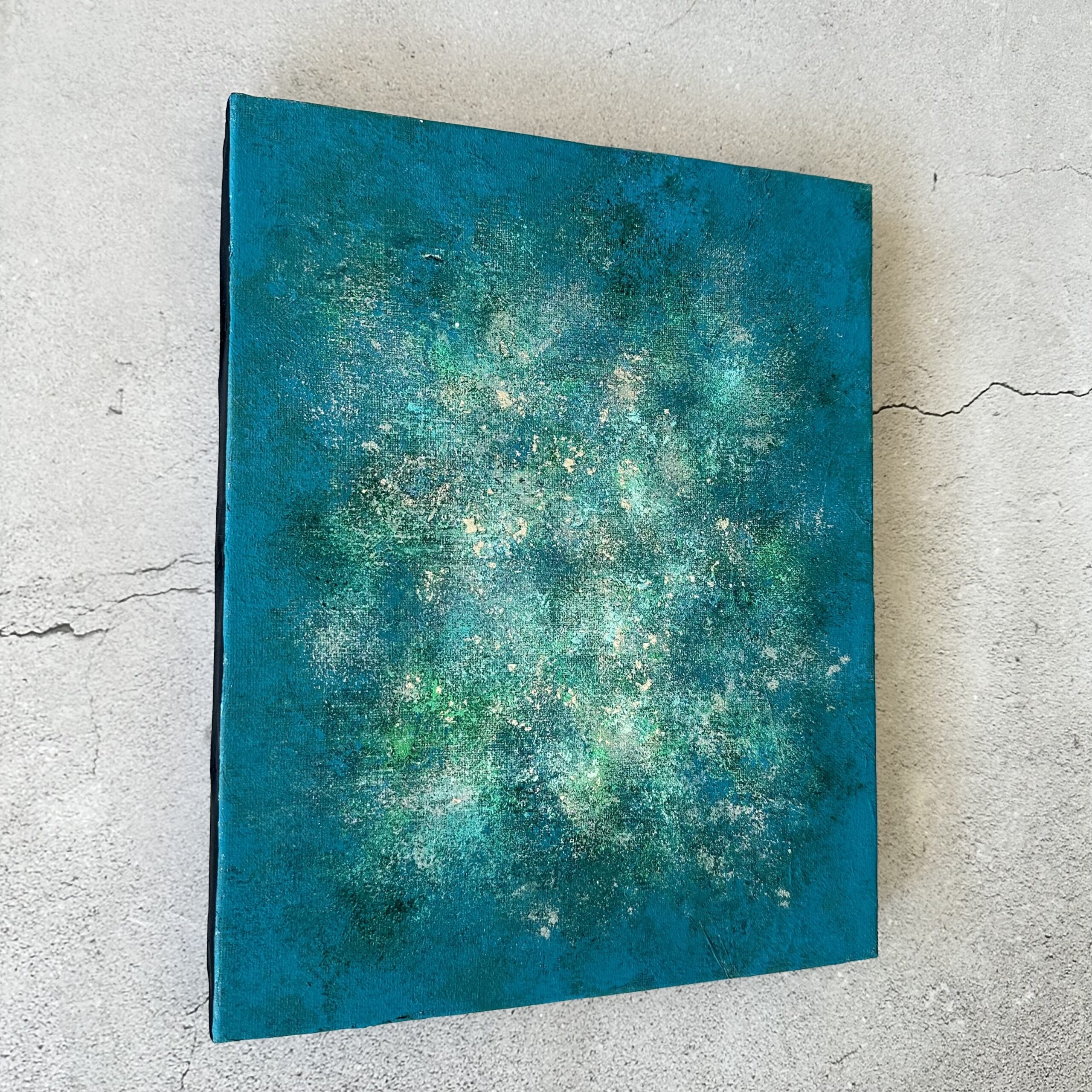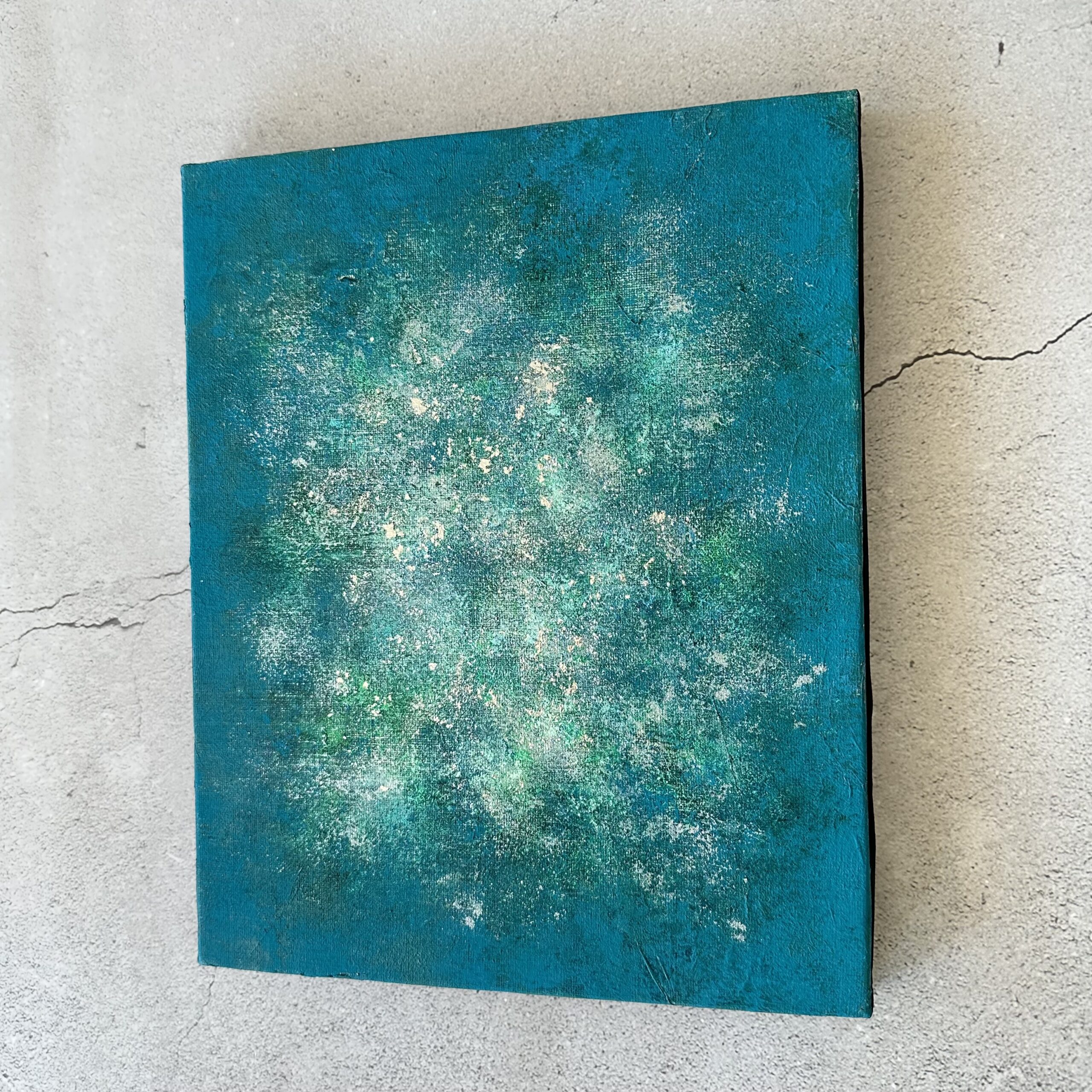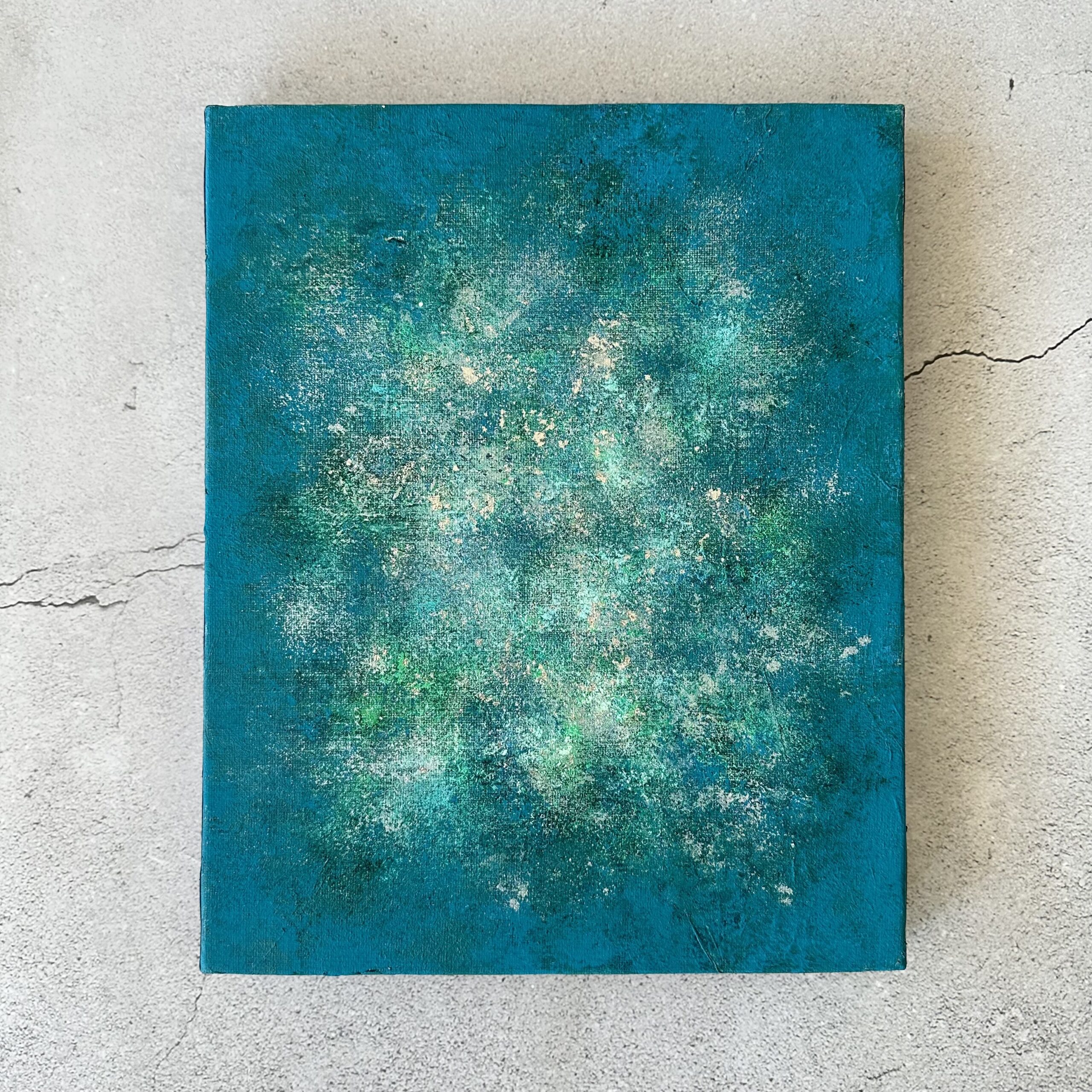 下地にシルバー箔を使用していますので、絵の具の合間に見え隠れするシルバーが奥行きのある雰囲気をだしています。