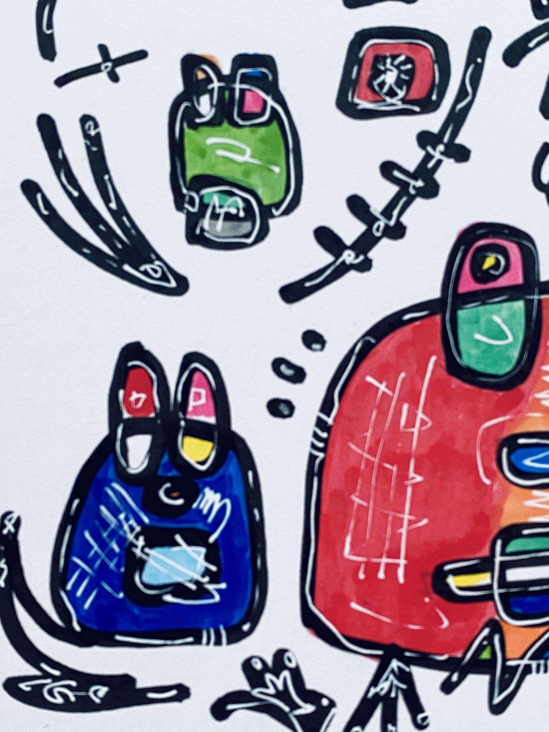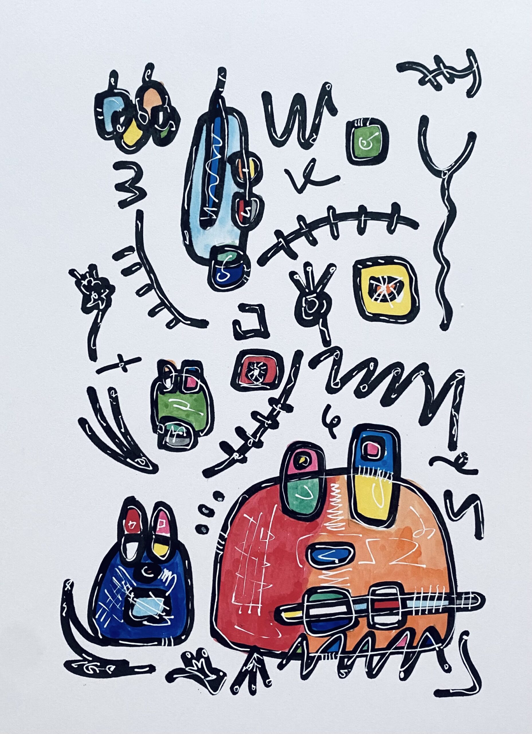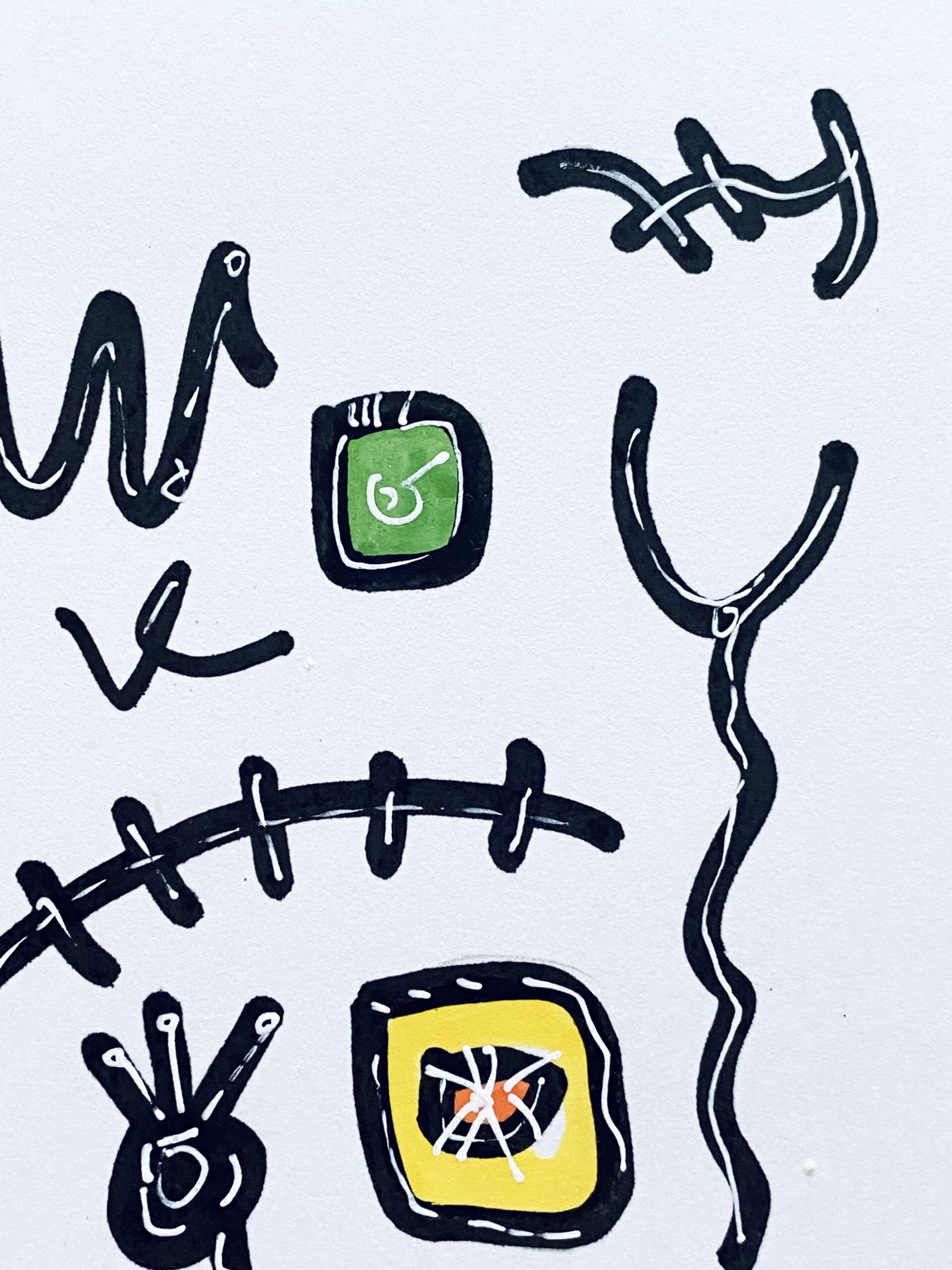 2008年 浮かんだイメージを付箋にボールペンでスケッチ。2012年になりそれをまとめたものを知人に見せたところサイズや画材をかえて絵画として発表することを勧められ、2013年、公募展にA4サイズのカードボードにペン・パステルで描いた作品を出品。その後アクリル絵具での創作をスタート。