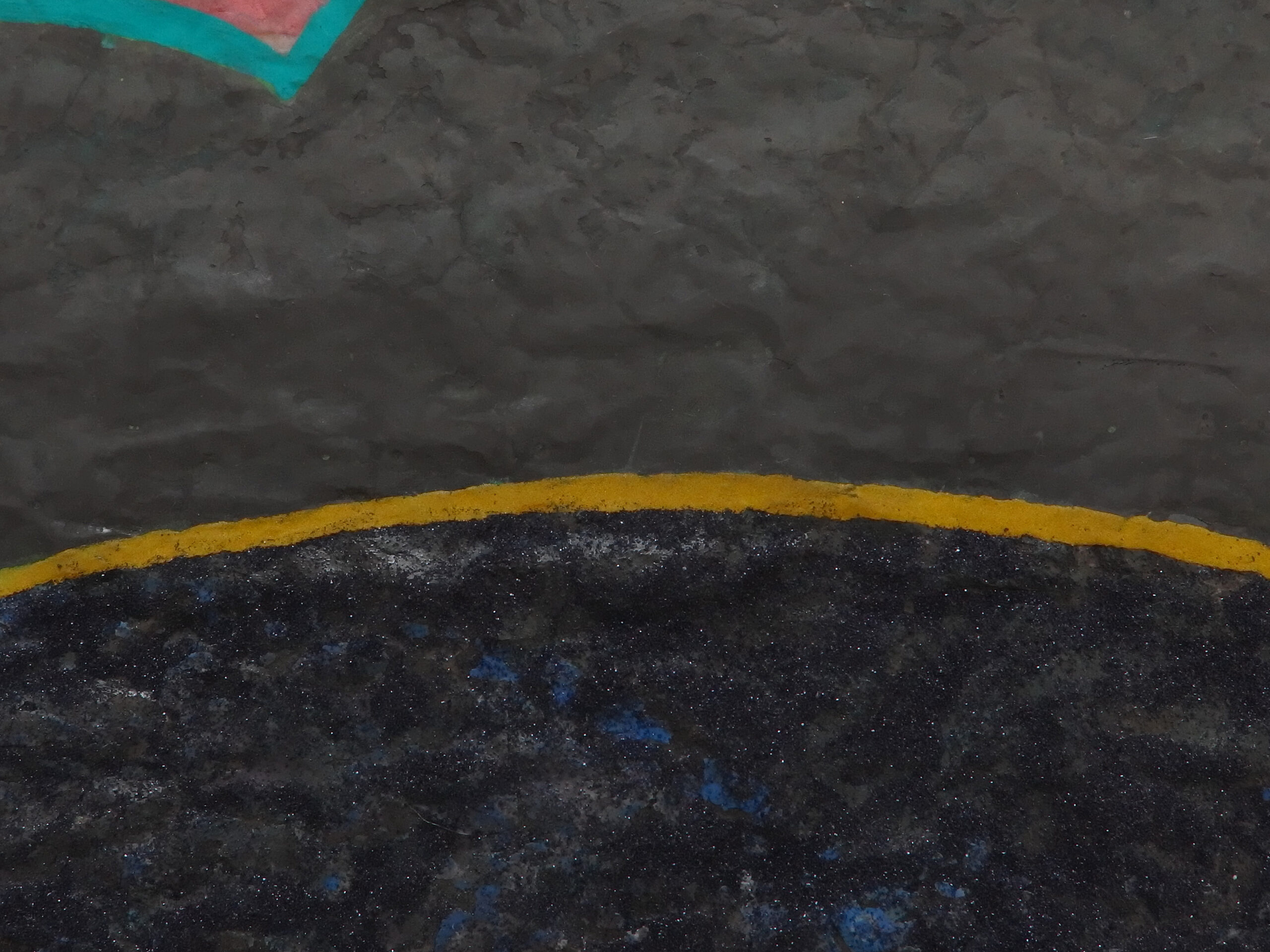 天然素材の和紙に膠を使うのが「日本画」の常識ですが、あえて人工素材を使っています。