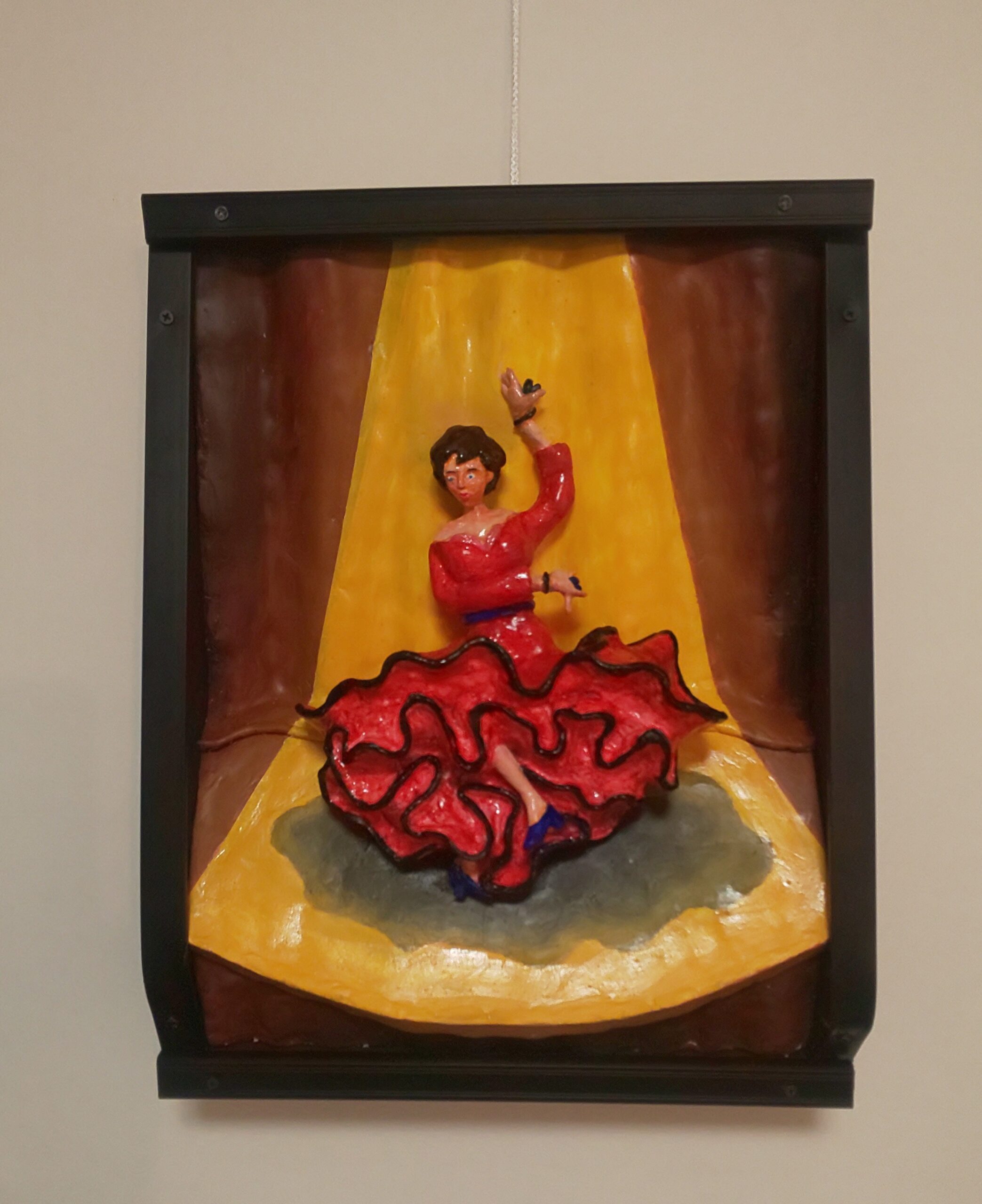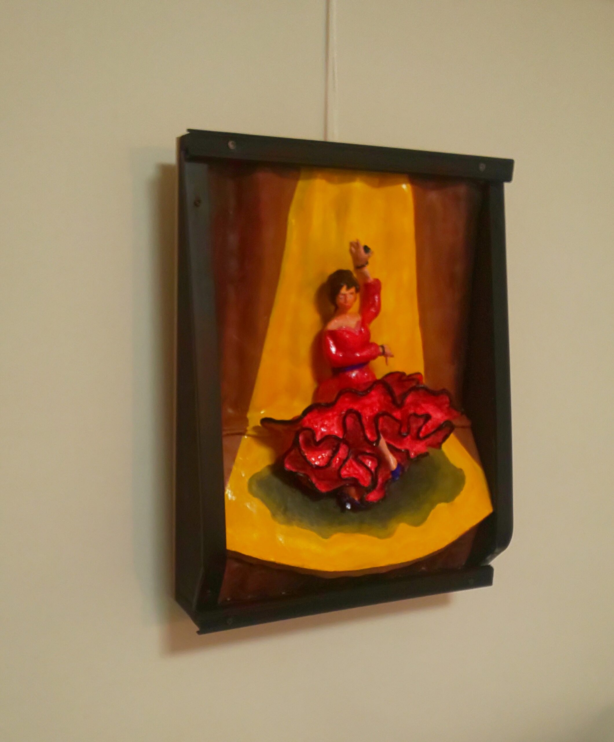 作品はスポットライトを浴びたフラメンコの舞台。衣装は縞状のフリルの衣装で、炎のような踊る激しさが伝わります。スペインの伝統的な楽器カスタネットに合わせて踊ってます。フラメンコを飾れば、暗い気持ちも華やかに晴れます。