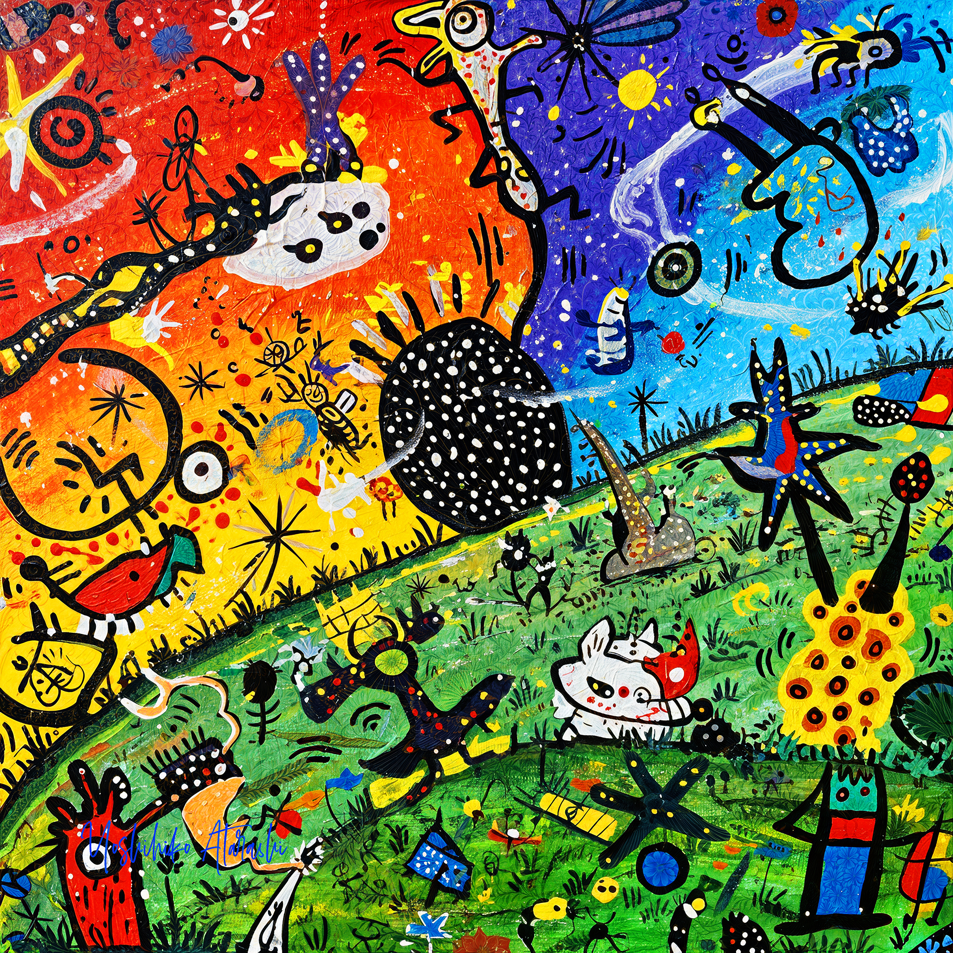 この「Astral Dance」シリーズは、宇宙と精神の自由な融合をテーマに制作しました。抽象的な線と鮮やかな色彩で、夢や記憶の断片が舞い踊る様子を描いています。シュルレアリスムとプリミティブアートの技法を取り入れ、無意識の中の生命のリズムや、目に見えない感情の流れを可視化することを試みました。一枚一枚に、子どものような好奇心と宇宙への畏敬の念を込めています。