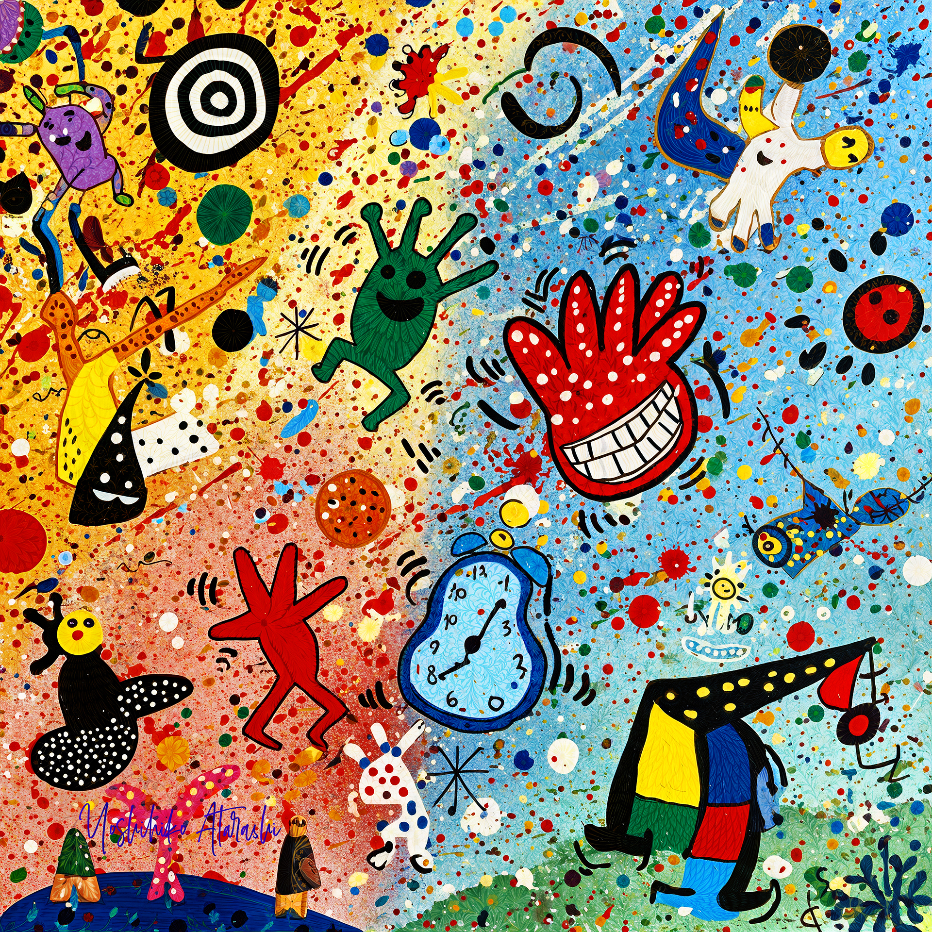 この「Astral Dance」シリーズは、宇宙と精神の自由な融合をテーマに制作しました。抽象的な線と鮮やかな色彩で、夢や記憶の断片が舞い踊る様子を描いています。シュルレアリスムとプリミティブアートの技法を取り入れ、無意識の中の生命のリズムや、目に見えない感情の流れを可視化することを試みました。一枚一枚に、子どものような好奇心と宇宙への畏敬の念を込めています。