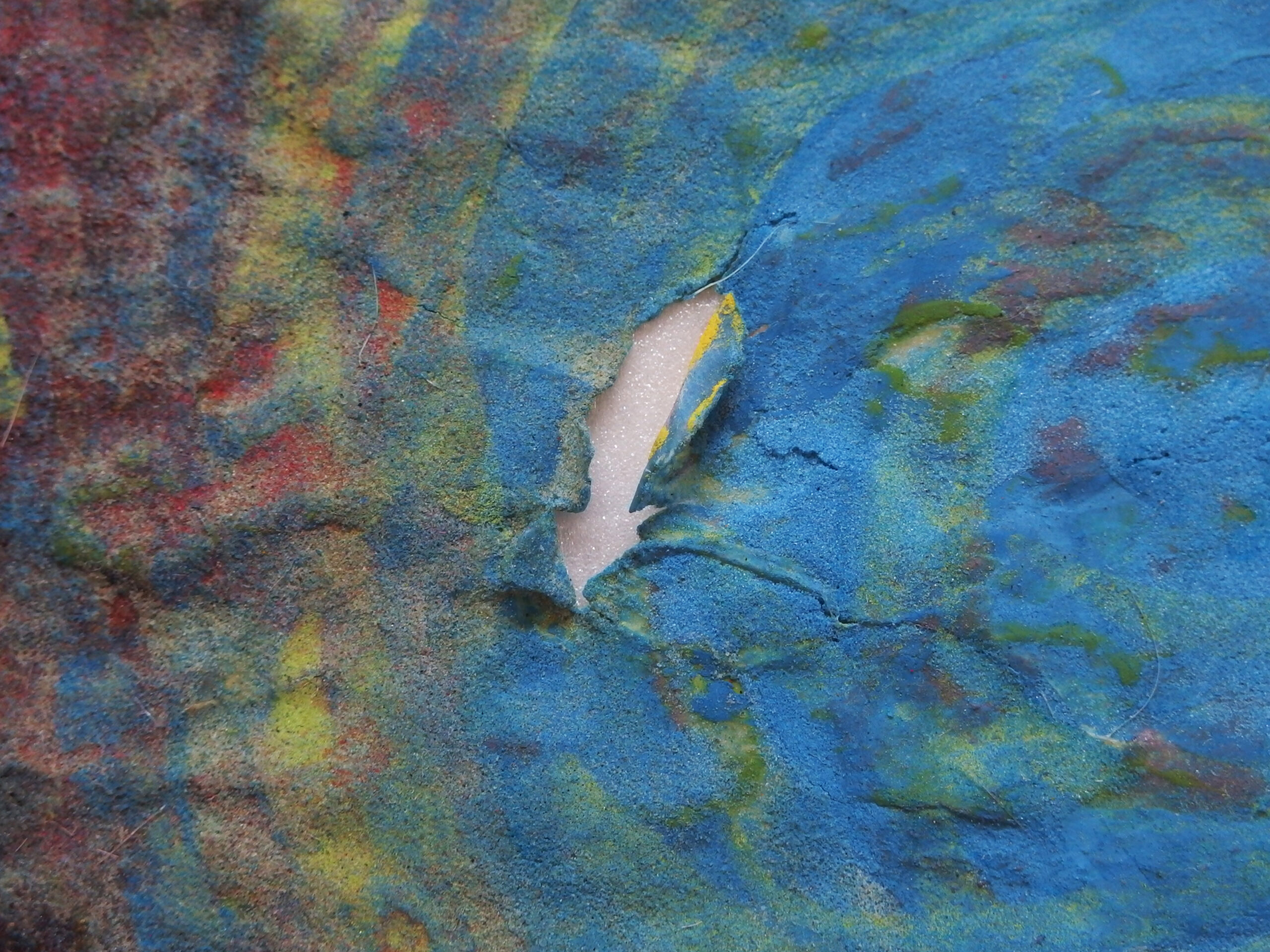 天然素材の和紙に膠を使うのが「日本画」の常識ですが、あえて人工素材を使っています。