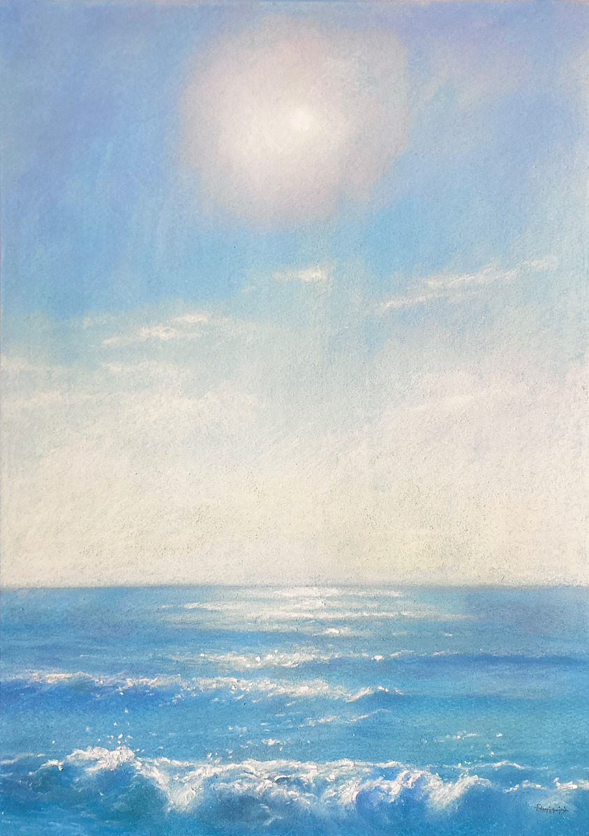 無駄なものを排除した、自然の美だけを味わえた景色でした。午前の海の風景です。この日は快晴で、太陽の暖かさを直に感じることができました。太陽の眩しさ、海の輝きを表現した作品です。とても爽やかな作品です。鮮やかでも派手すぎず、綺麗な青色をだせた思います。F4号に近いサイズですので飾りやすいと思います。お部屋のアクセントにもちょうど良いですし、作品を目立たせたい場合は額装時にマット台紙と大きめの額を使用することもできます。