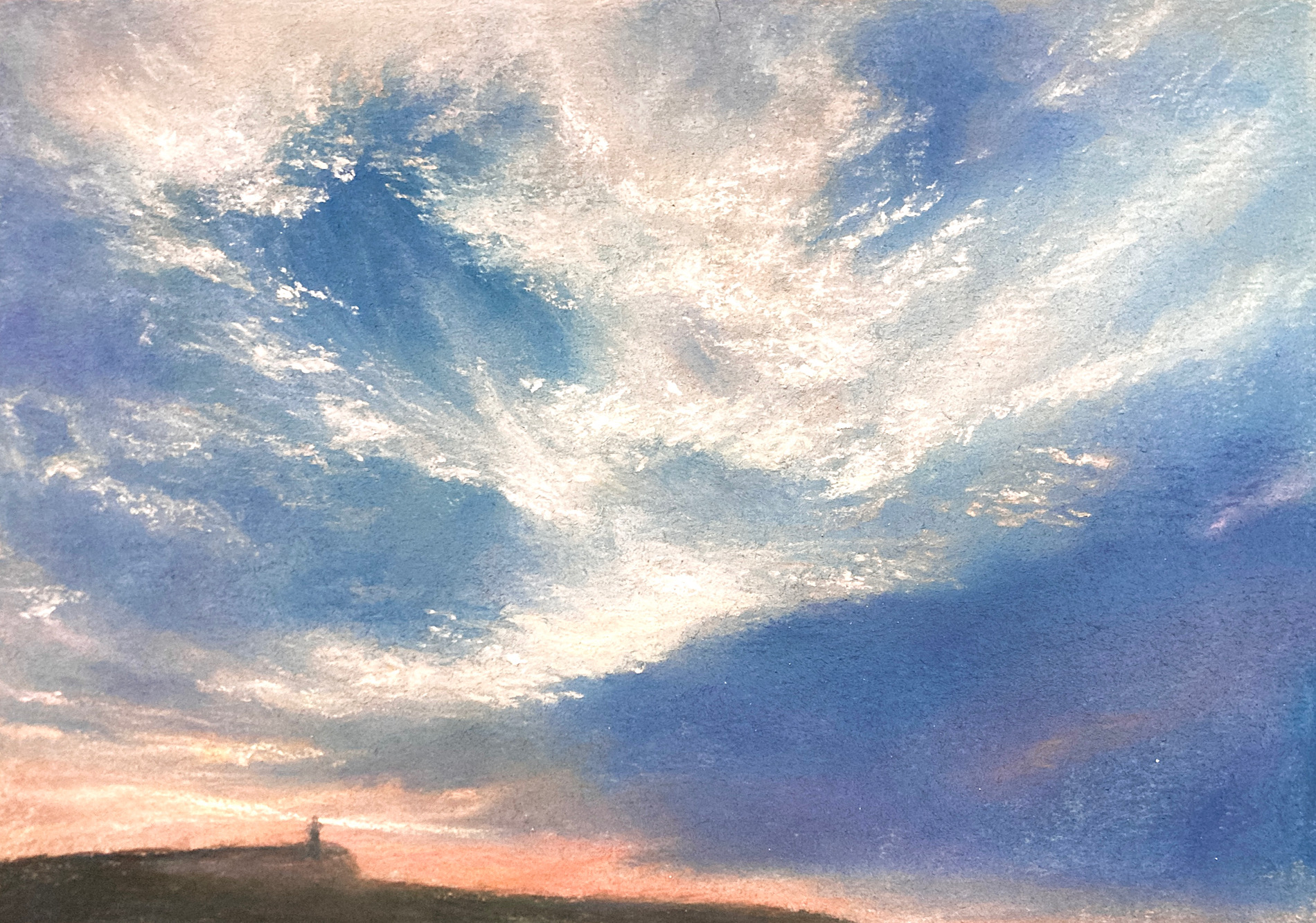 細部まで丁寧に描き込みました。灯台が佇む夕方の風景のワンシーンを描きました。大空の雄大さや輝かしさを感じていただければと思います。