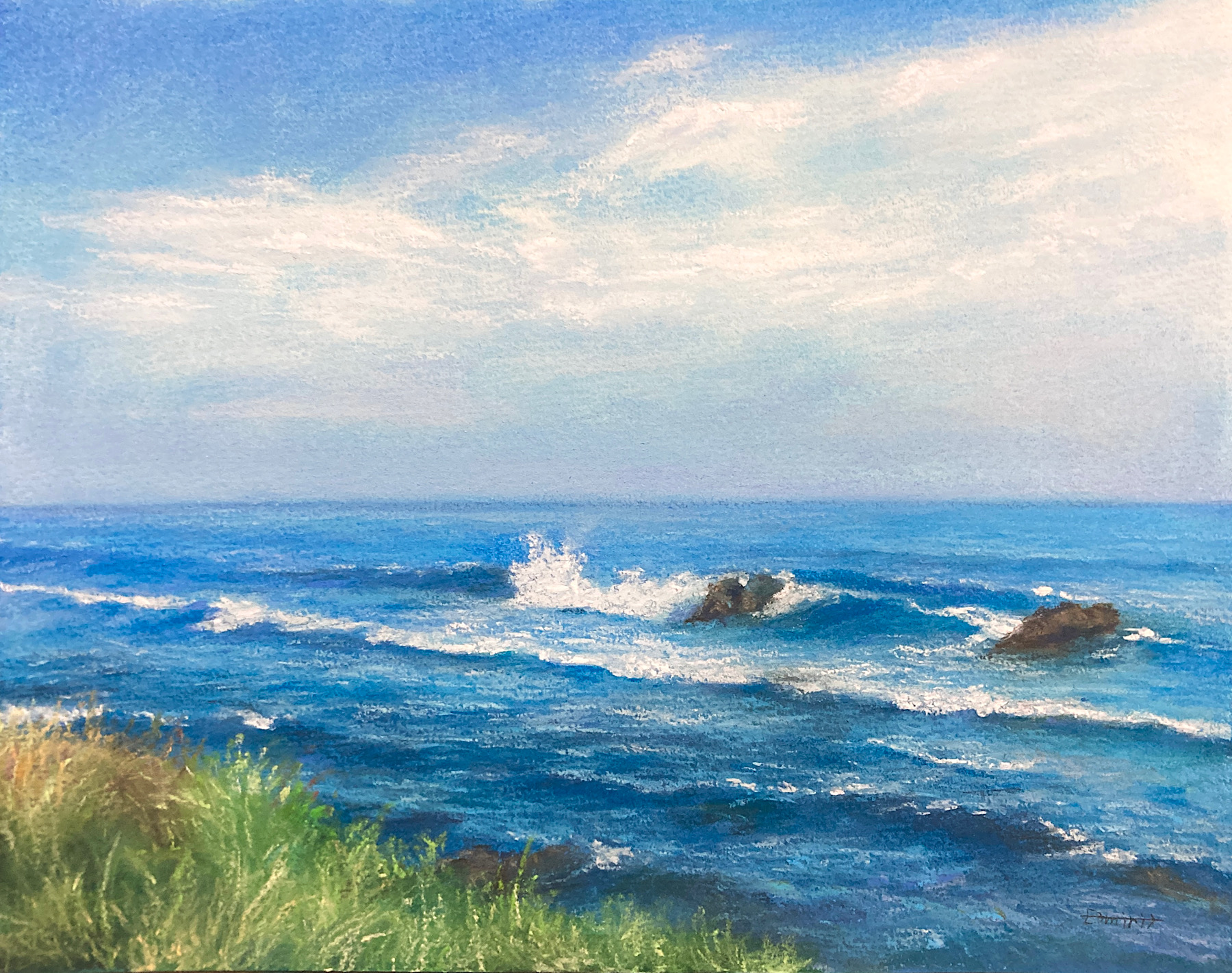 茨城の海岸から。太平洋を一望できる海岸です。7月に訪れた時の風景で、草木が生える断崖から美しい空と海を贅沢に堪能させていただきました。空や海の広さを感じる開放感ある作品です。