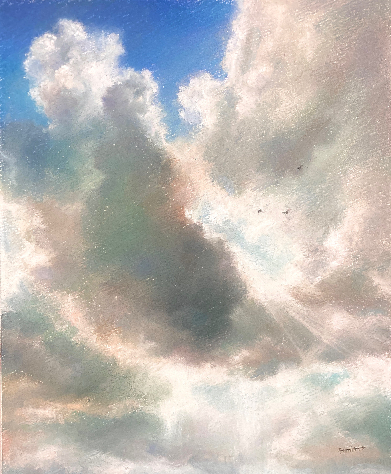 パステルの粉落ちを防止するためフィキサチーフがかけてありますが、表面にはできる限り触れないようご注意ください。直射日光、高音多湿を避けてください。