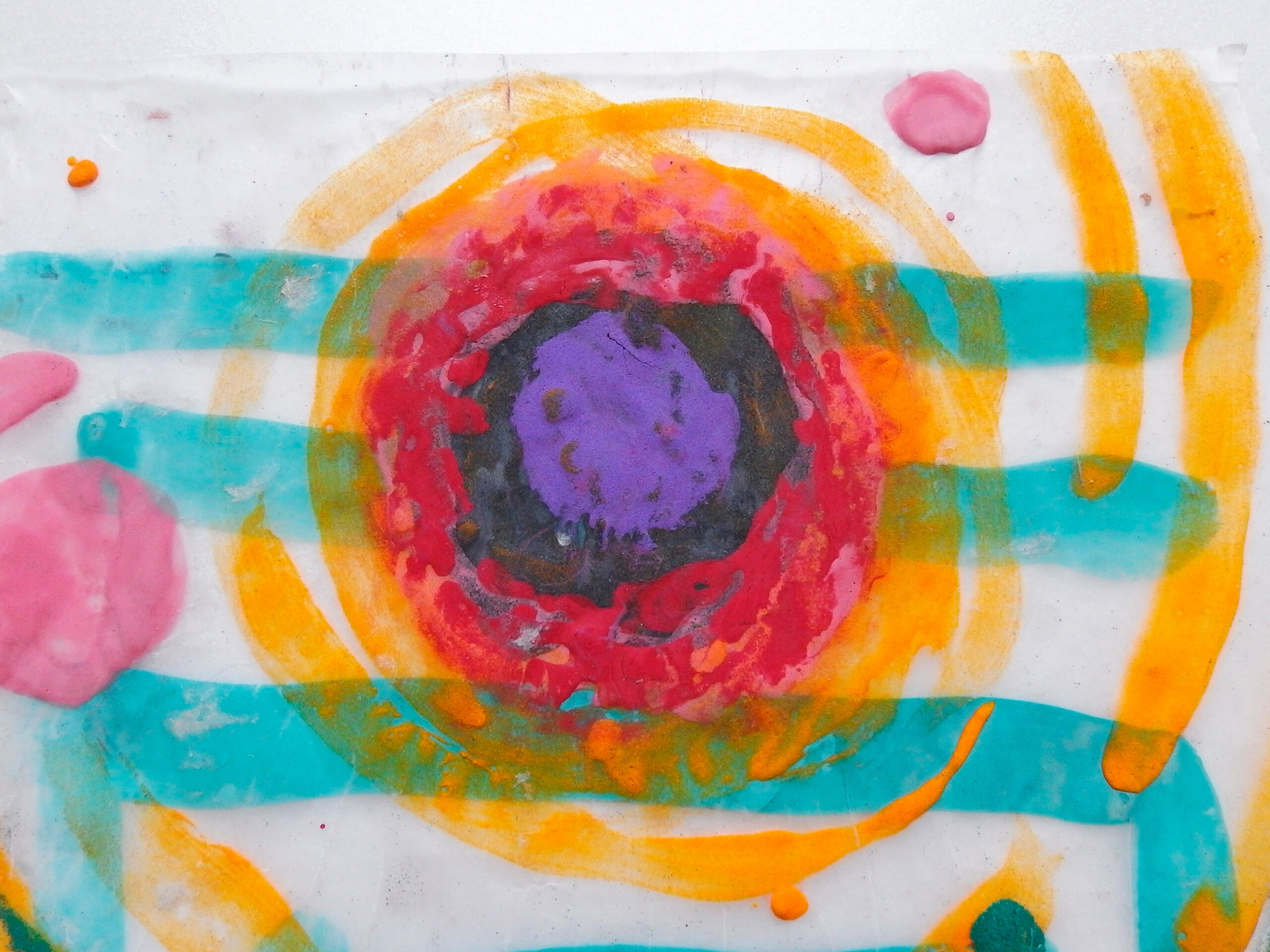 天然素材の和紙に膠を使うのが「日本画」の常識ですが、あえて人工素材を使っています。