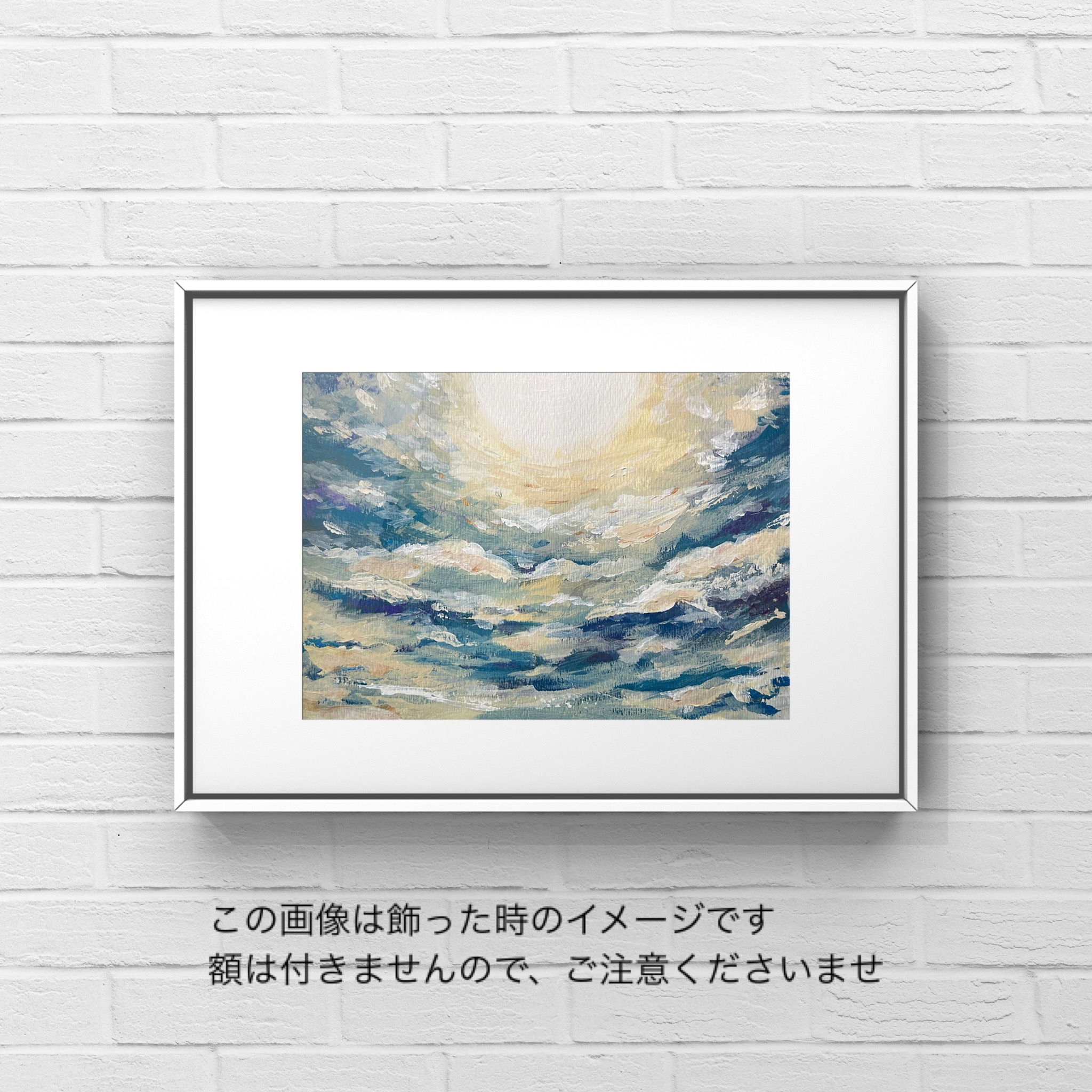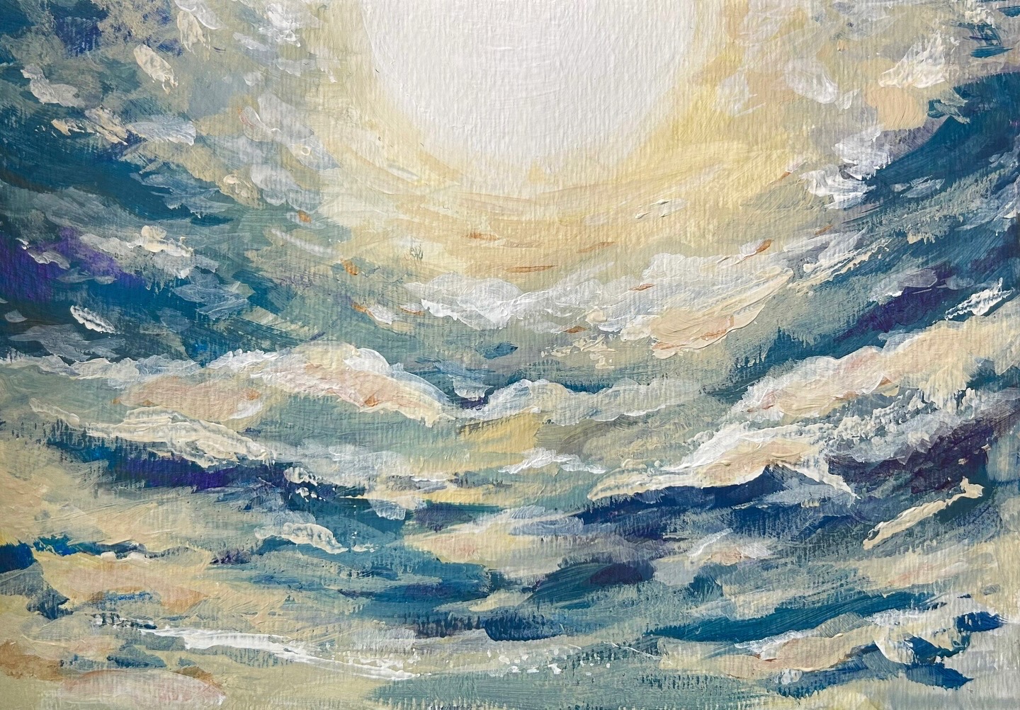 太陽が雲の合間から出てくる様子を描きました。ターナーのU-35(アクリル)を使用し、仕上げにマットバーニッシュを塗布しております。