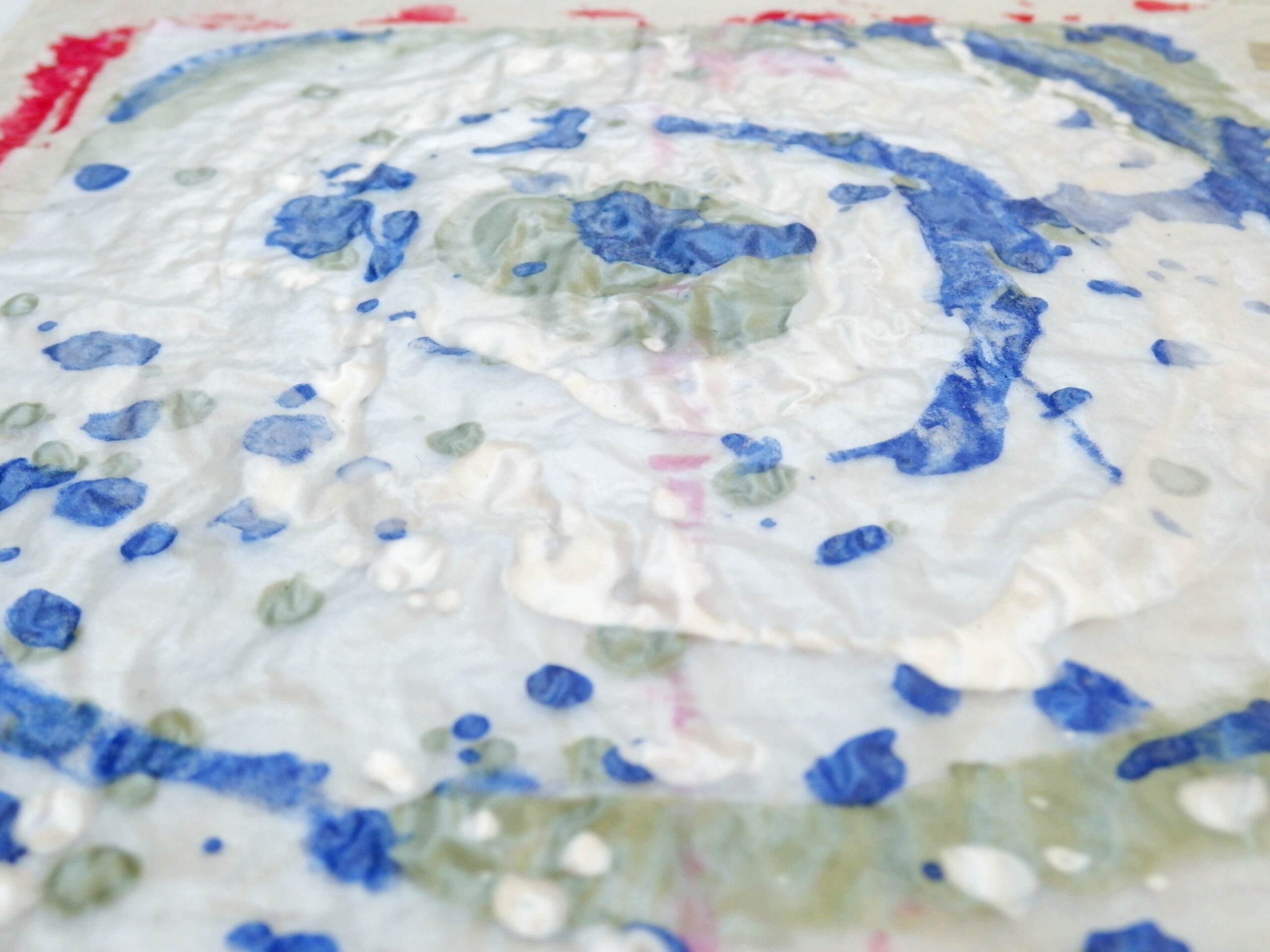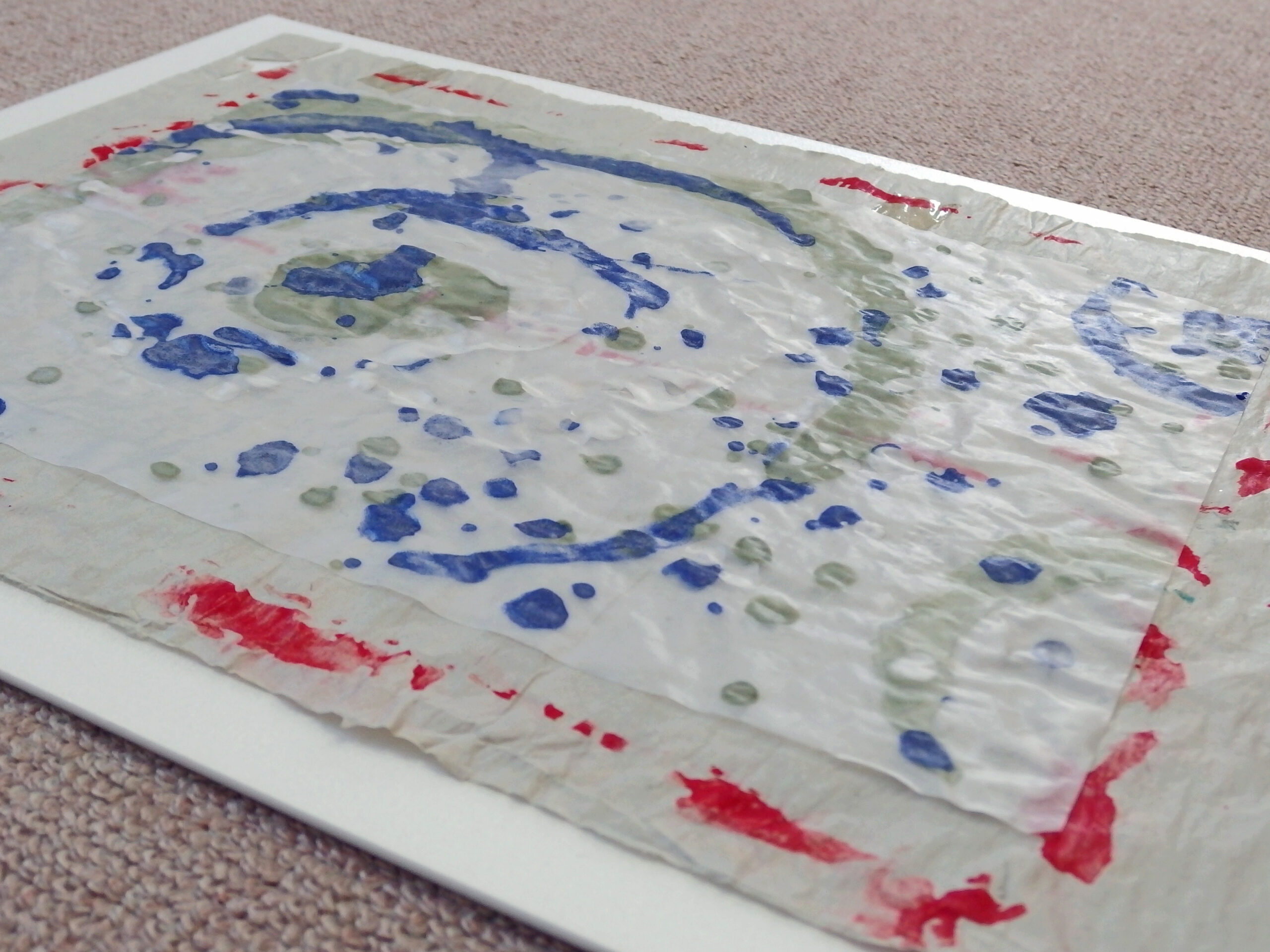 天然素材の和紙に膠を使うのが「日本画」の常識ですが、あえて人工素材を使っています。