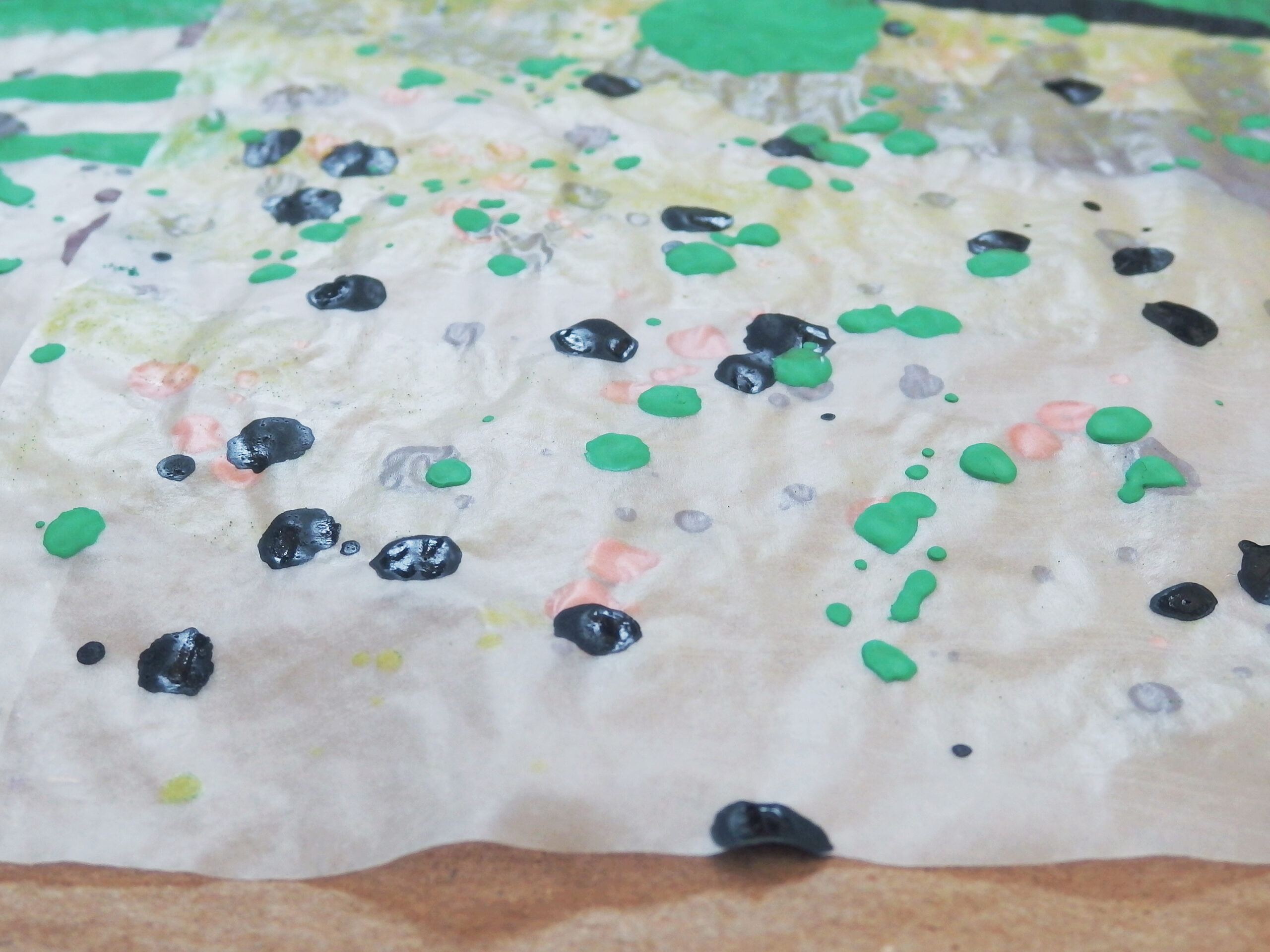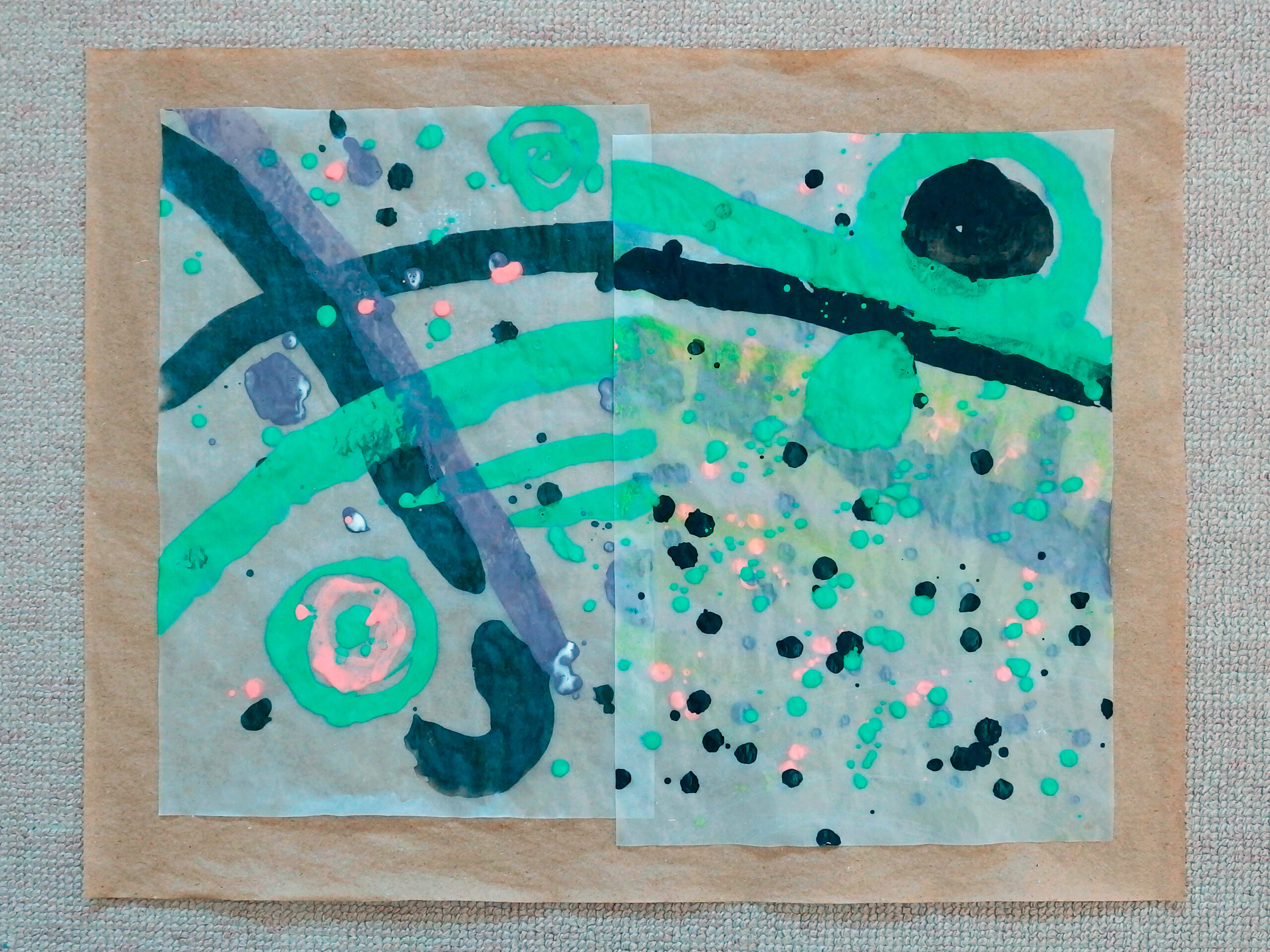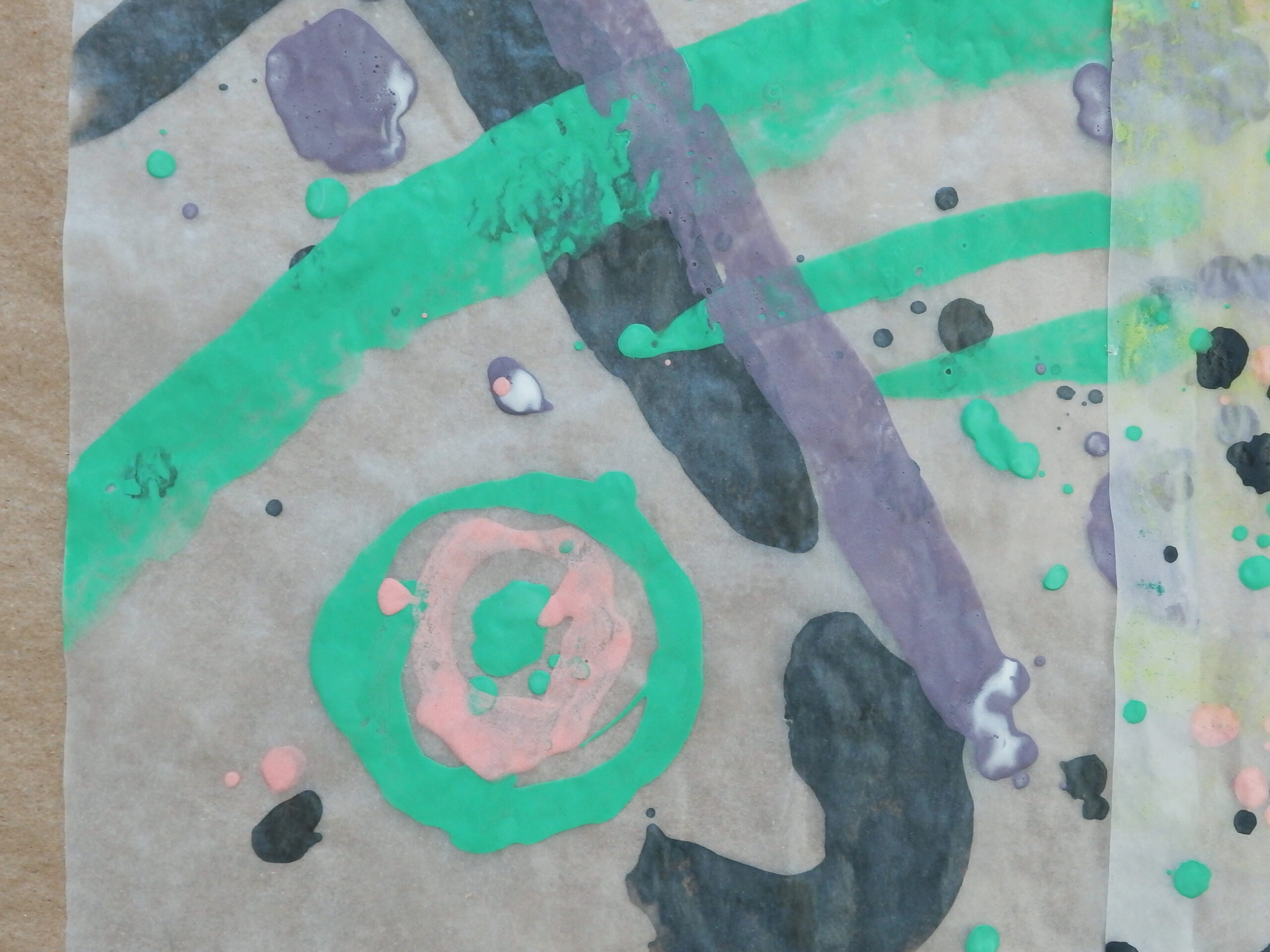天然素材の和紙に膠を使うのが「日本画」の常識ですが、あえて人工素材を使っています。