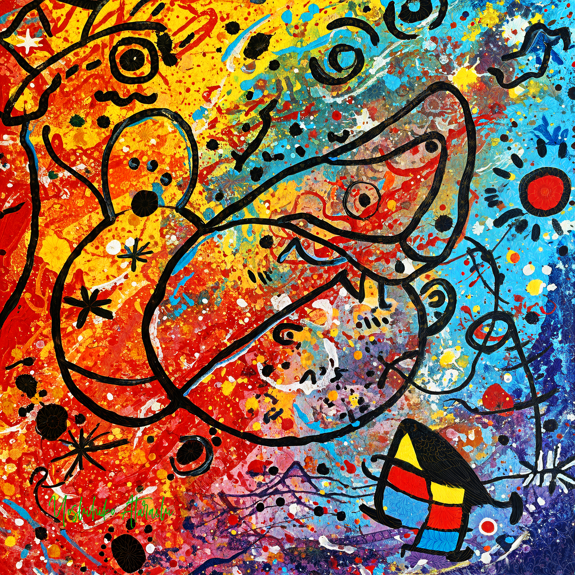 「Astral Dance」シリーズは、宇宙的エネルギーと遊び心が融合した鮮烈な抽象画です。複雑な色彩と形態が、鑑賞者の内なる感性を揺さぶります。連作展示では壁面にリズムを生み出し、空間全体が踊るような印象に。現代的インテリアにも映える力強い作品群です。