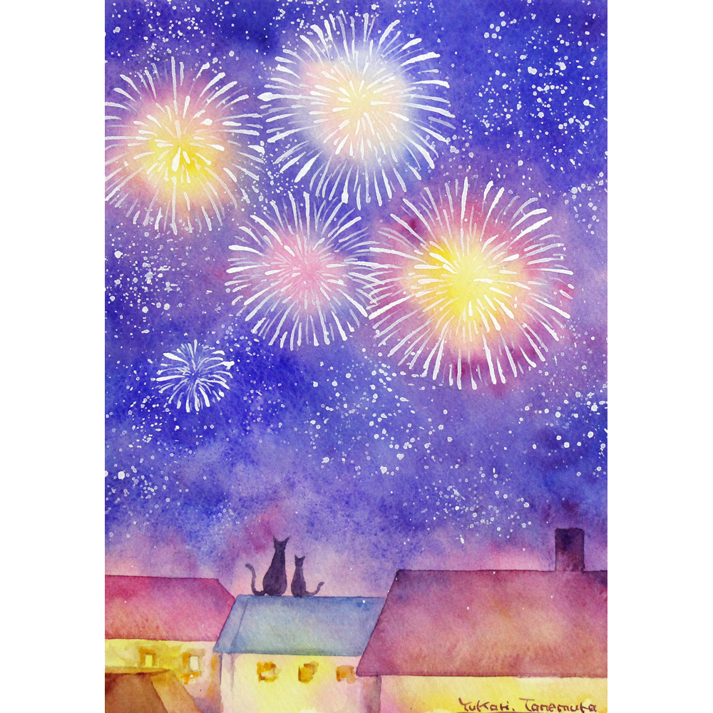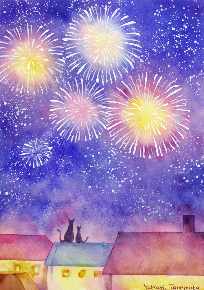 美しい花火が見える風景を水彩で表現しました。