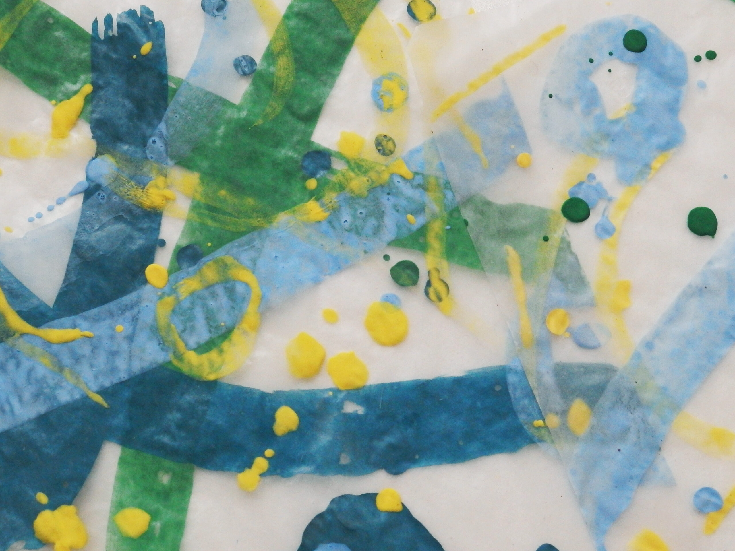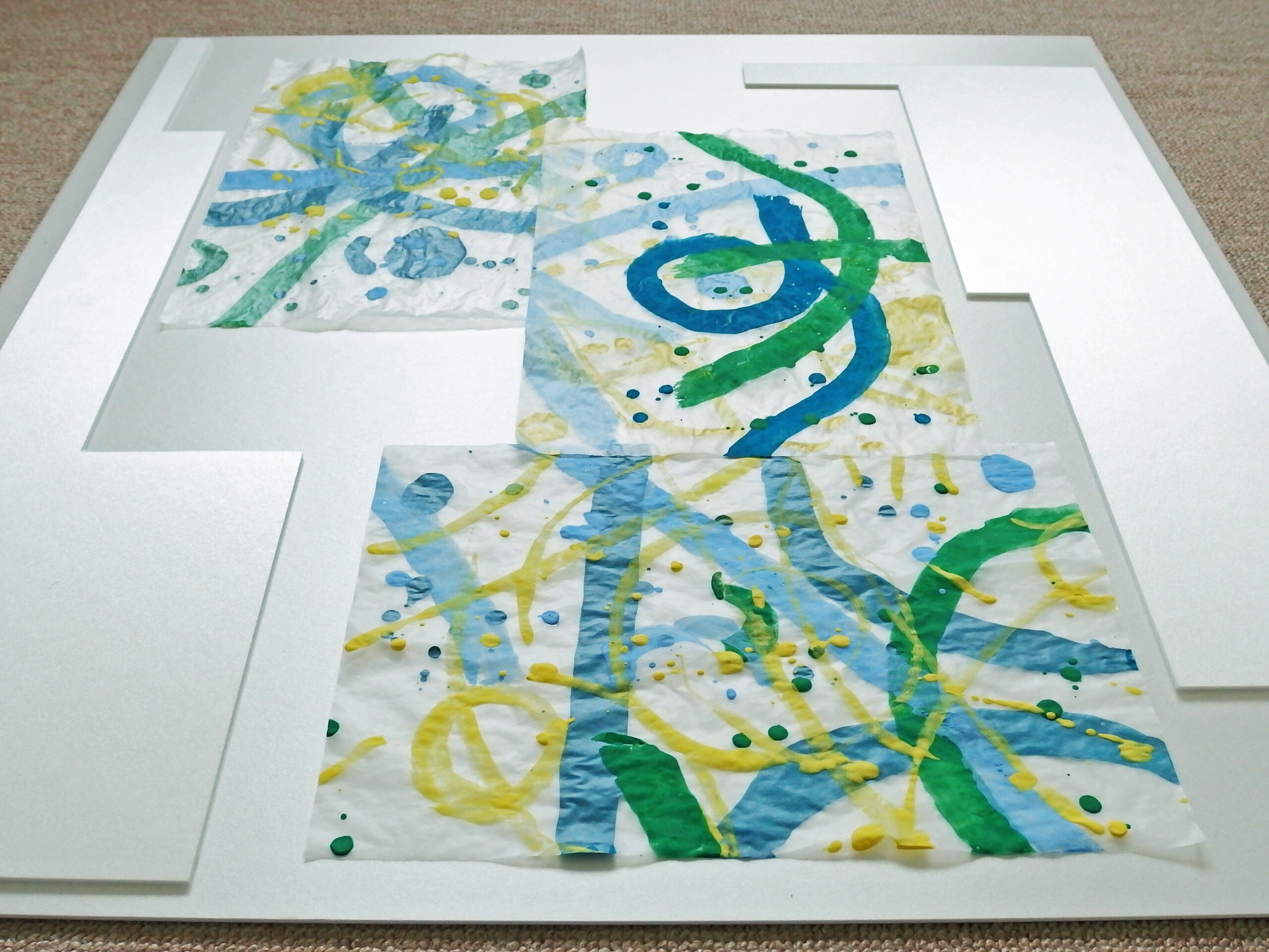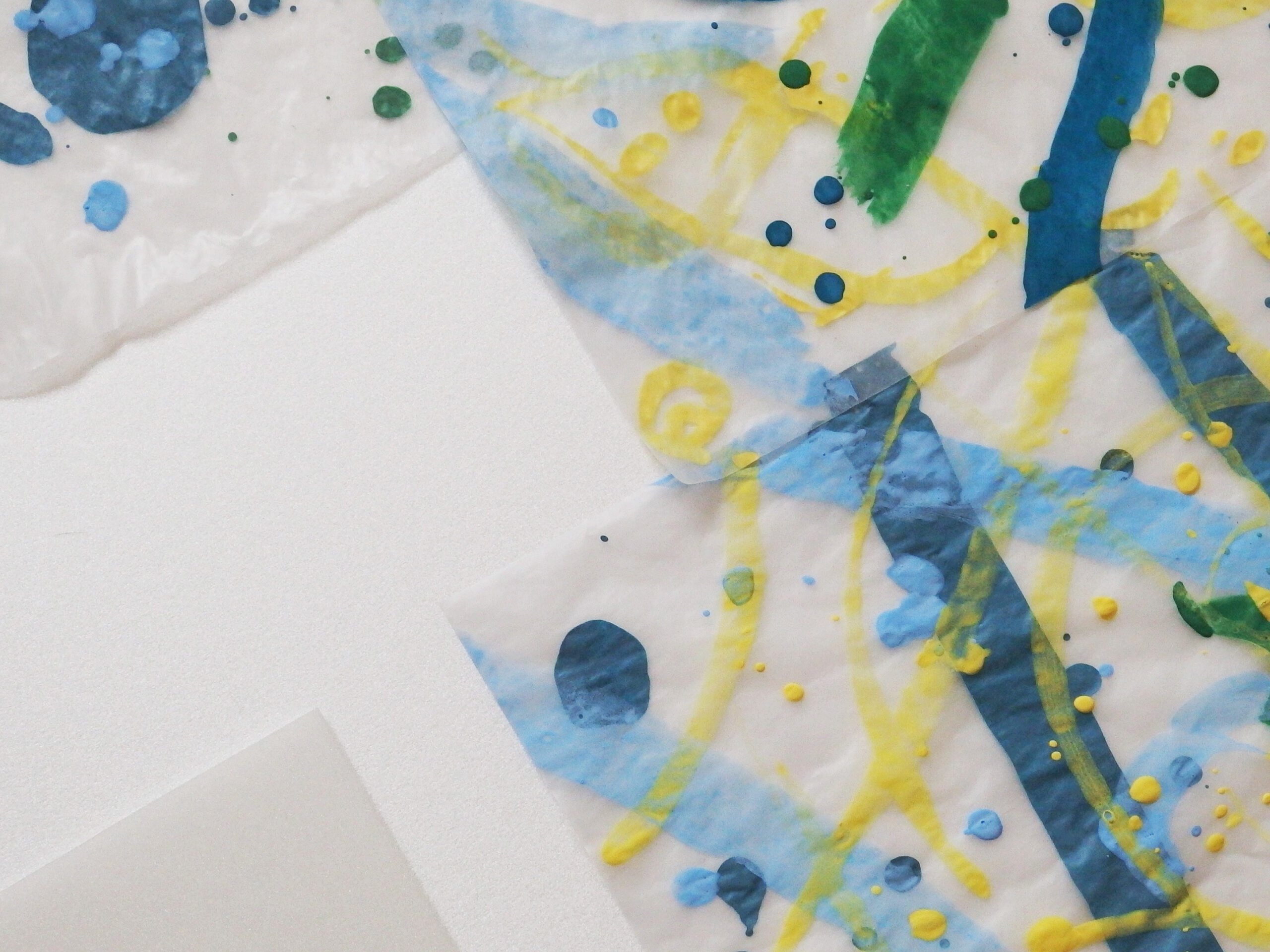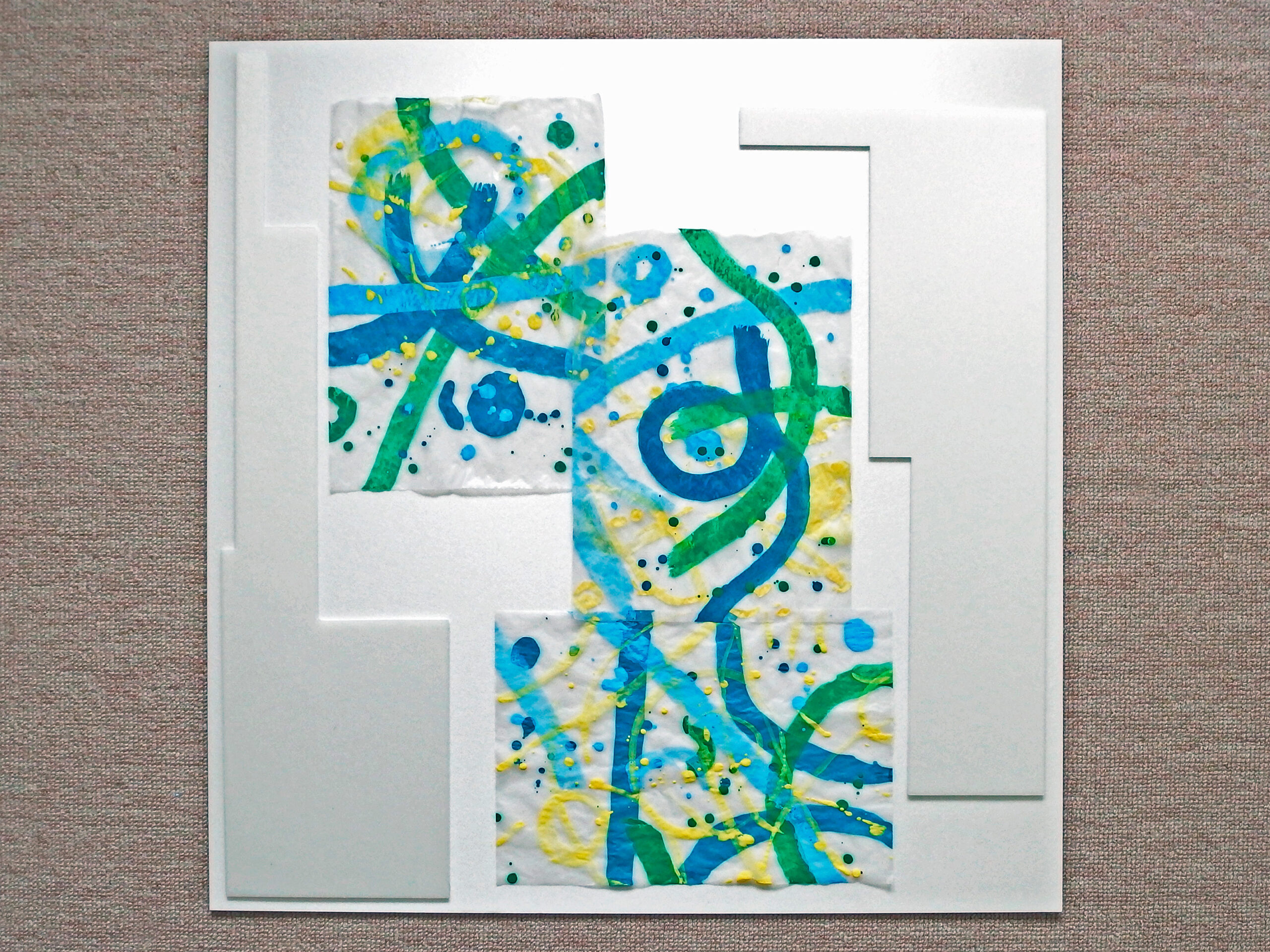 天然素材の和紙に膠を使うのが「日本画」の常識ですが、あえて人工素材を使っています。