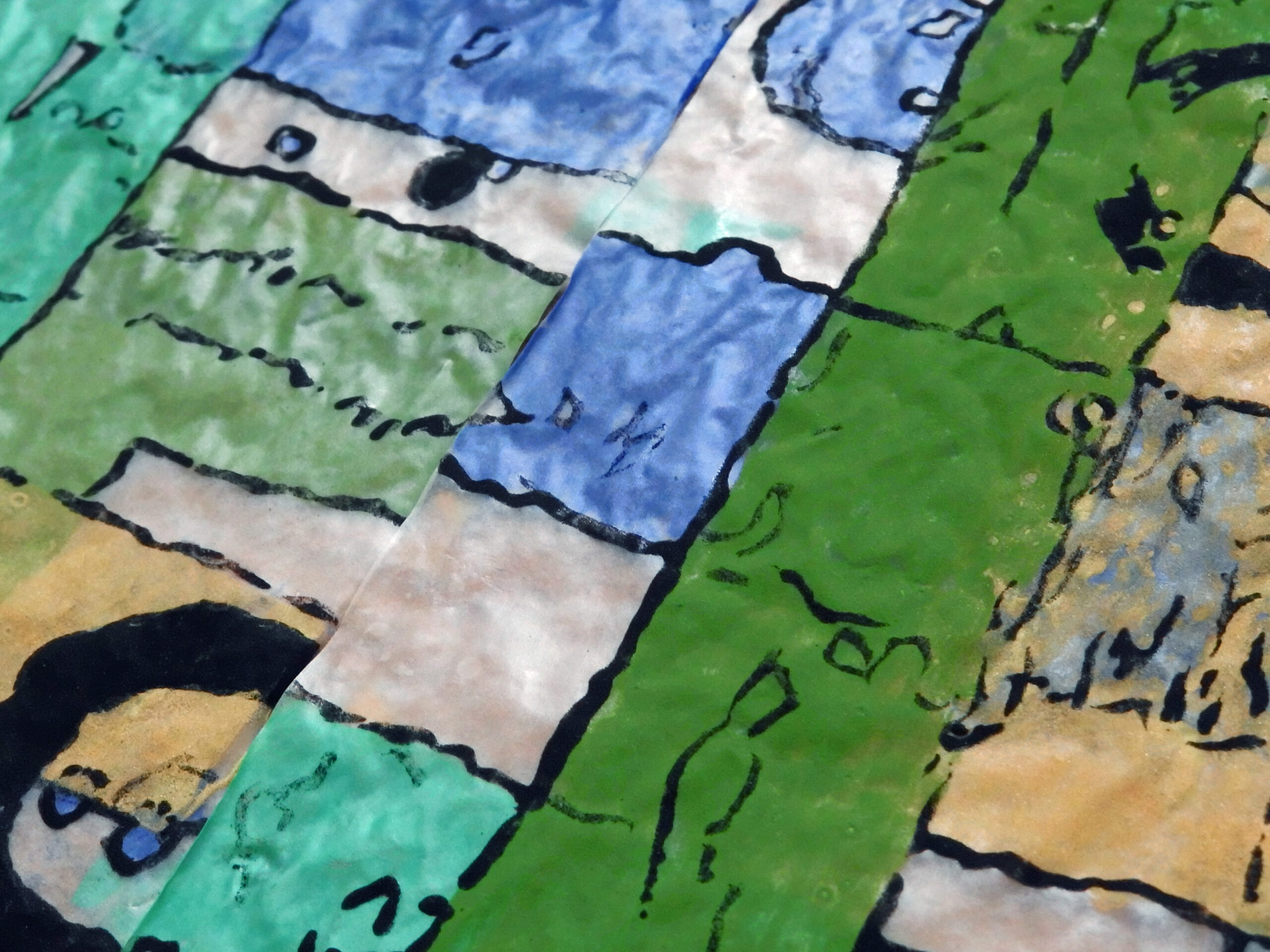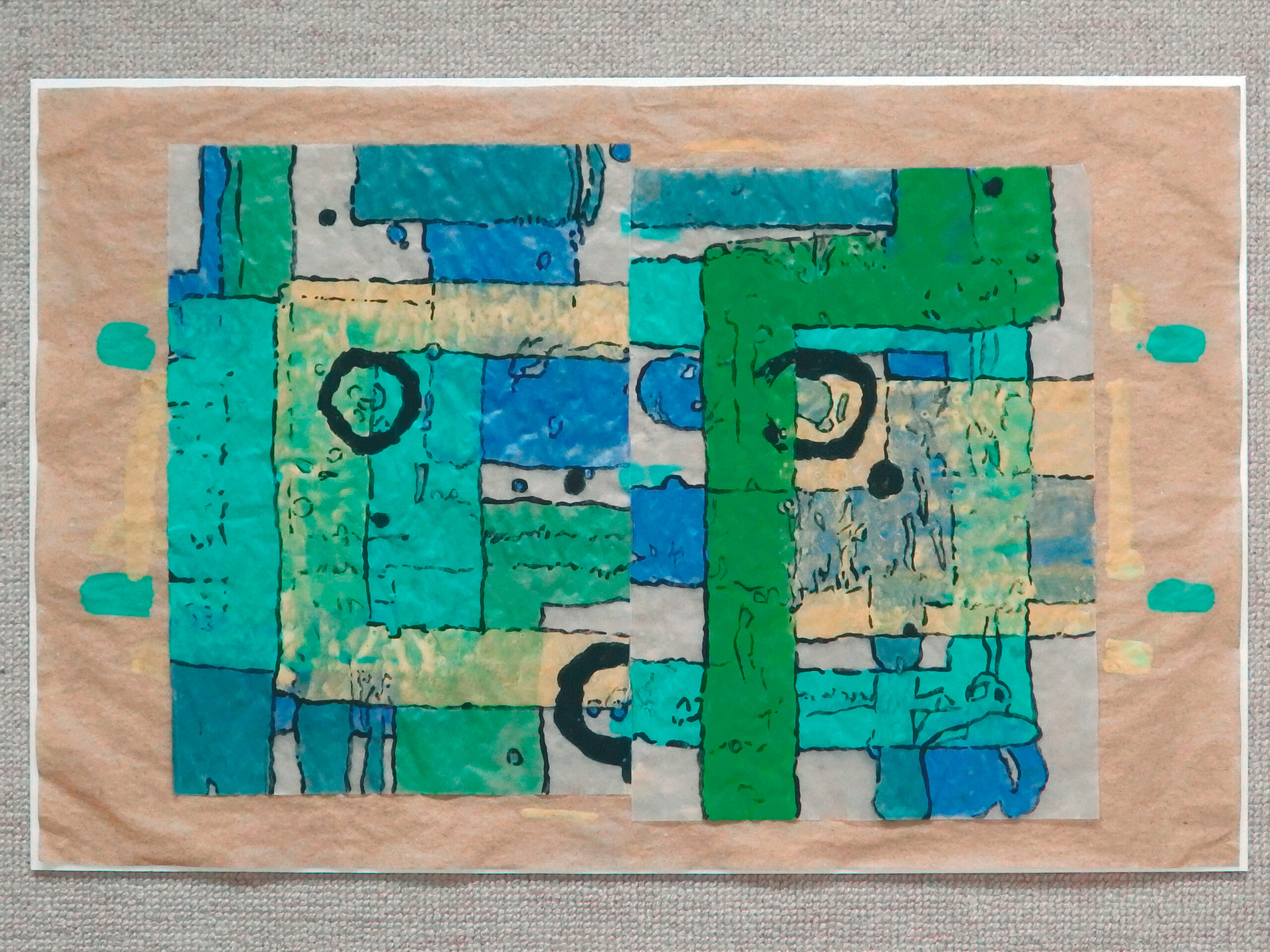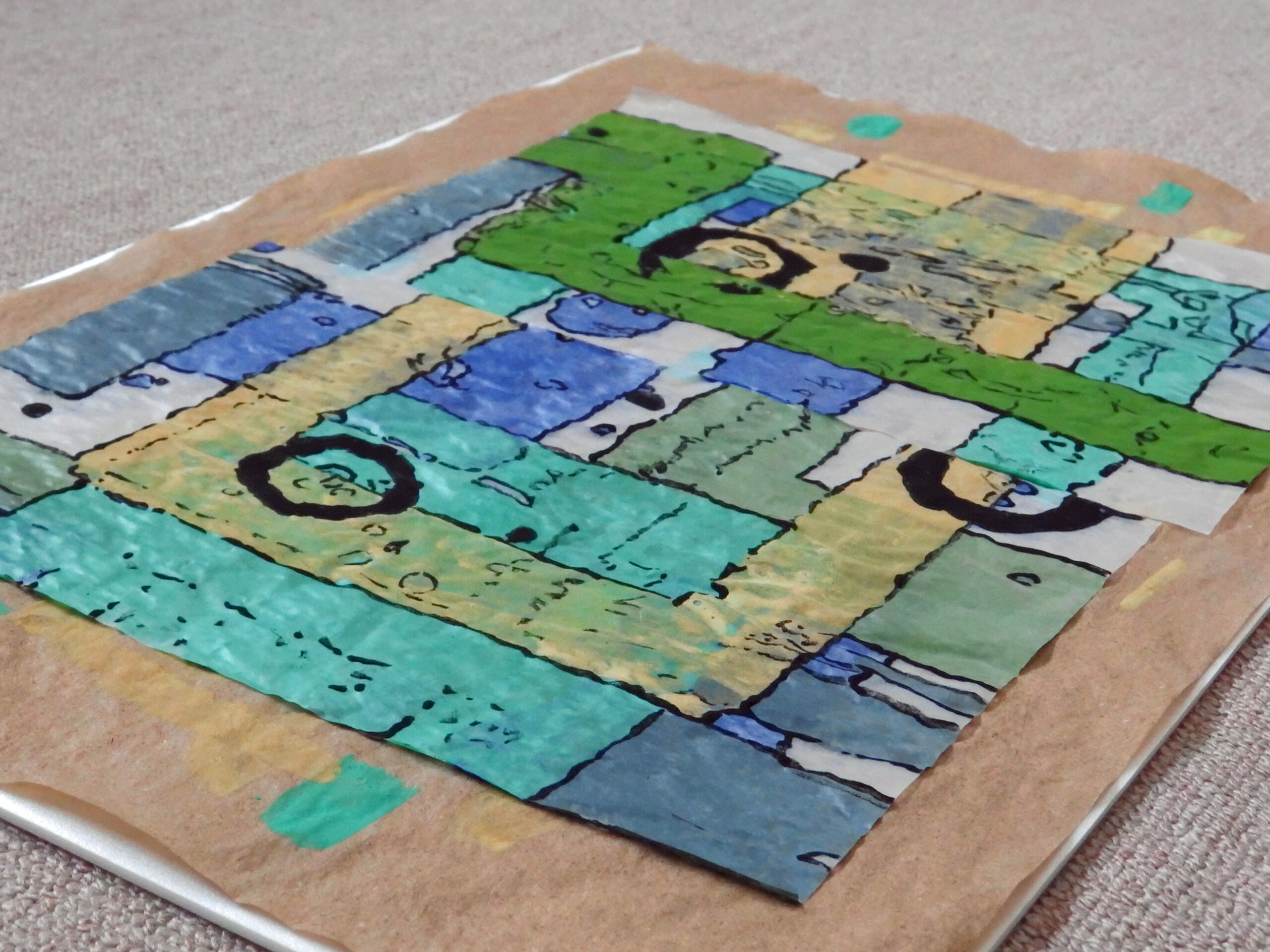 天然素材の和紙に膠を使うのが「日本画」の常識ですが、あえて人工素材を使っています。