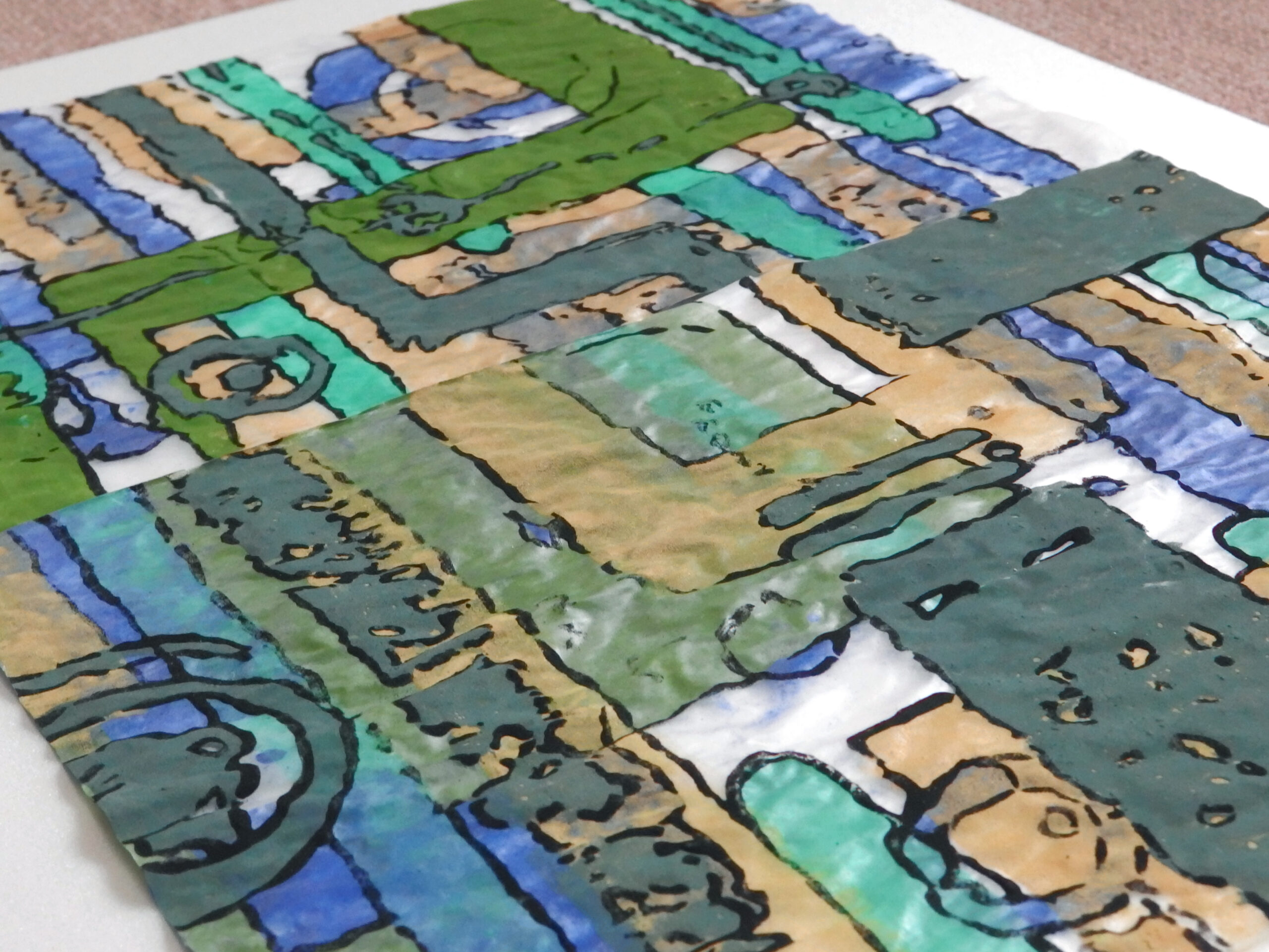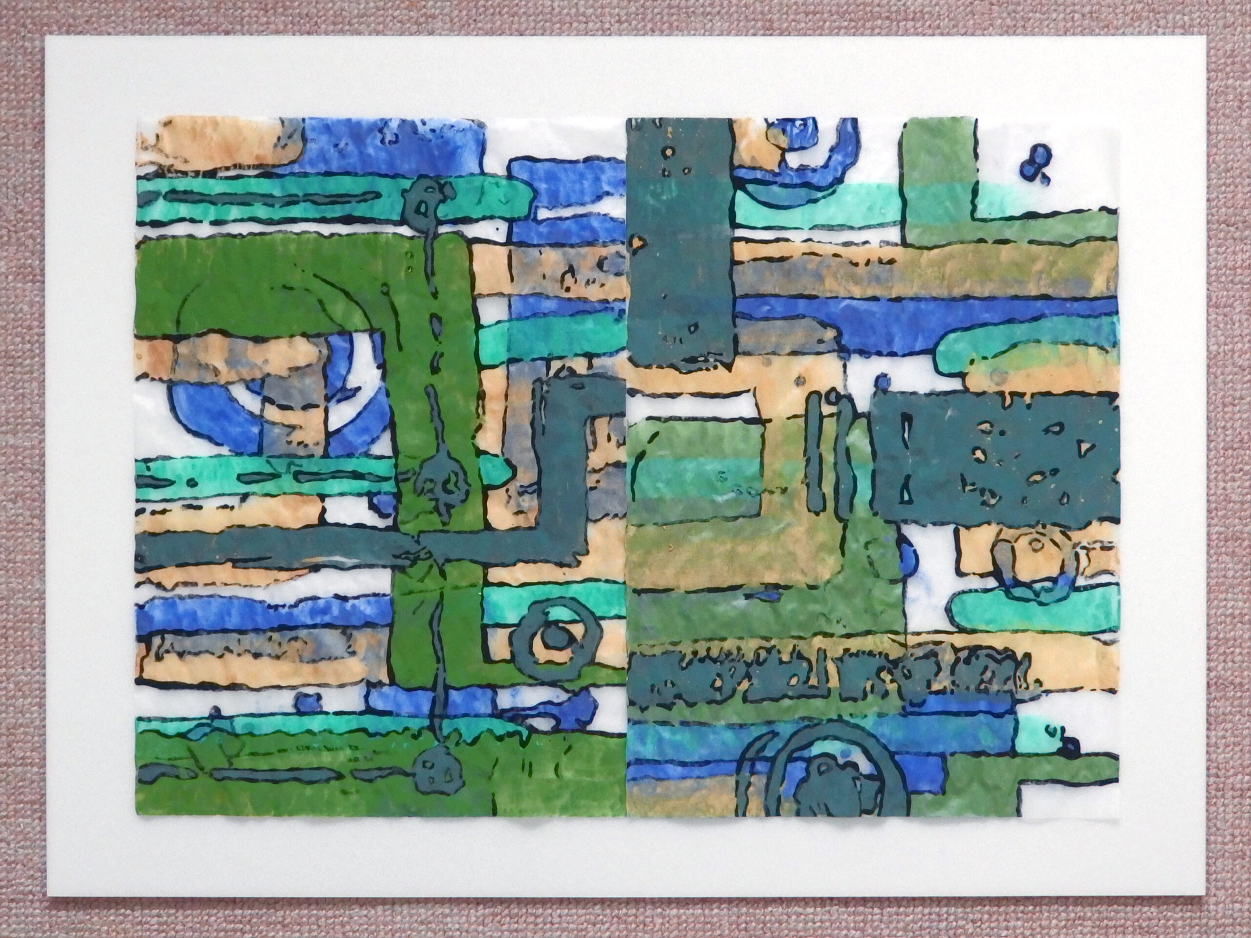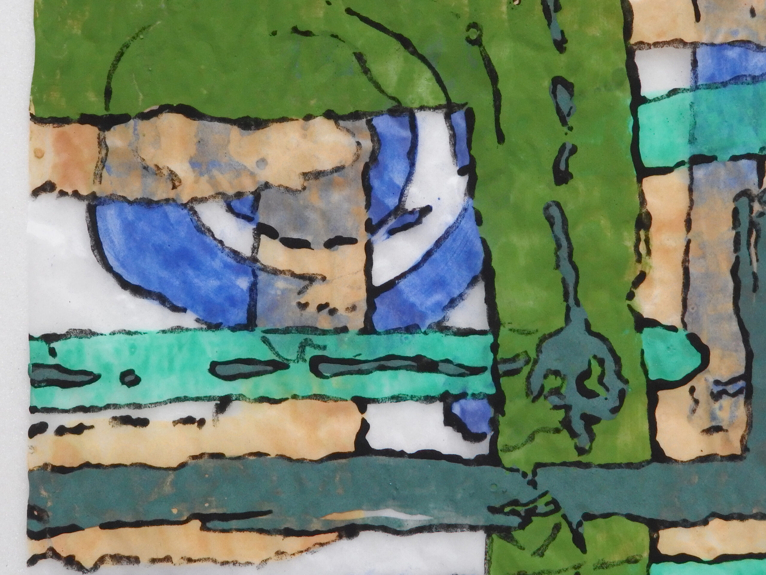 天然素材の和紙に膠を使うのが「日本画」の常識ですが、あえて人工素材を使っています。