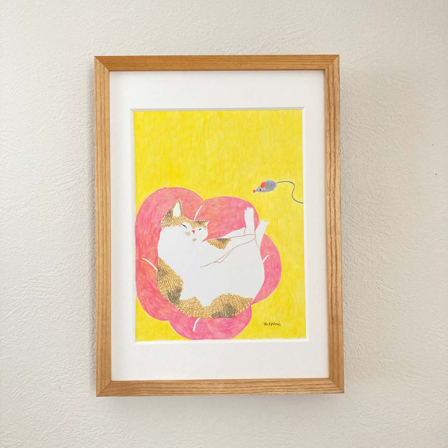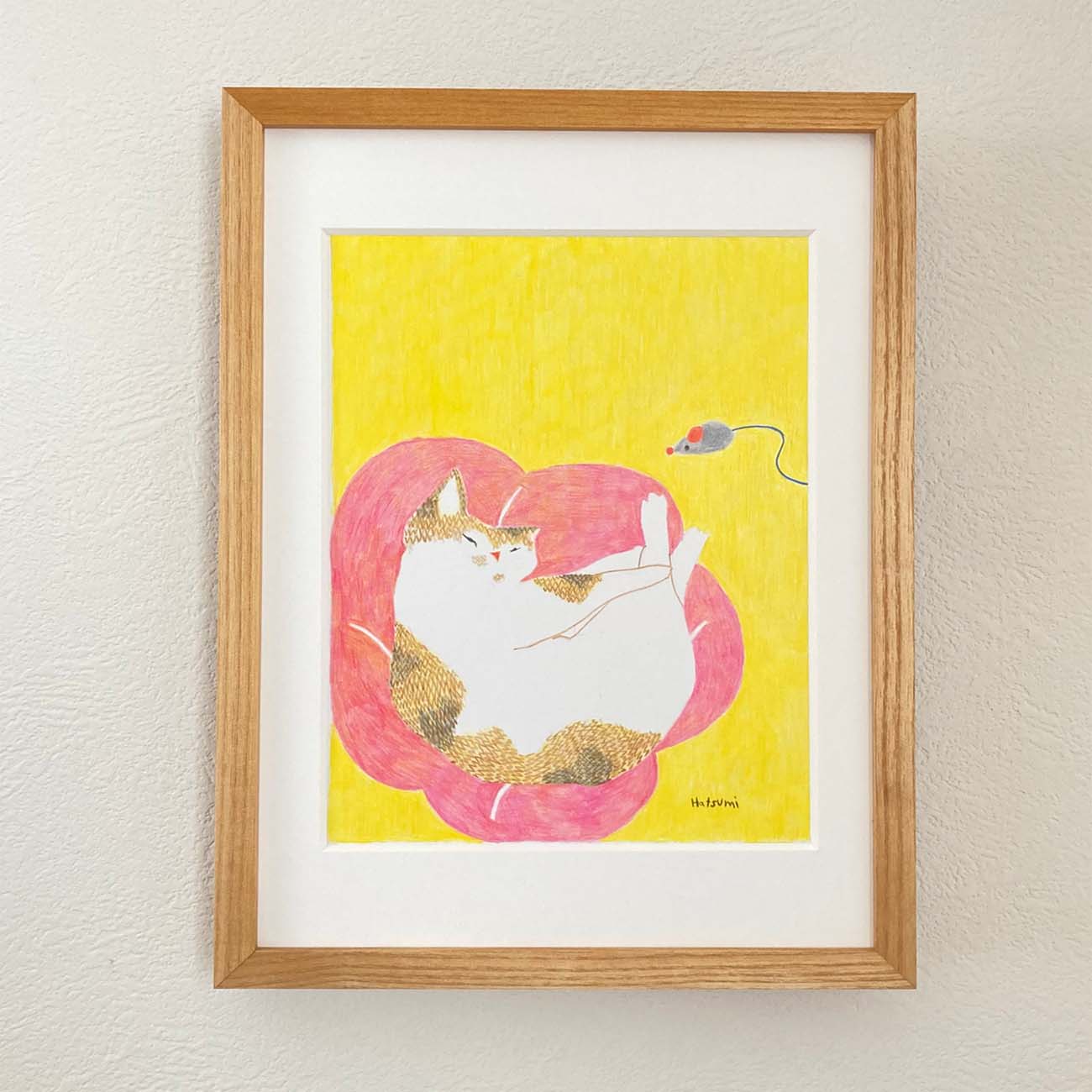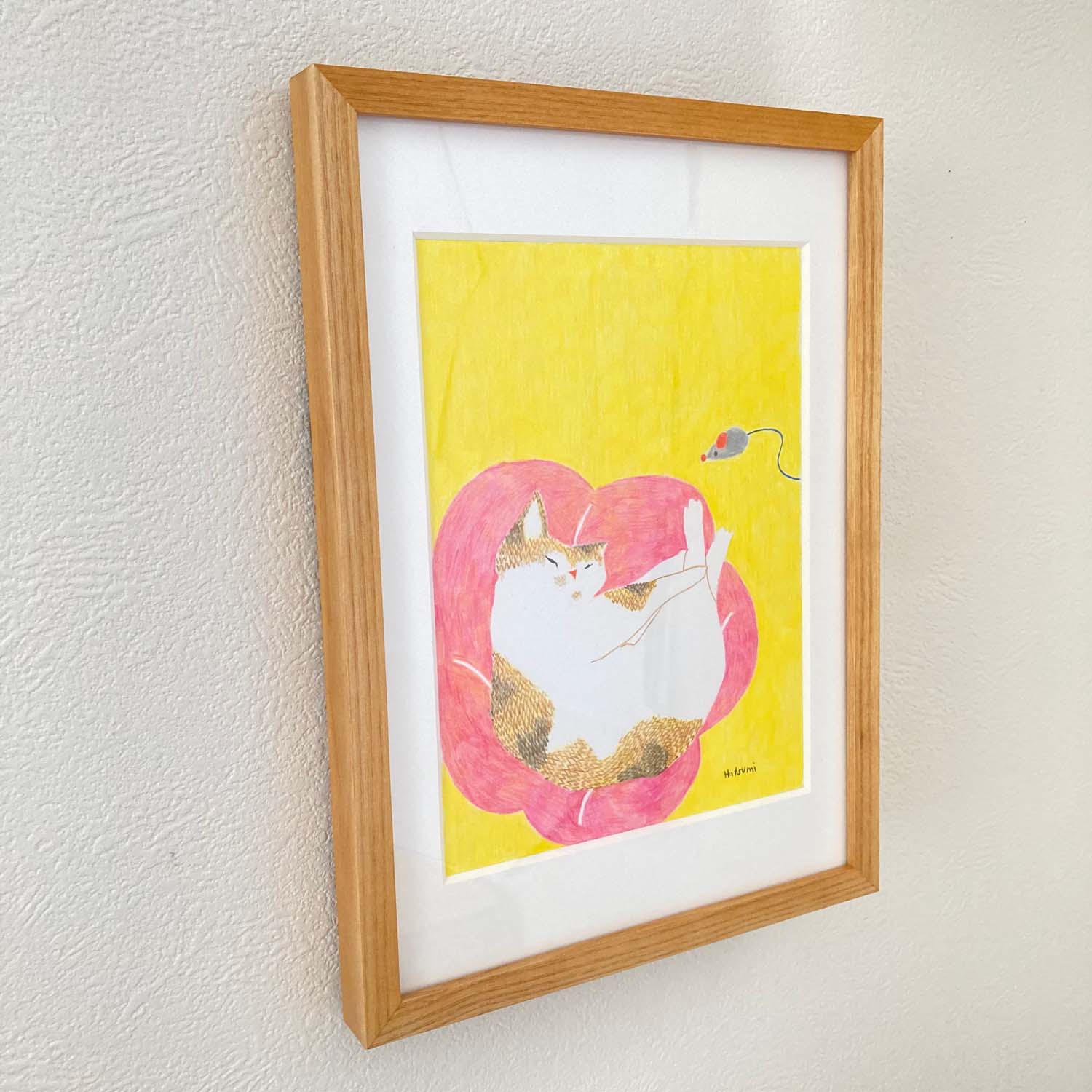 木製額縁は22.9cm×31.5cm厚さ2.3cm、UVカットアクリルのものにマットを入れて額装しています。
