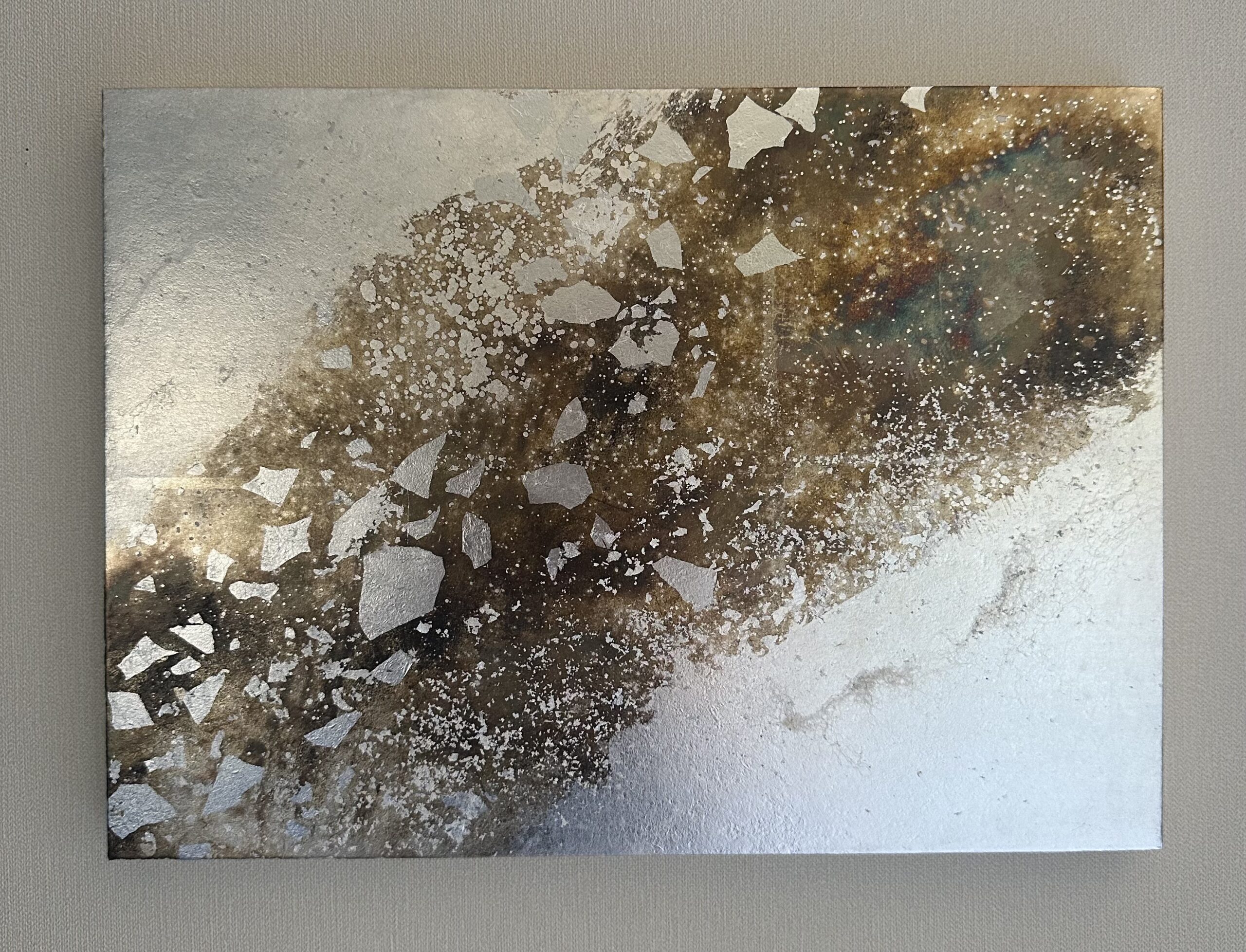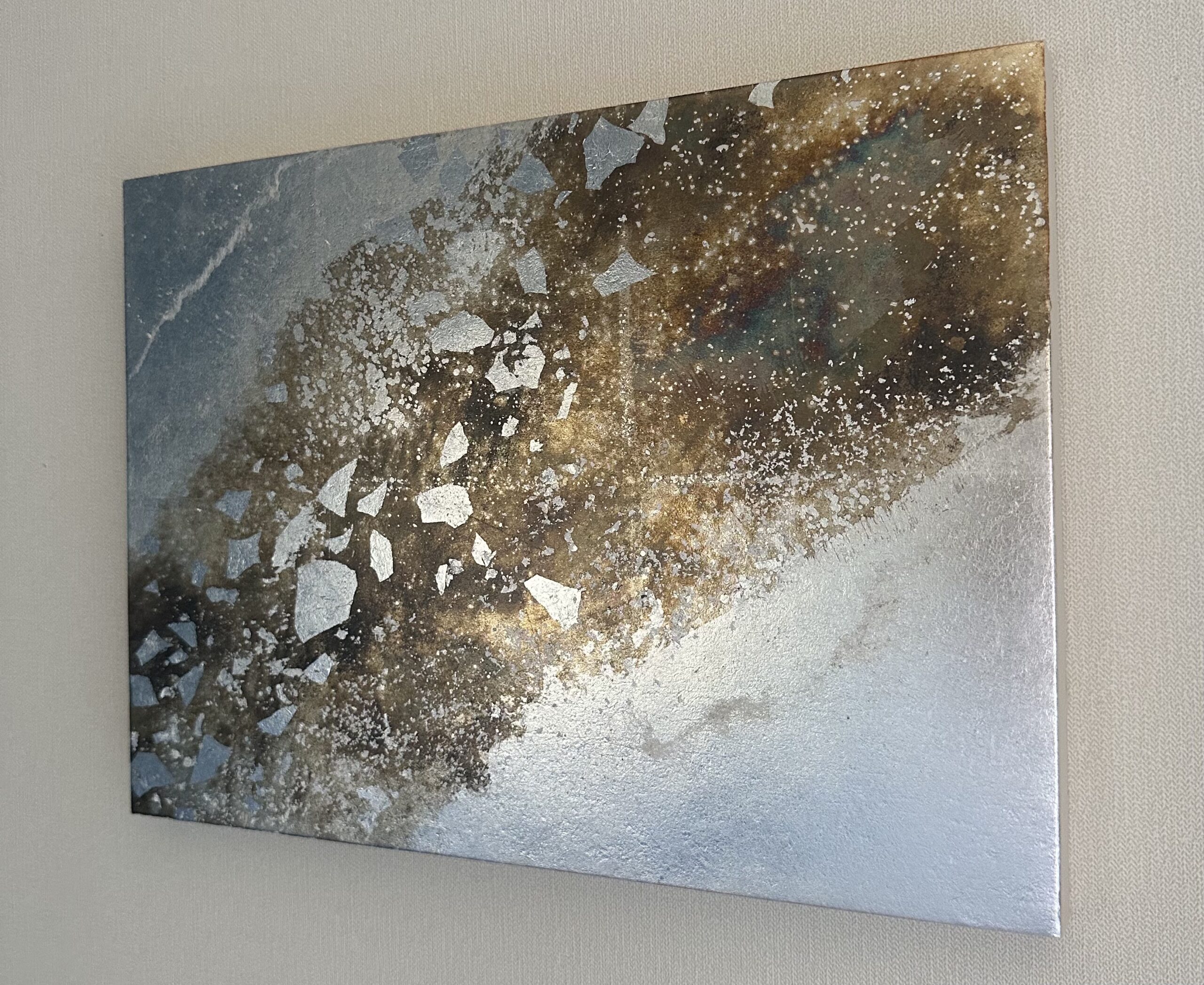 銀箔を貼り、一部を硫化してブロンズ色へ変化させた上に金属箔をのせて、彼方まで広がる星空を表現しました。