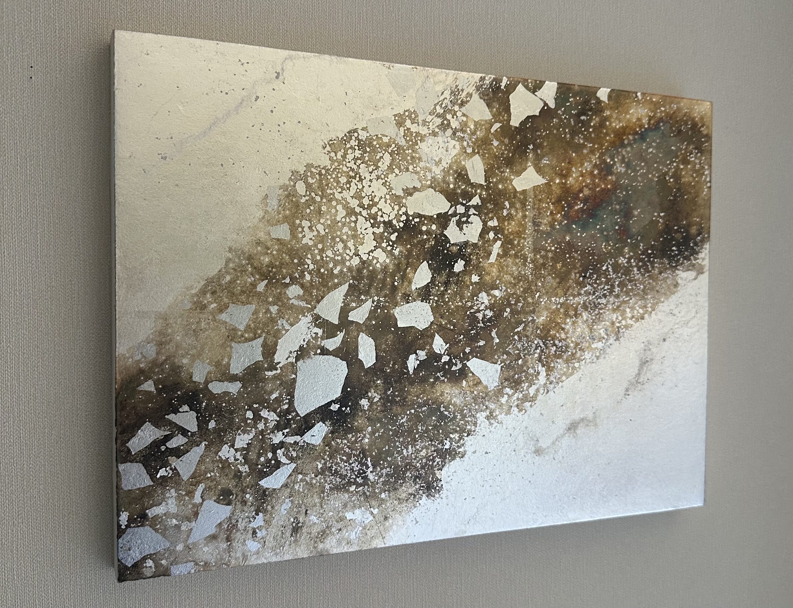 箔を使用した作品は、光のあたり方によって輝き方が変わります。日中の窓から入る自然光、夜の照明の光など、光の違いにより表情がかなり変わります。また、箔の変色を抑えるためのコーティングをしておりますが、時間経過とともに少しずつ色味が変化します。その変化もお楽しみいただけますと幸いです。