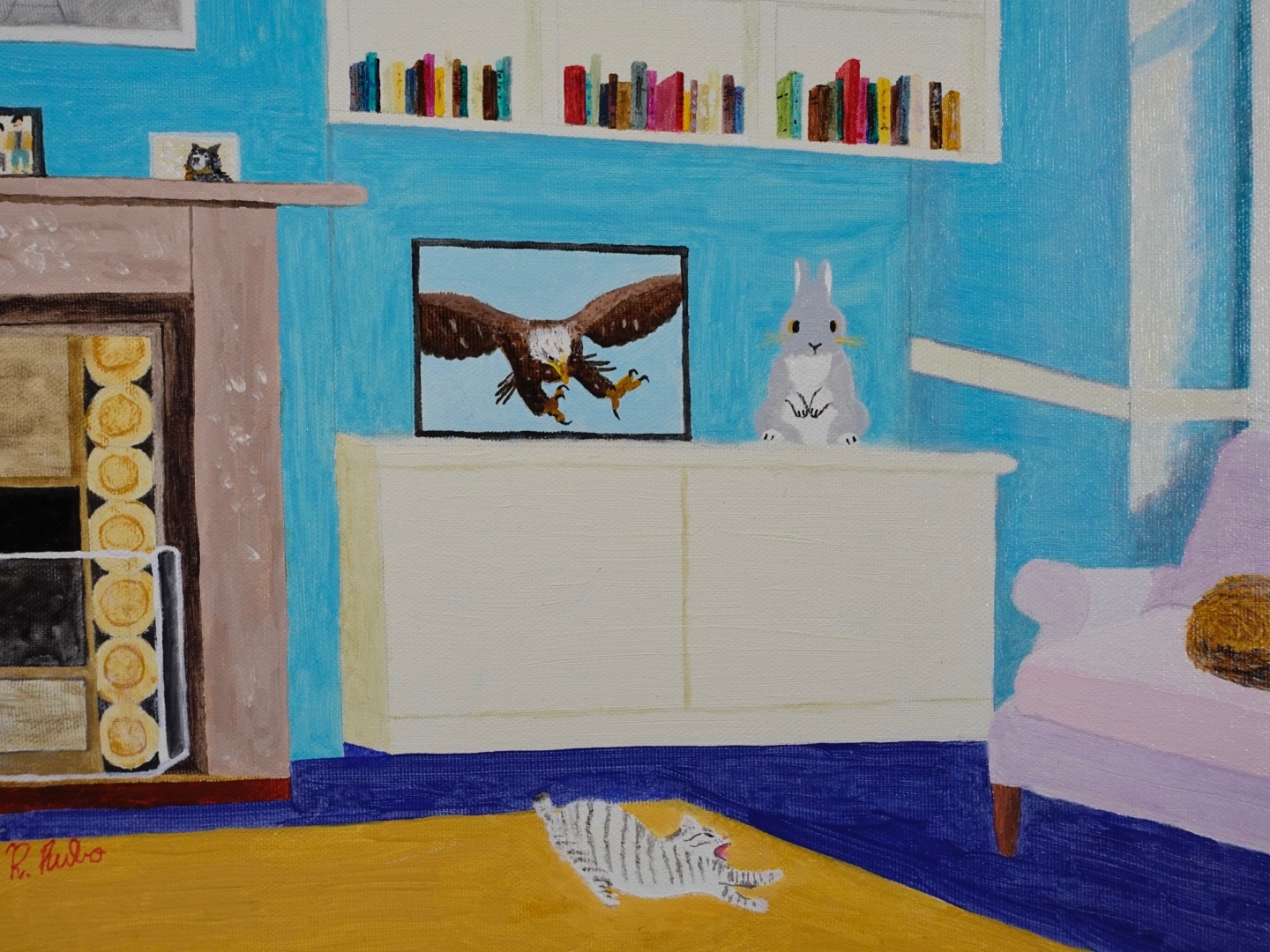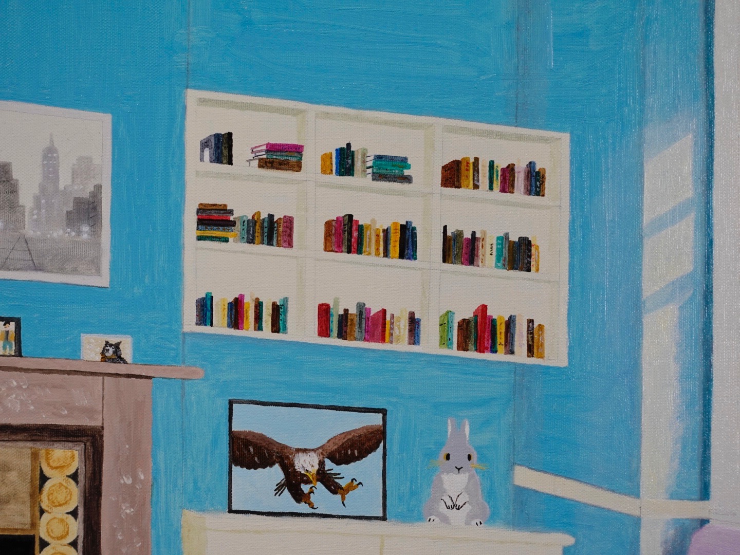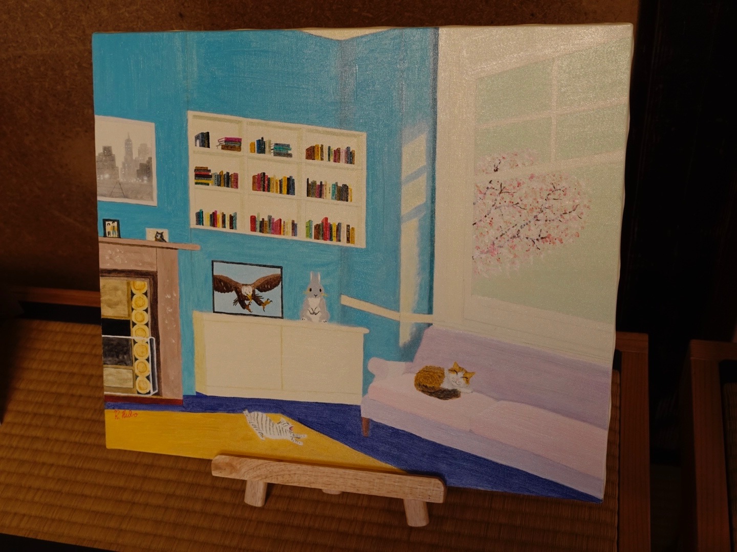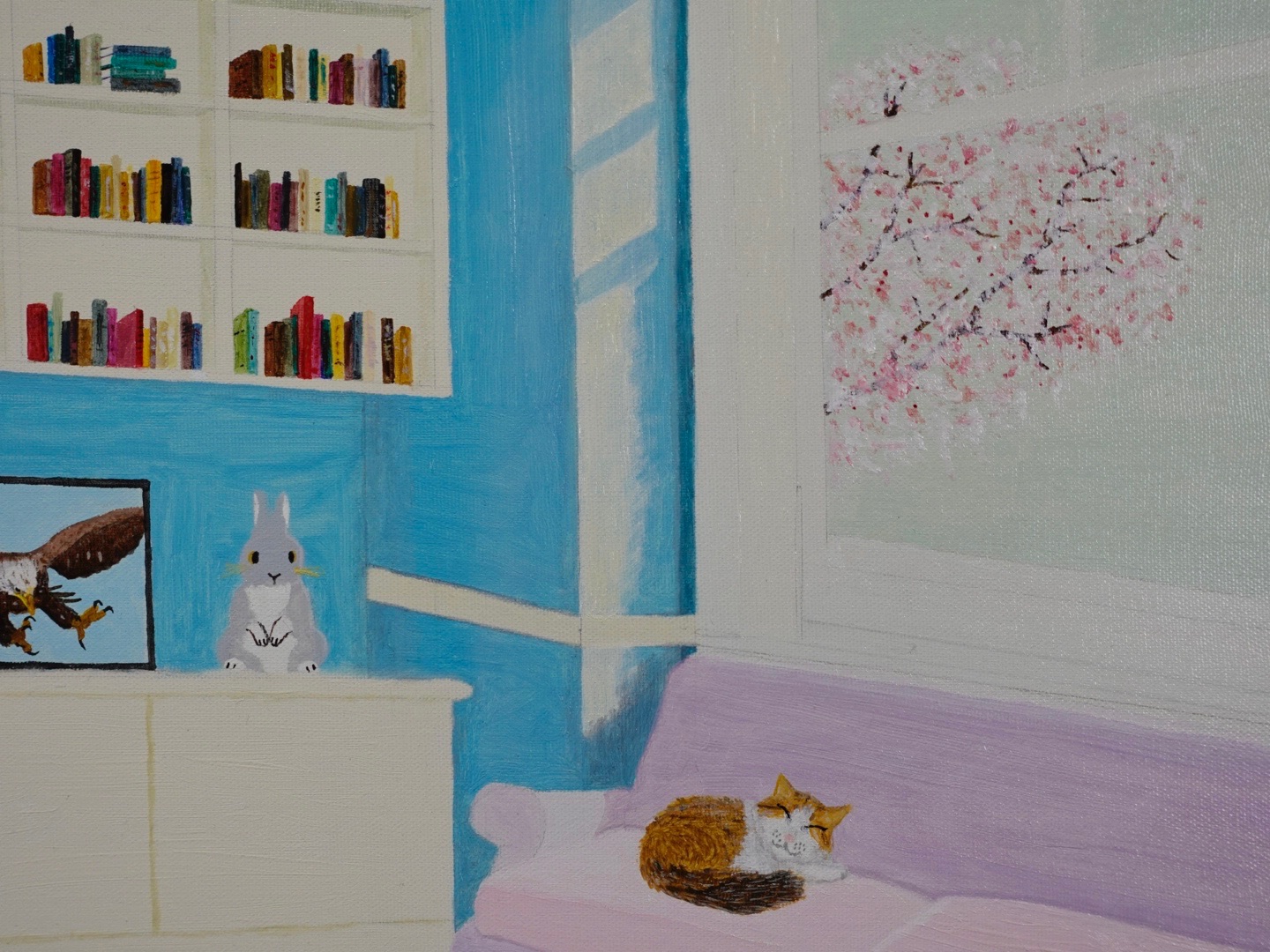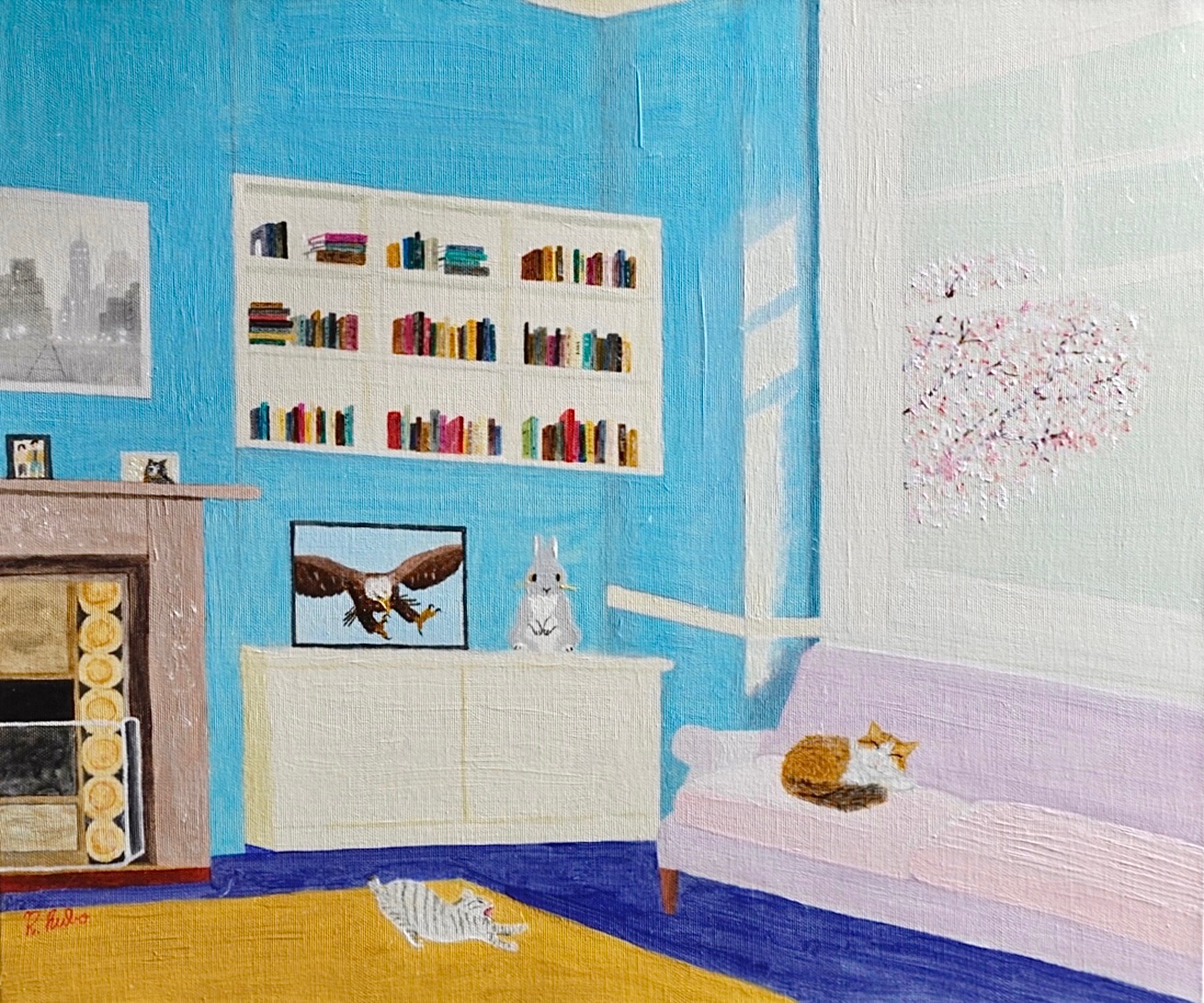 この油絵を描くにあたり、私は、家庭のシンプルな快適さを物語る、穏やかで居心地の良い空間を描き出そうとしました。穏やかさと静けさの感覚を呼び起こすために、主な色として青を選びました。趣のある暖炉から、居心地の良いピンクのソファ、鮮やかな本棚、くつろぐ猫、思い出に残る写真、窓の外の桜が満開の晴れた天気まで。それぞれの要素は、暖かさと平和を呼び起こすことを目的としています。この絵は、静けさと個人的な隠れ家を読え、見る人を立ち止まって静かなひとときを楽しむように誘います。どんな生活空間にもリラックスとインスピレーションをもたらすのに最適です。