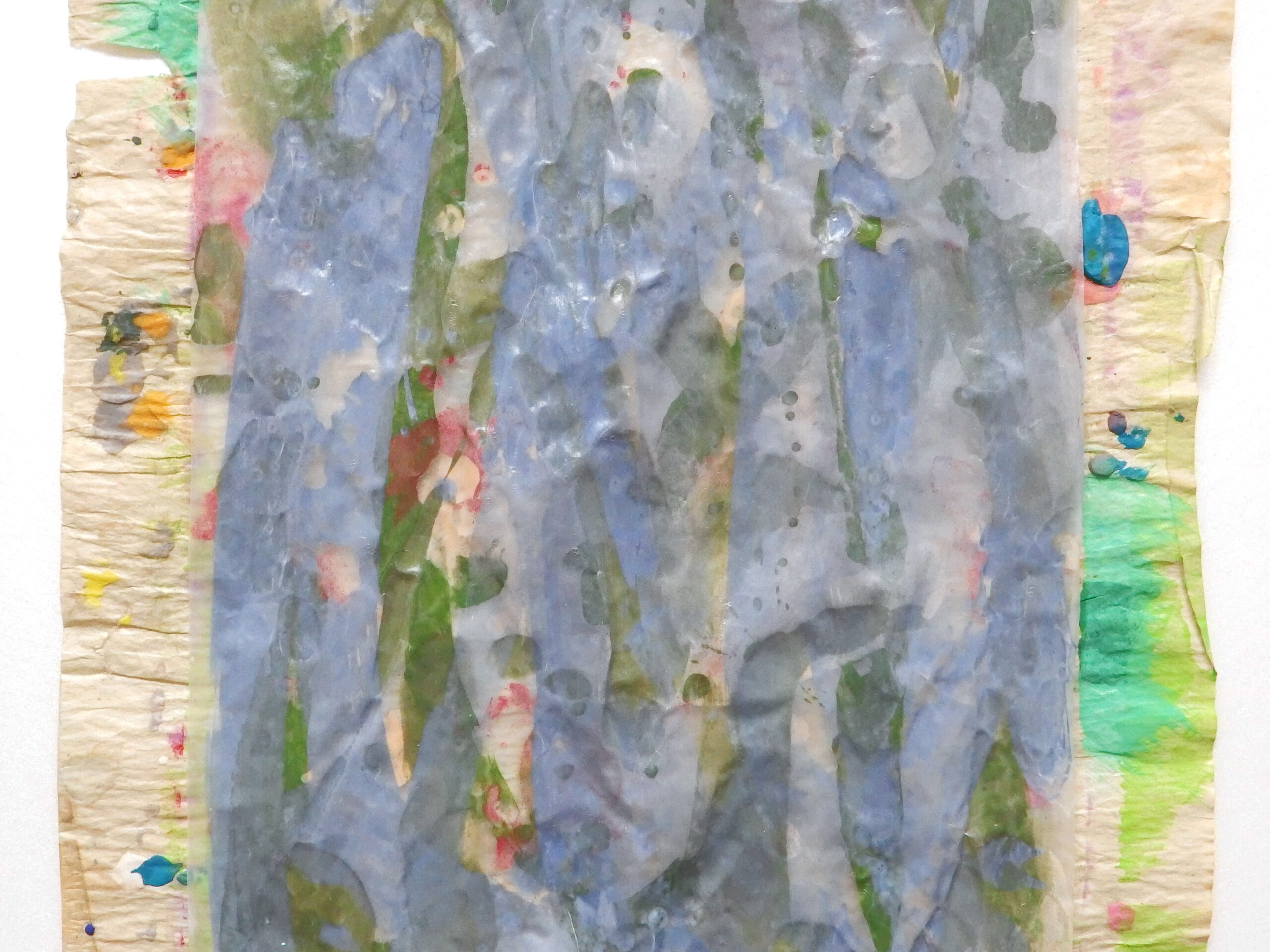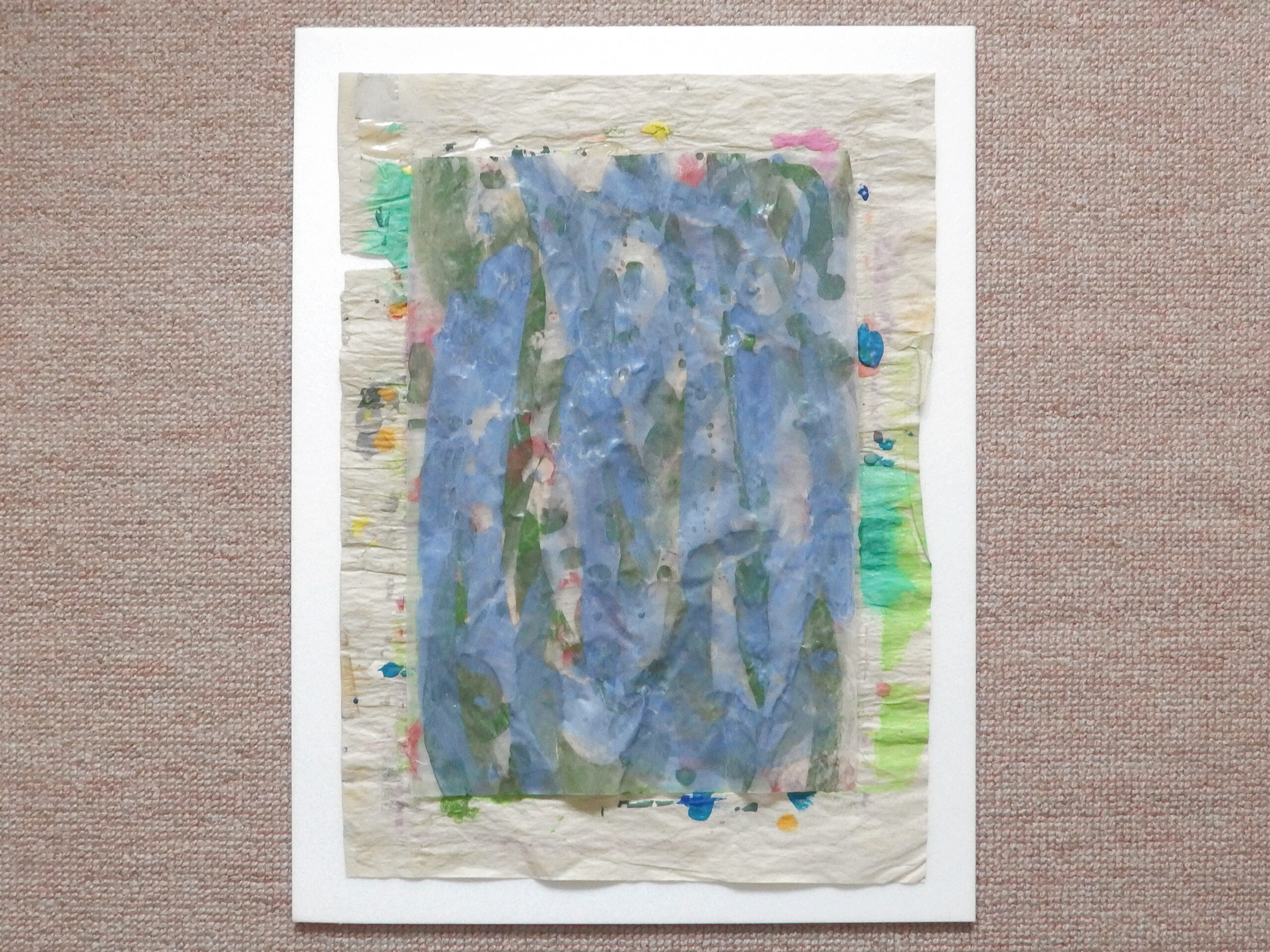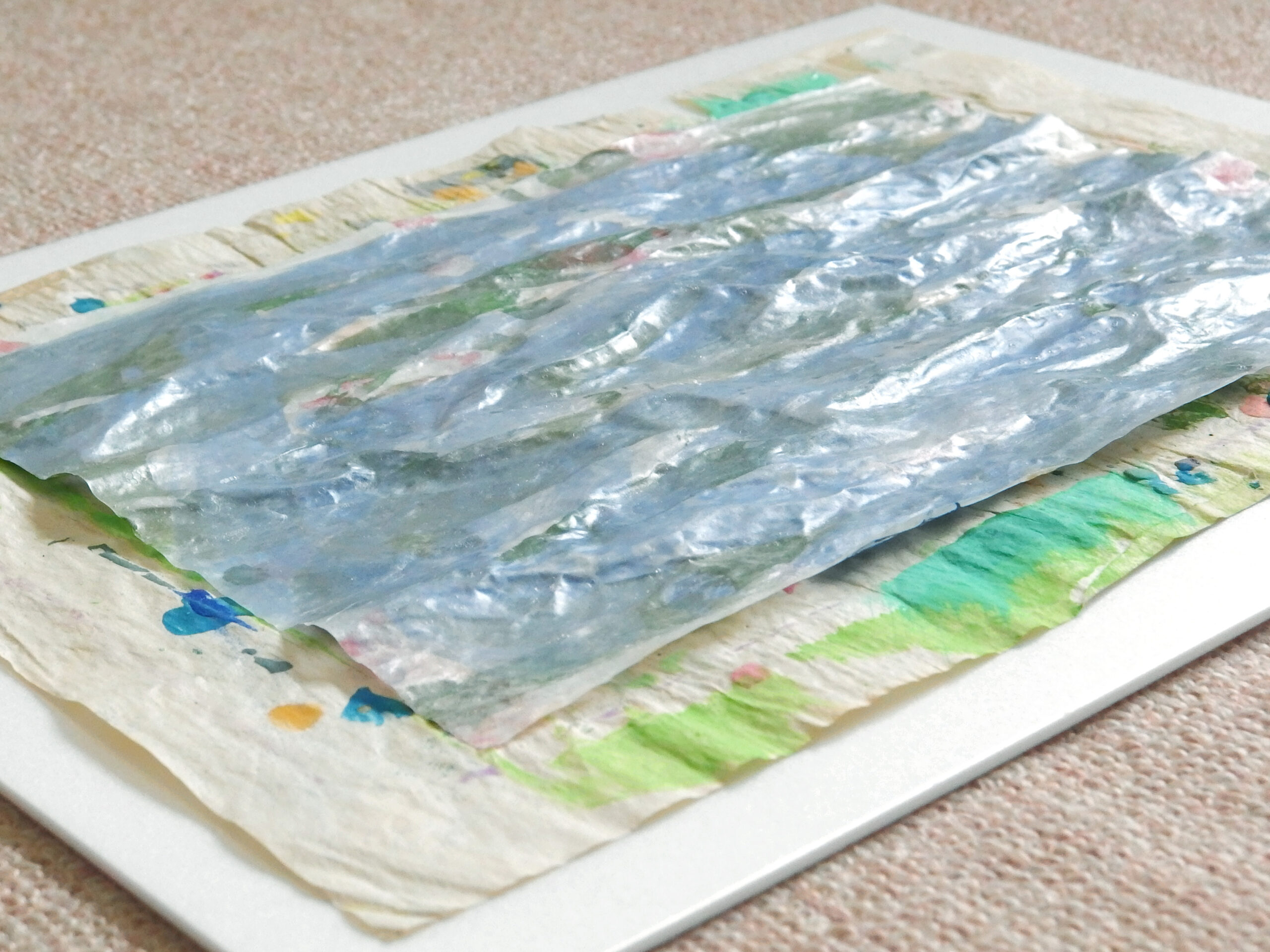 天然素材の和紙に膠を使うのが「日本画」の常識ですが、あえて人工素材を使っています。