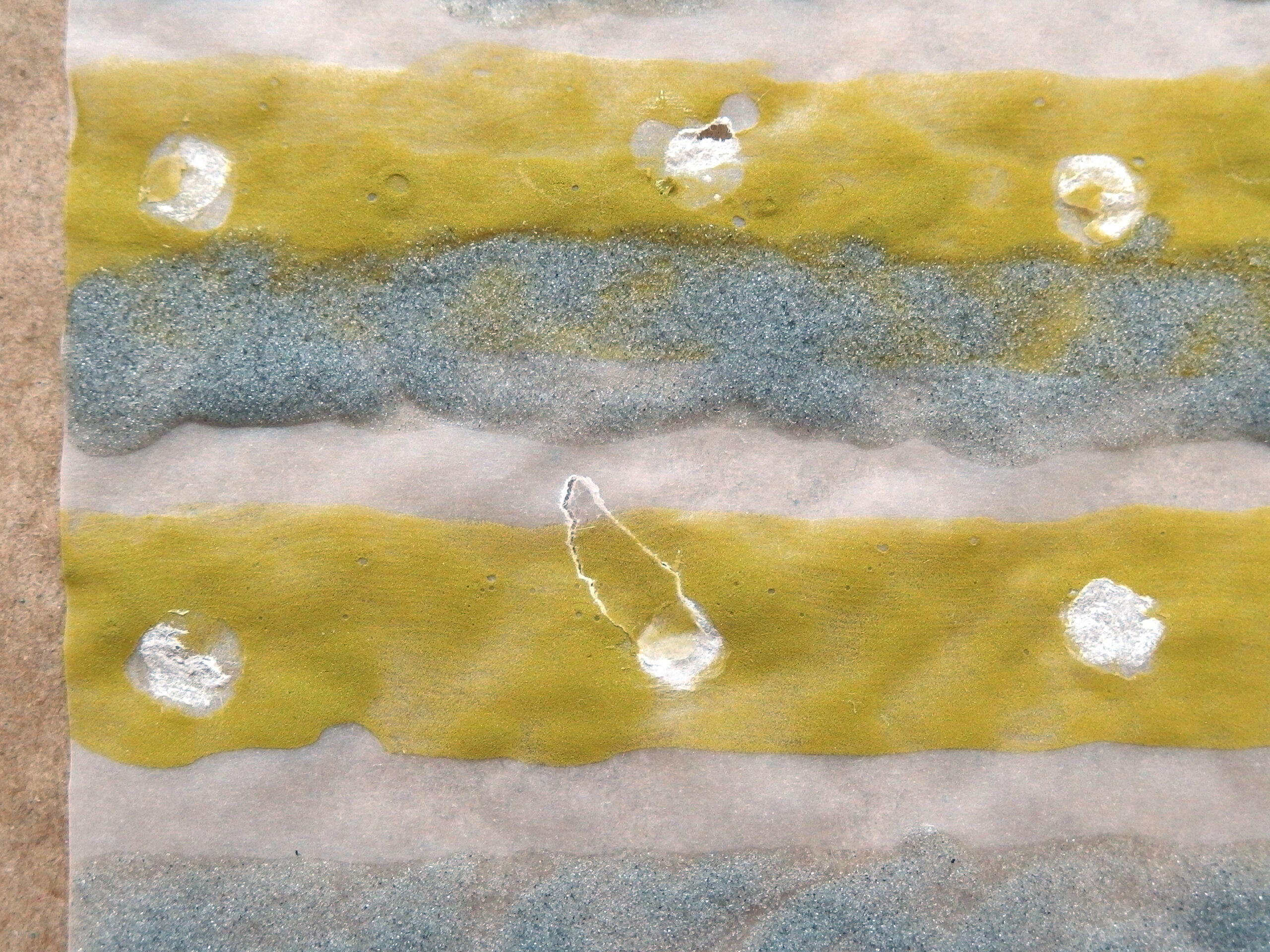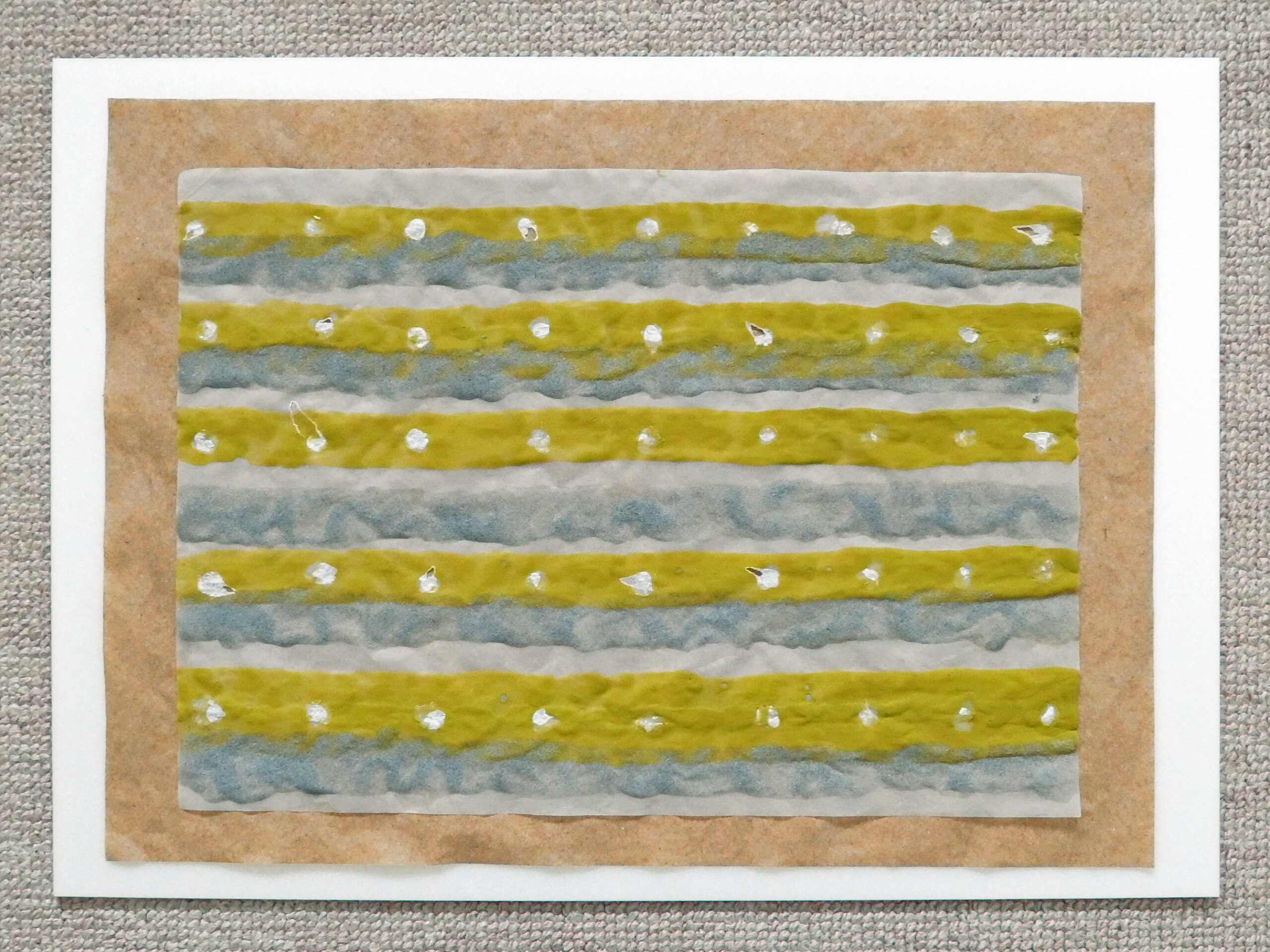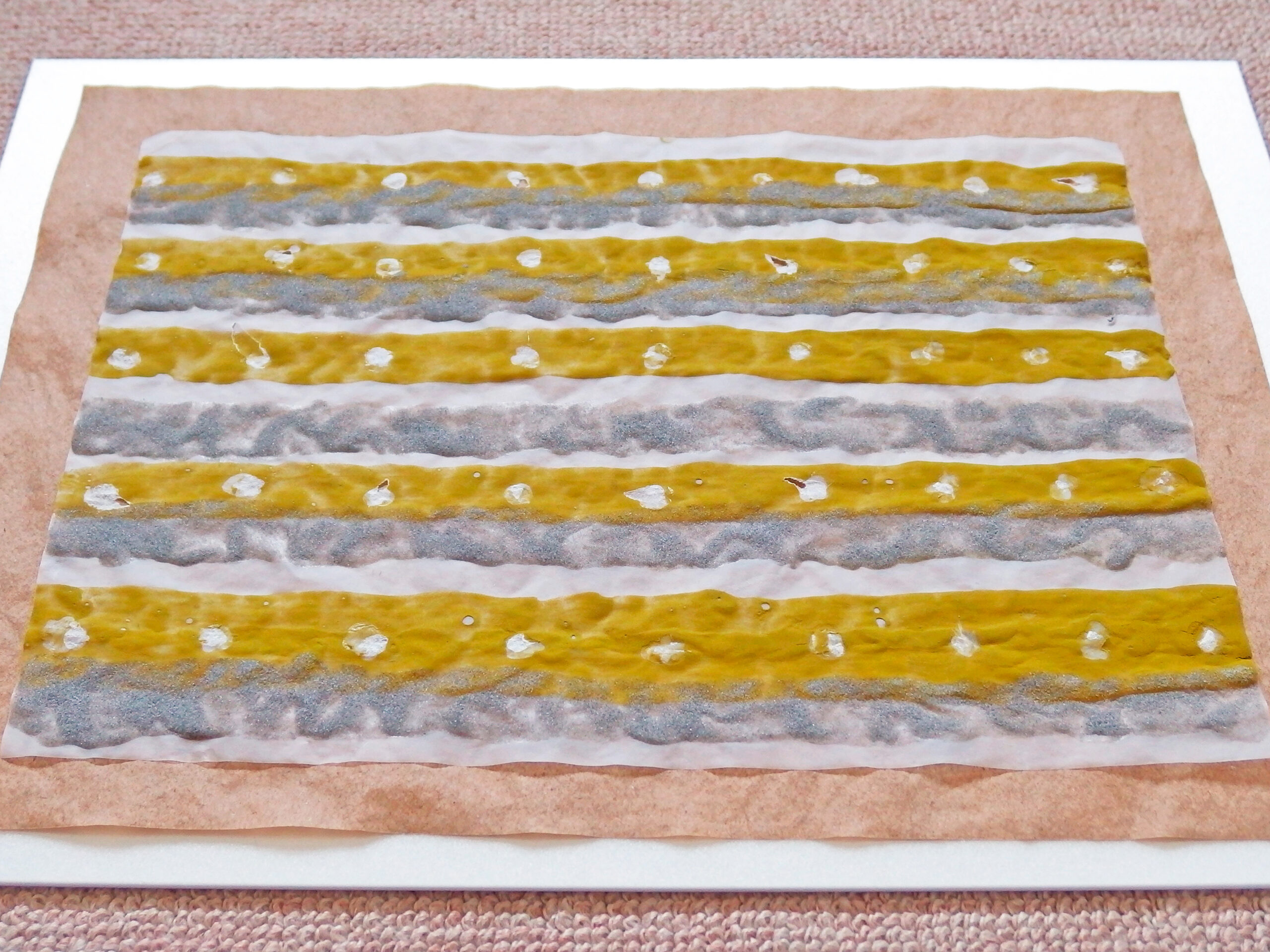 天然素材の和紙に膠を使うのが「日本画」の常識ですが、あえて人工素材を使っています。