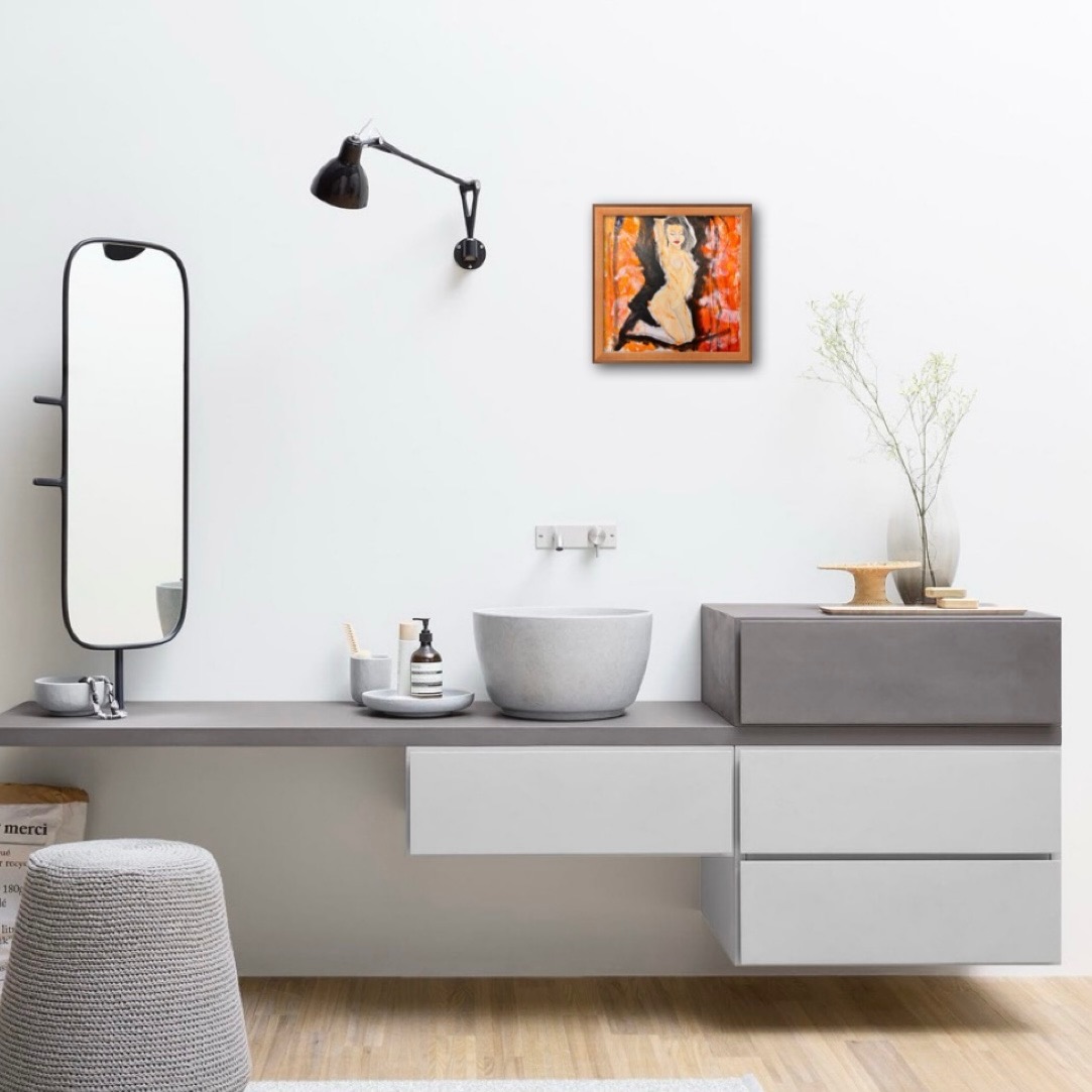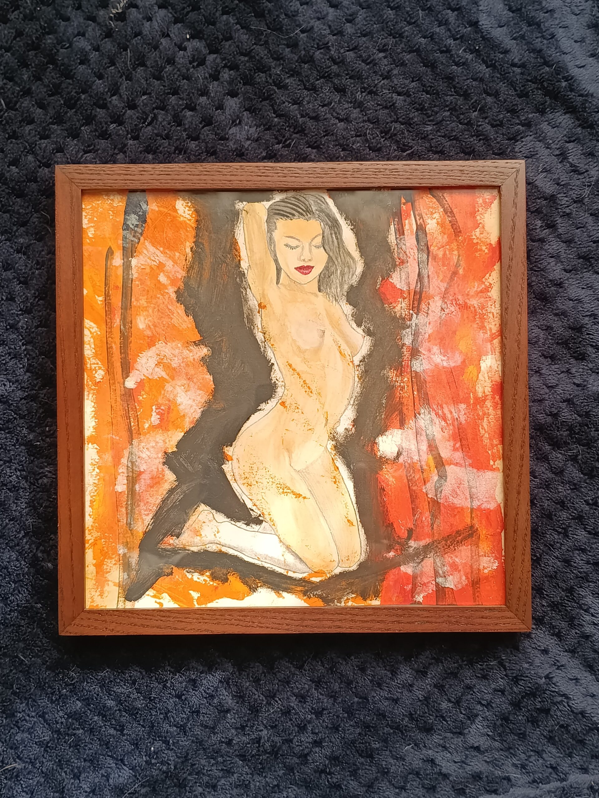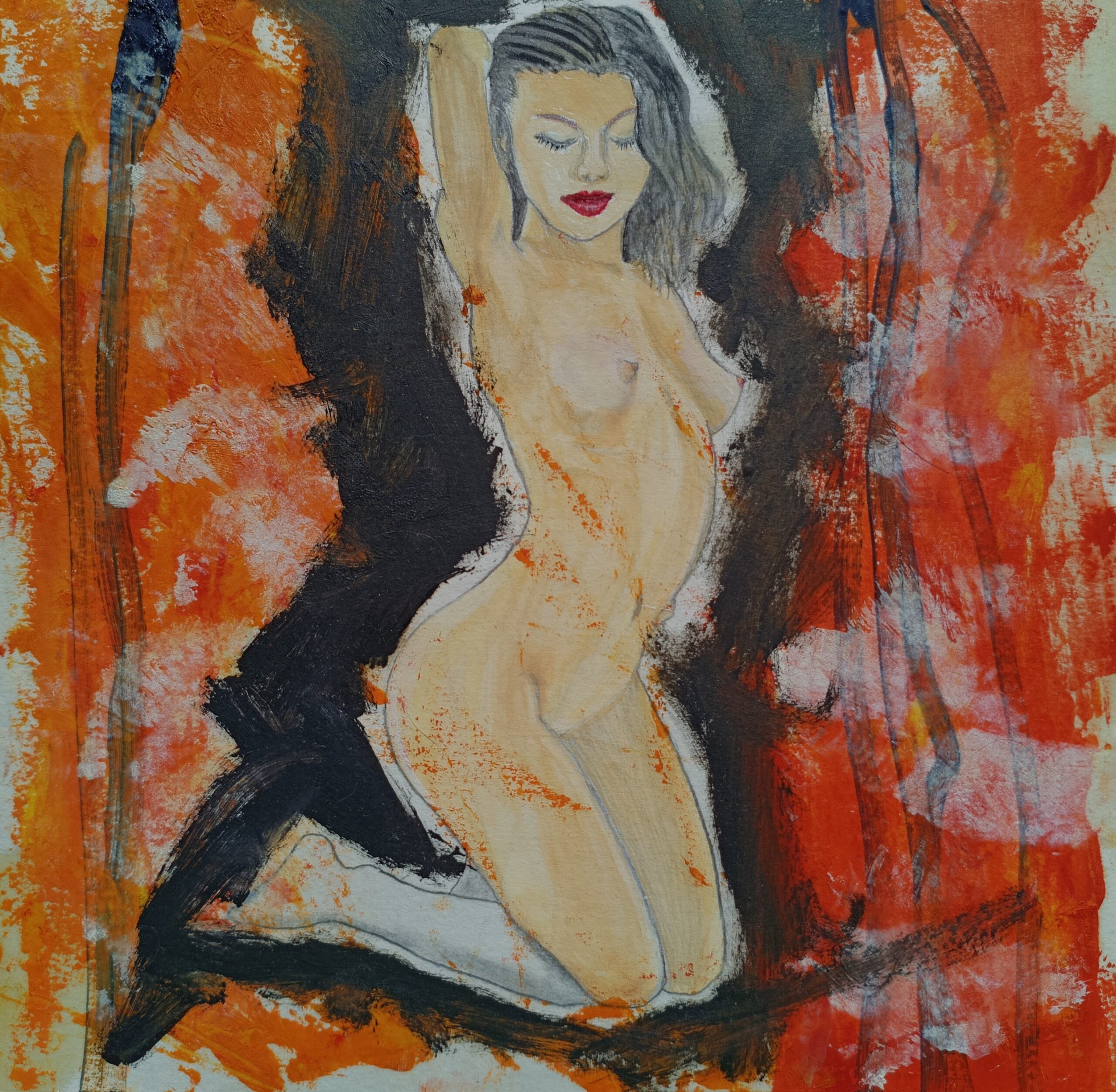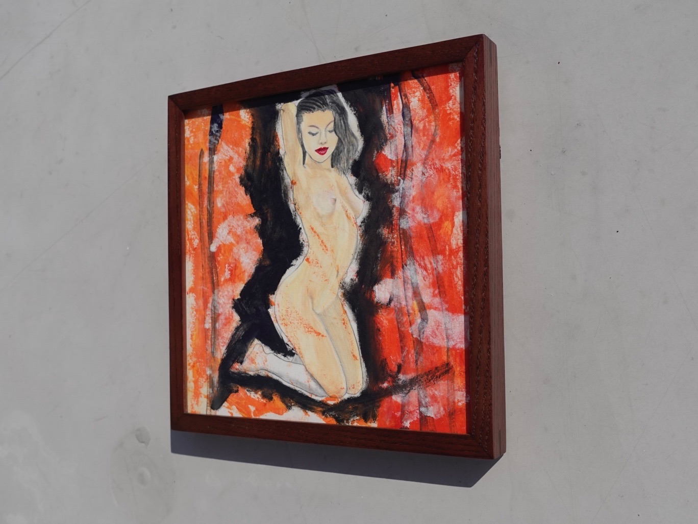 この作品では、抽象的なシュルレアリスムの深淵に踏み込み、油彩、水彩、鉛筆を巧みに組み合わせることで、鮮烈な感情の風景を描き出しました。燃えるようなオレンジ色の背景は、激しく情熱的な世界を象徴し、幽玄でありながらもエロティックで印象的な人間の姿は、この作品をシュールでありながら親密な人間体験へと導きます。この作品は、混沌と静寂の対話であり、生々しい躍動感あふれるエネルギーが駆使され、存在の力強さと脆さを際立たせています。鑑賞者を自身の感情の複雑さへと誘い、あらゆる空間に共鳴するエネルギーをもたらします。