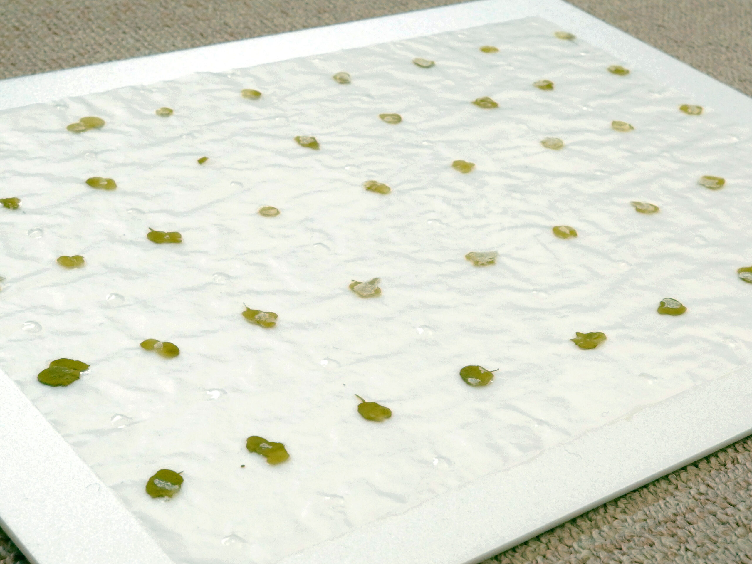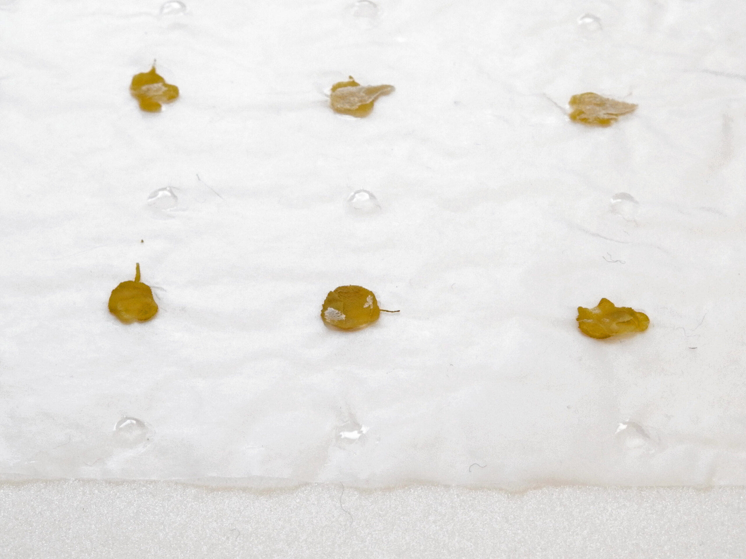 天然素材の和紙に膠を使うのが「日本画」の常識ですが、あえて人工素材を使っています。