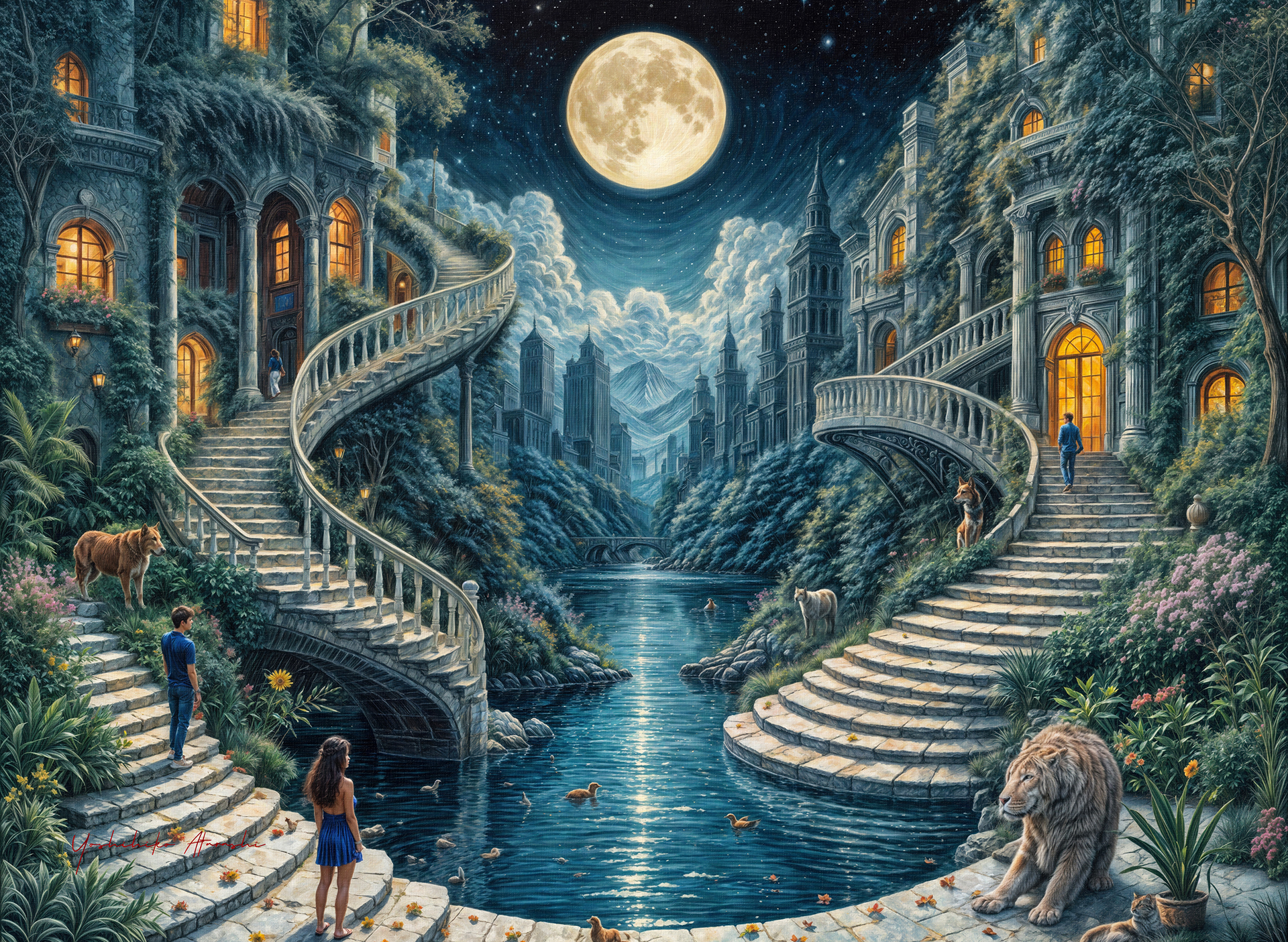 これらの作品「月光の迷宮」は、夢と現実が交錯する幻想的な夜の旅路を描いています。螺旋階段や迷路のような街並み、静謐な月光、そして仮想動物たちの姿は、見る者の無意識と記憶を呼び覚ます象徴です。細密な描写と幻想的構成で、誰しもの心に潜む「帰る場所」への渇望を表現しました。月明かりが照らす道を辿ることで、自らの内面世界と向き合う旅になることを願っています。