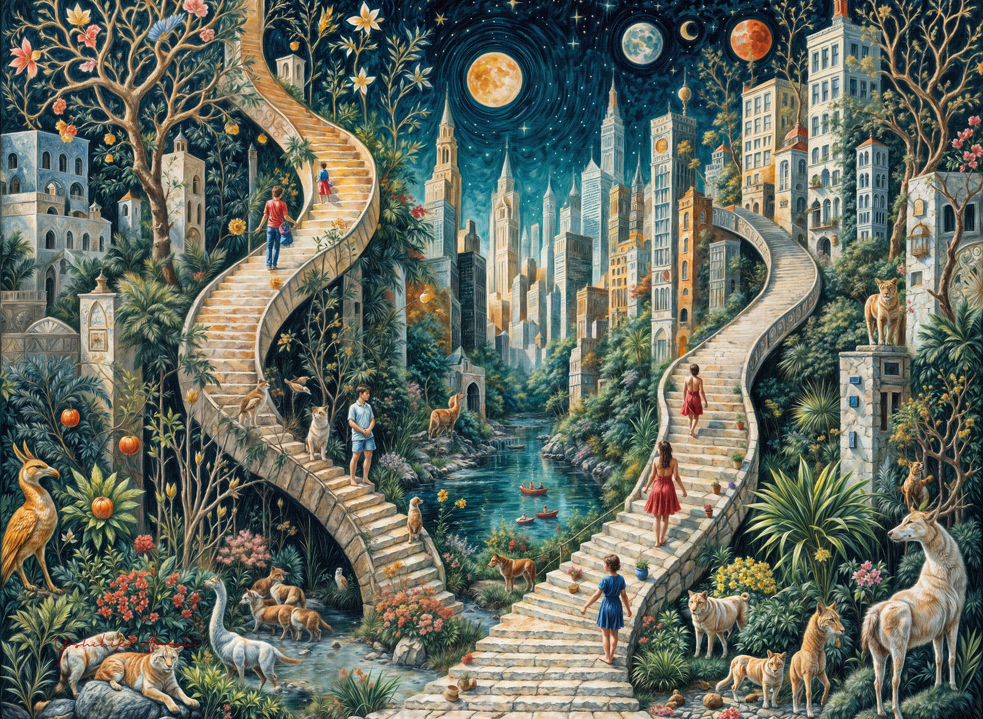 これらの作品「月光の迷宮」は、夢と現実が交錯する幻想的な夜の旅路を描いています。螺旋階段や迷路のような街並み、静謐な月光、そして仮想動物たちの姿は、見る者の無意識と記憶を呼び覚ます象徴です。細密な描写と幻想的構成で、誰しもの心に潜む「帰る場所」への渇望を表現しました。月明かりが照らす道を辿ることで、自らの内面世界と向き合う旅になることを願っています。
