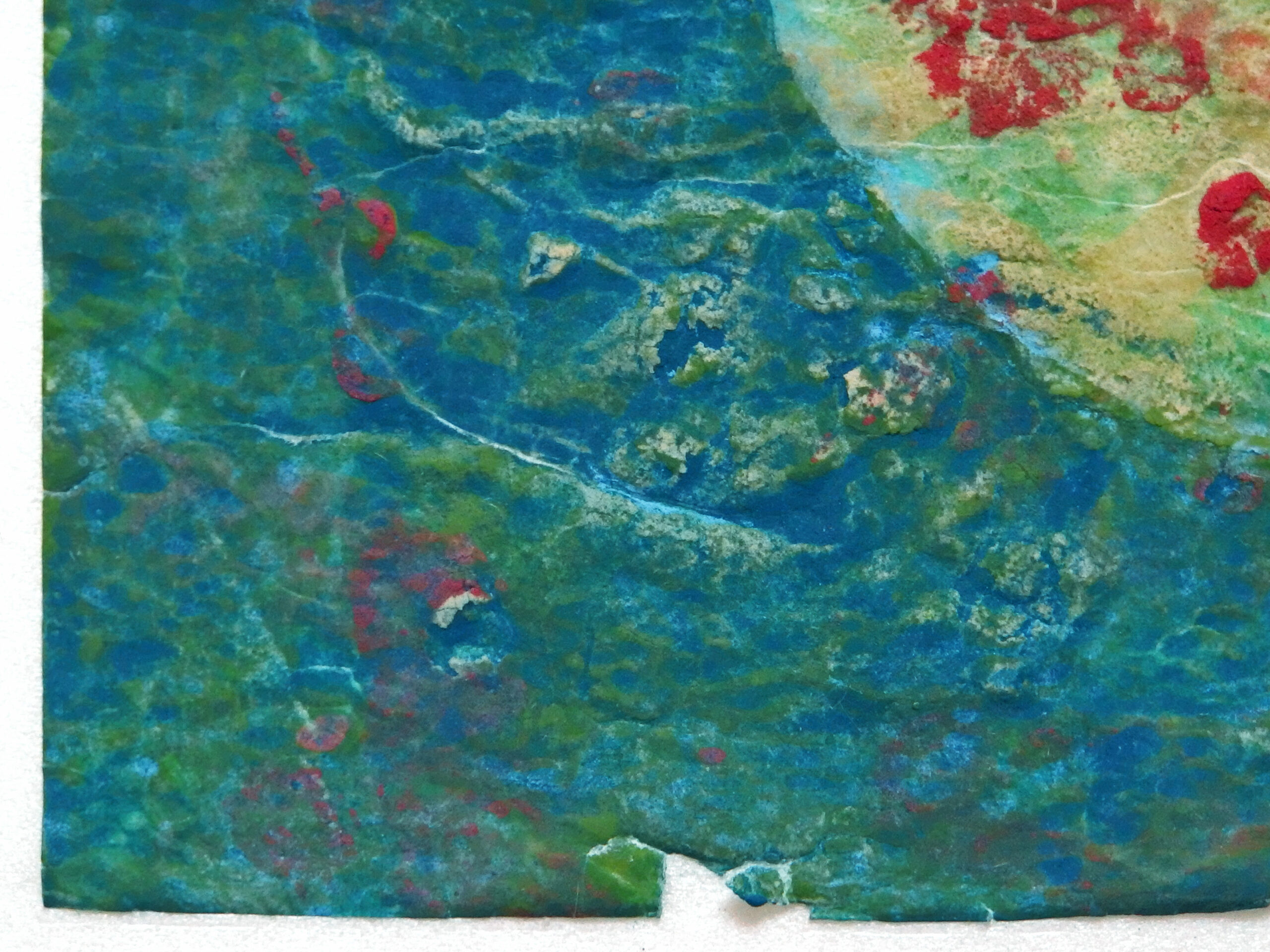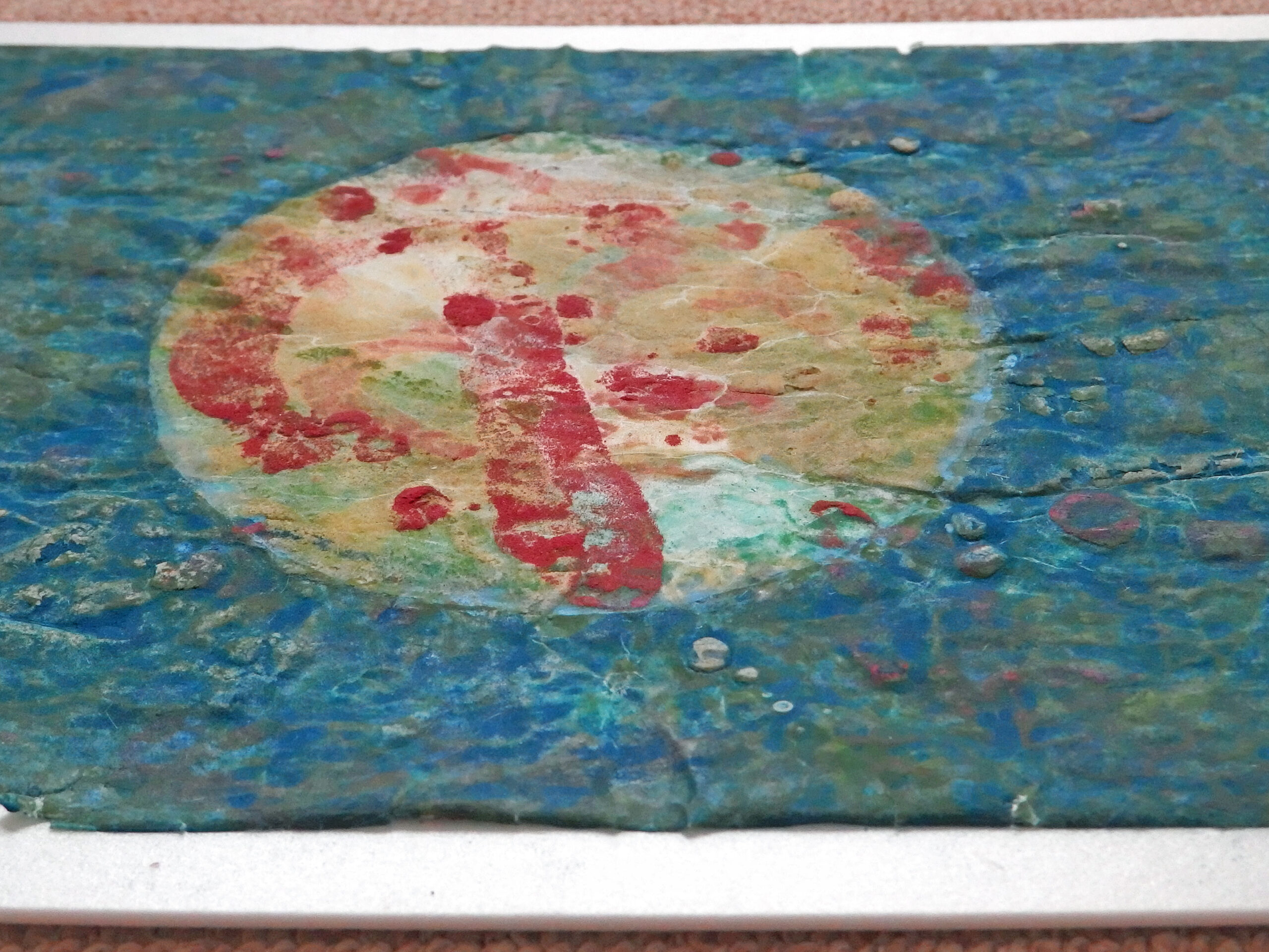 天然素材の和紙に膠を使うのが「日本画」の常識ですが、あえて人工素材を使っています。