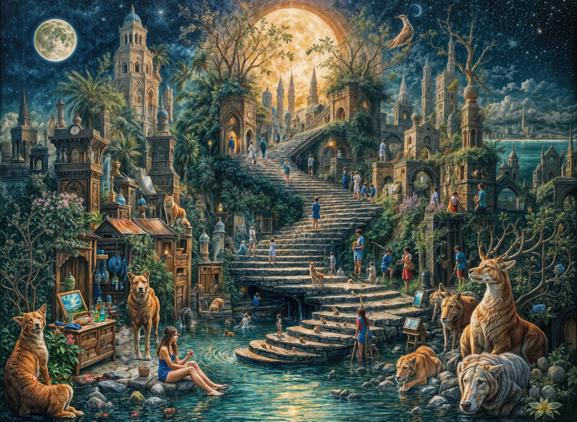 これらの作品「月光の迷宮」は、夢と現実が交錯する幻想的な夜の旅路を描いています。螺旋階段や迷路のような街並み、静謐な月光、そして仮想動物たちの姿は、見る者の無意識と記憶を呼び覚ます象徴です。細密な描写と幻想的構成で、誰しもの心に潜む「帰る場所」への渇望を表現しました。月明かりが照らす道を辿ることで、自らの内面世界と向き合う旅になることを願っています。