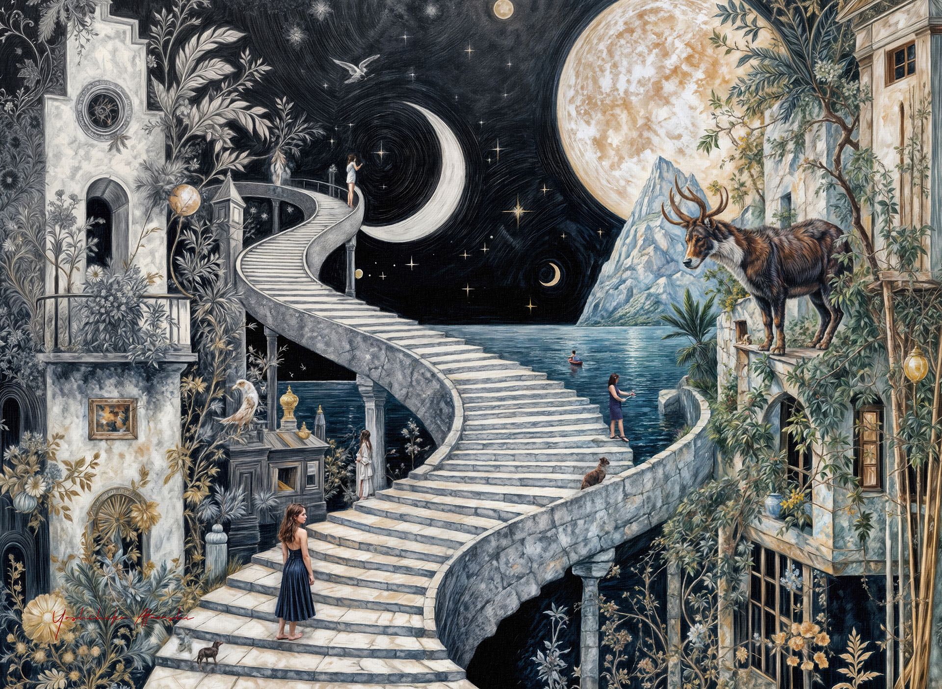 これらの作品「月光の迷宮」は、夢と現実が交錯する幻想的な夜の旅路を描いています。螺旋階段や迷路のような街並み、静謐な月光、そして仮想動物たちの姿は、見る者の無意識と記憶を呼び覚ます象徴です。細密な描写と幻想的構成で、誰しもの心に潜む「帰る場所」への渇望を表現しました。月明かりが照らす道を辿ることで、自らの内面世界と向き合う旅になることを願っています。