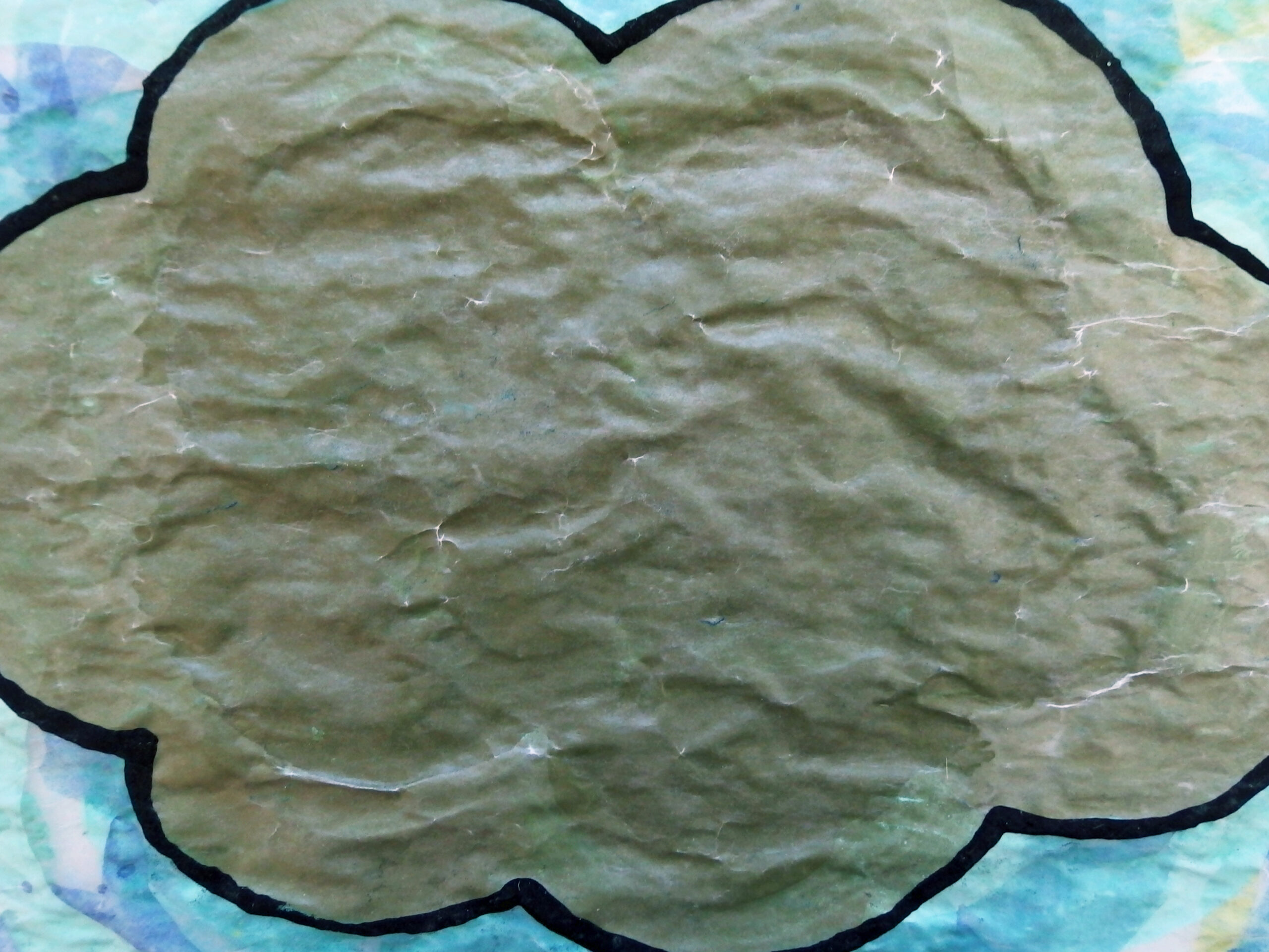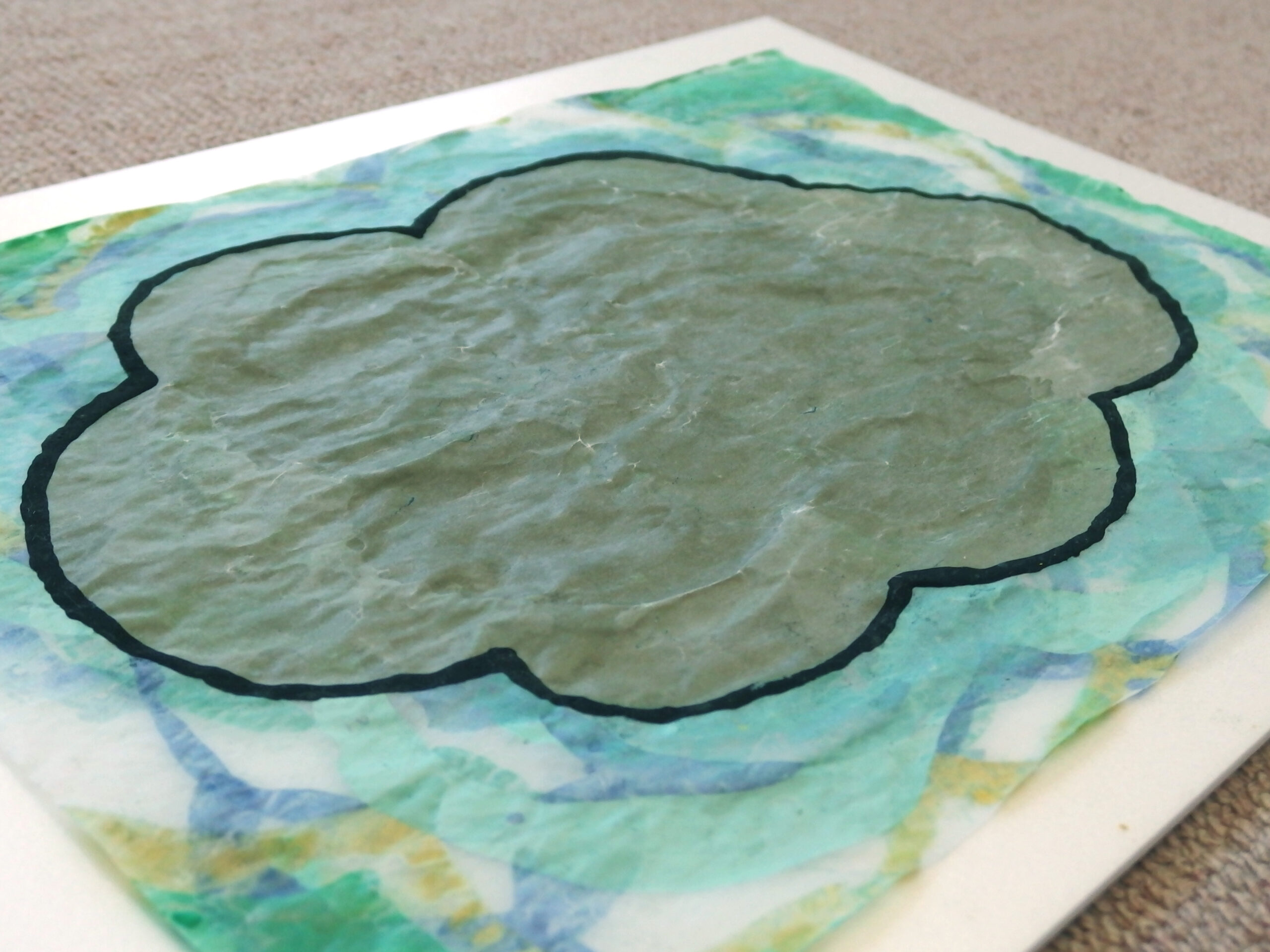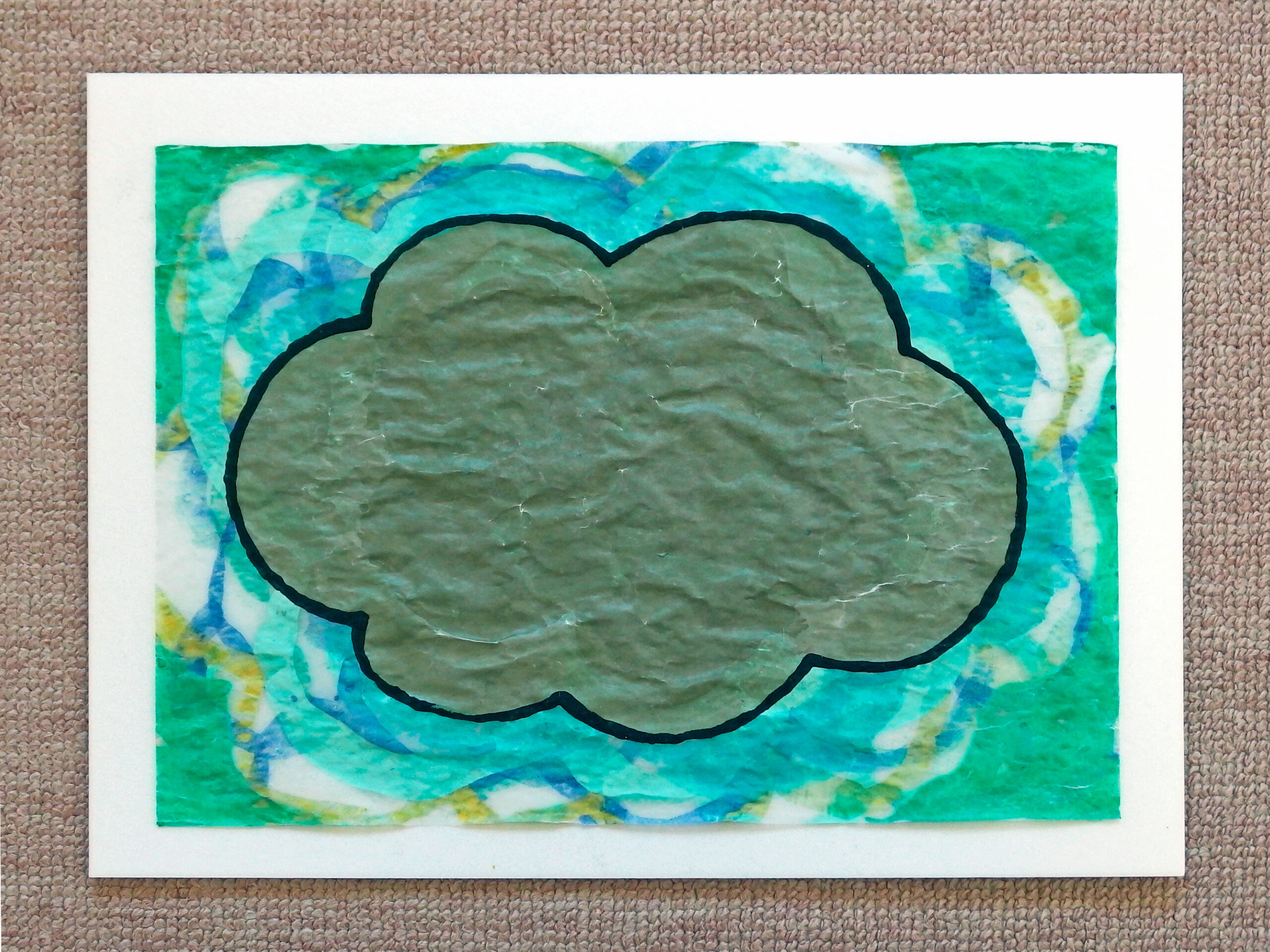 天然素材の和紙に膠を使うのが「日本画」の常識ですが、あえて人工素材を使っています。