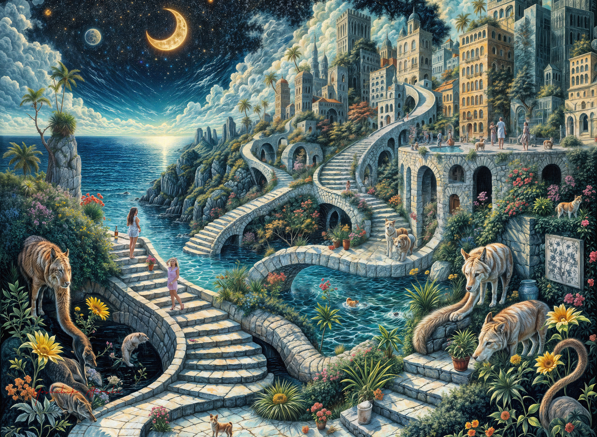 これらの作品「月光の迷宮」は、夢と現実が交錯する幻想的な夜の旅路を描いています。螺旋階段や迷路のような街並み、静謐な月光、そして仮想動物たちの姿は、見る者の無意識と記憶を呼び覚ます象徴です。細密な描写と幻想的構成で、誰しもの心に潜む「帰る場所」への渇望を表現しました。月明かりが照らす道を辿ることで、自らの内面世界と向き合う旅になることを願っています。