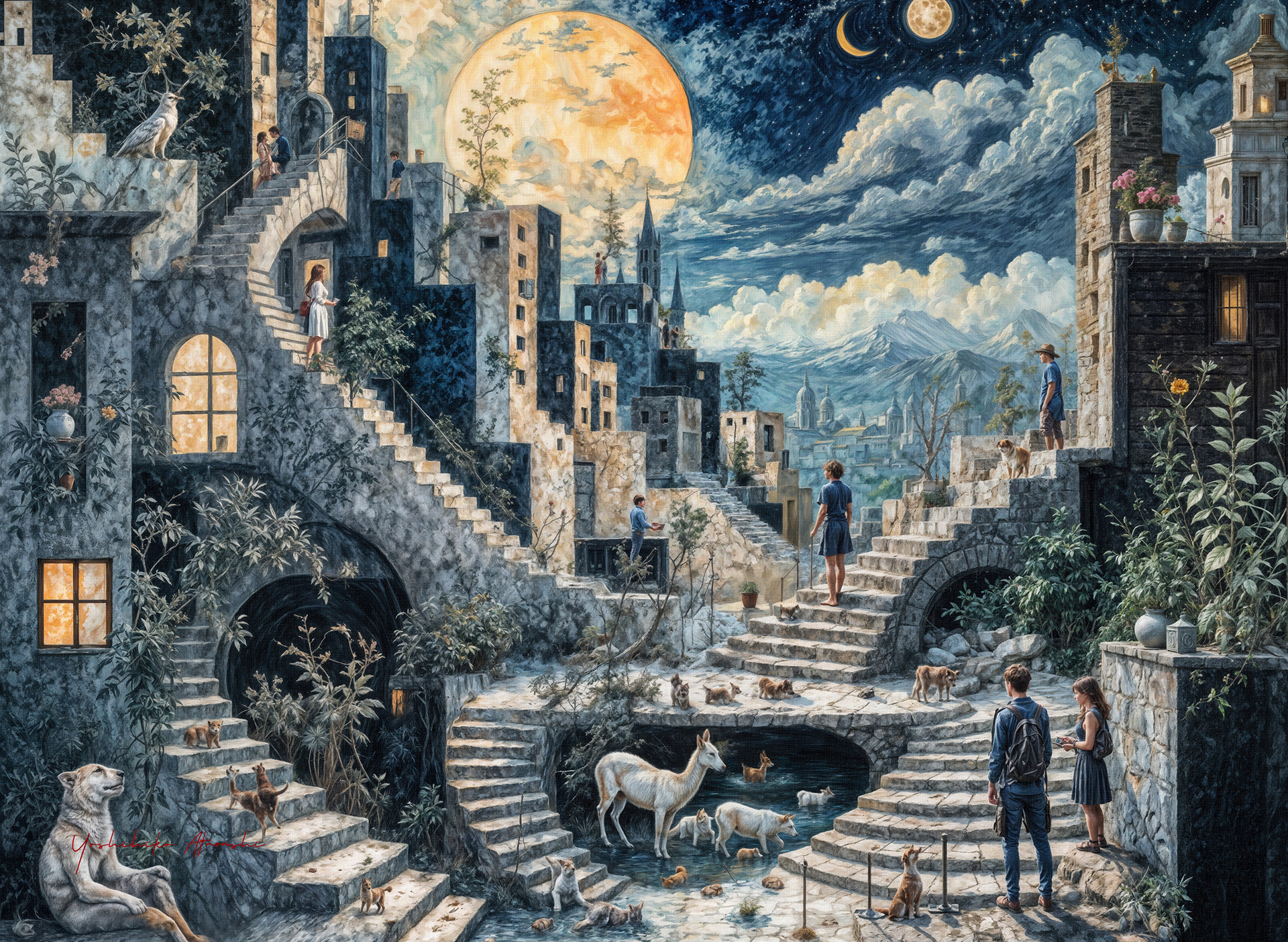 本作「月光の迷宮」シリーズは、幻想(仮想生物)と現実(人間)が溶け合う夜の風景を舞台に、細部まで緻密に描かれた迷宮的世界が魅力です。月光に導かれるように配された階段や仮想生物たちが、観る者を物語の中へ誘います。展示では暗めの照明とスポットライトで月光の演出を強調し、迷宮の中を巡るような配置にすることで、没入感のある空間を演出します。