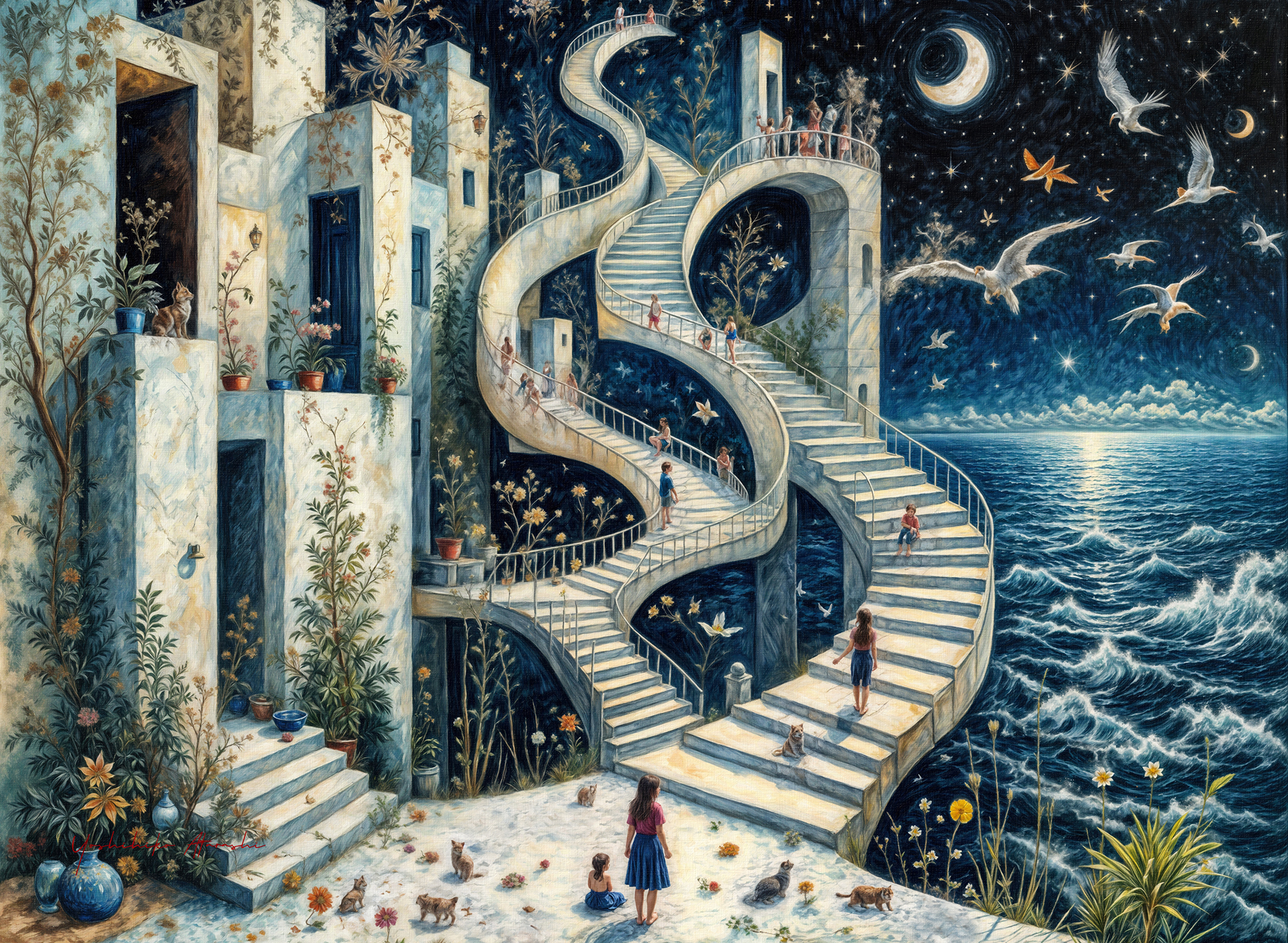 これらの作品「月光の迷宮」は、夢と現実が交錯する幻想的な夜の旅路を描いています。螺旋階段や迷路のような街並み、静謐な月光、そして仮想動物たちの姿は、見る者の無意識と記憶を呼び覚ます象徴です。細密な描写と幻想的構成で、誰しもの心に潜む「帰る場所」への渇望を表現しました。月明かりが照らす道を辿ることで、自らの内面世界と向き合う旅になることを願っています。