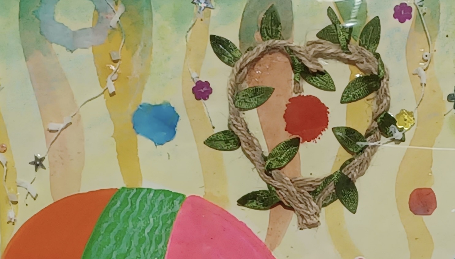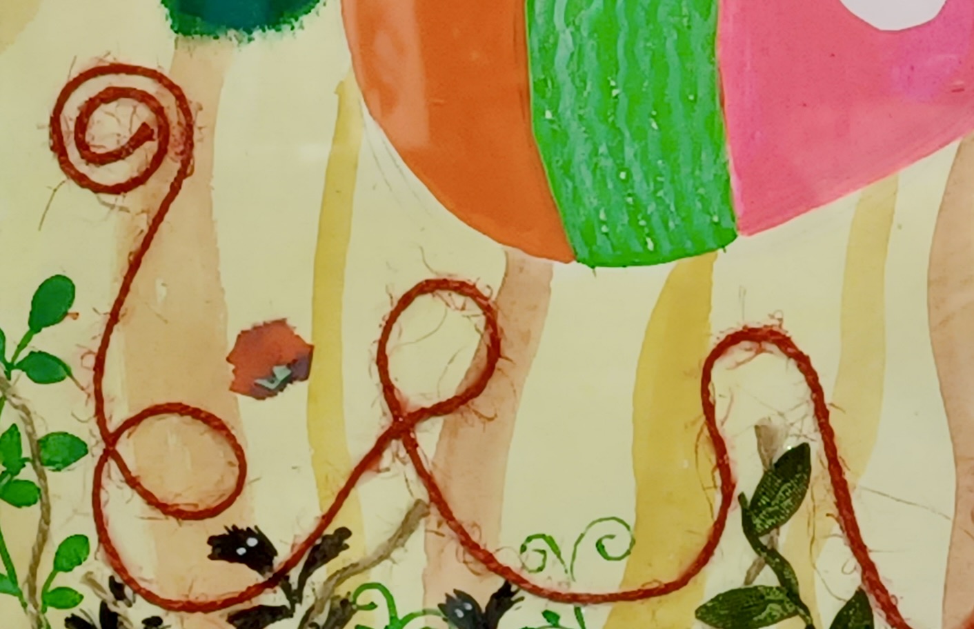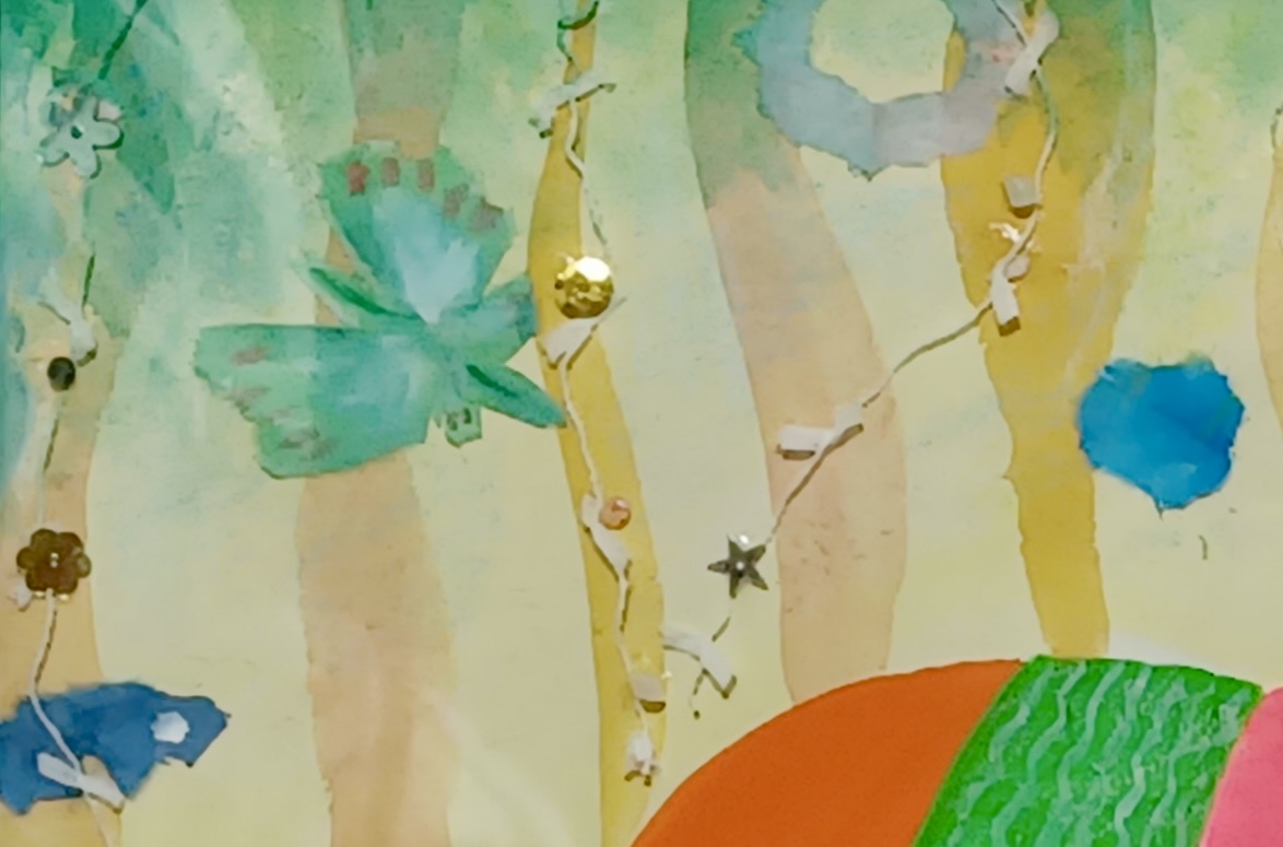 アクリル絵の具、オイルパステル、紐、糸、スパンコール、和紙などを使ったコラージュ作品です。絵本の1場面のような楽しい絵になりました。実は、子供が小さい時に描いた鉛筆画がアイデアの元です。自由なイメージで作品を楽しんでいただけたらと思います。