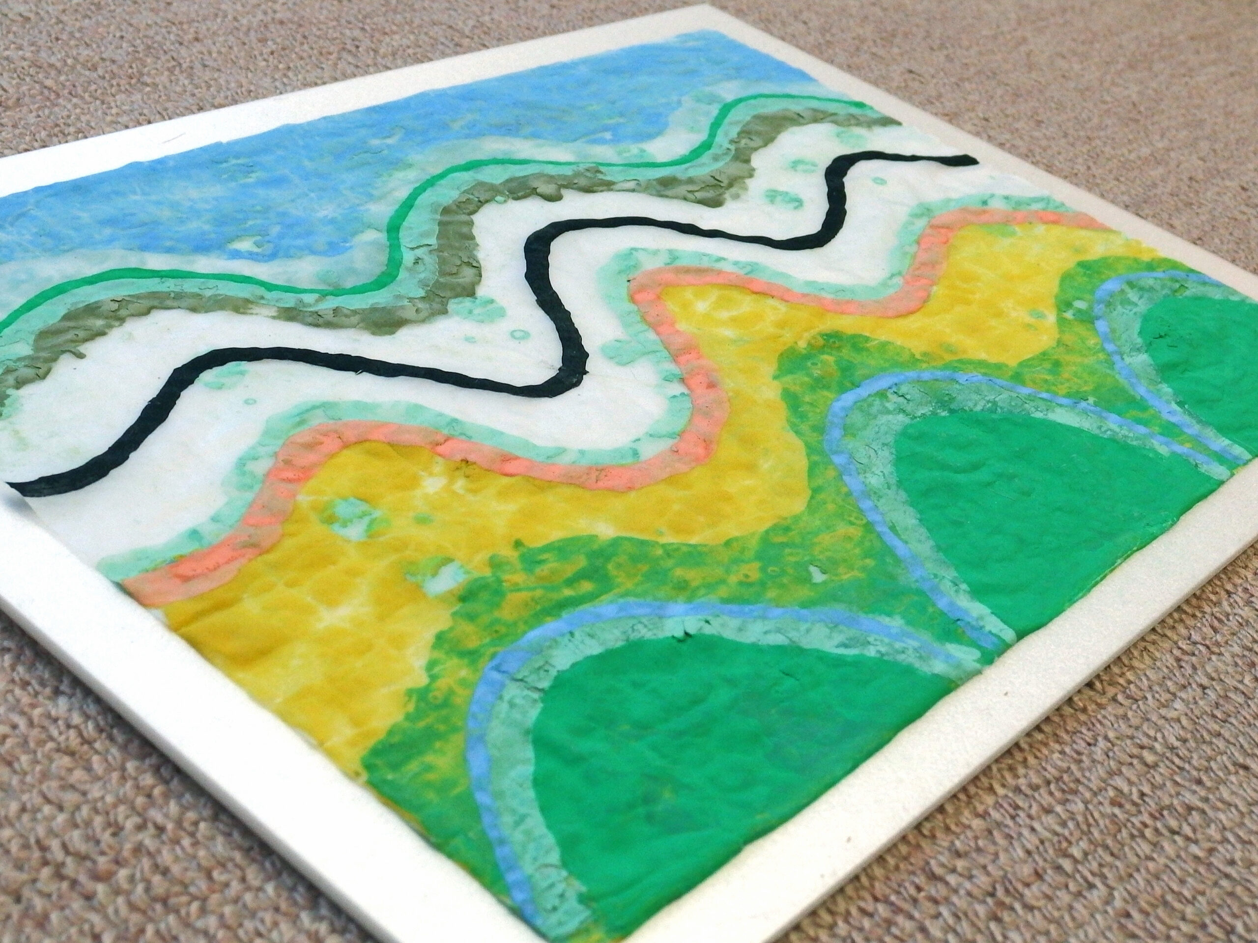 天然素材の和紙に膠を使うのが「日本画」の常識ですが、あえて人工素材を使っています。