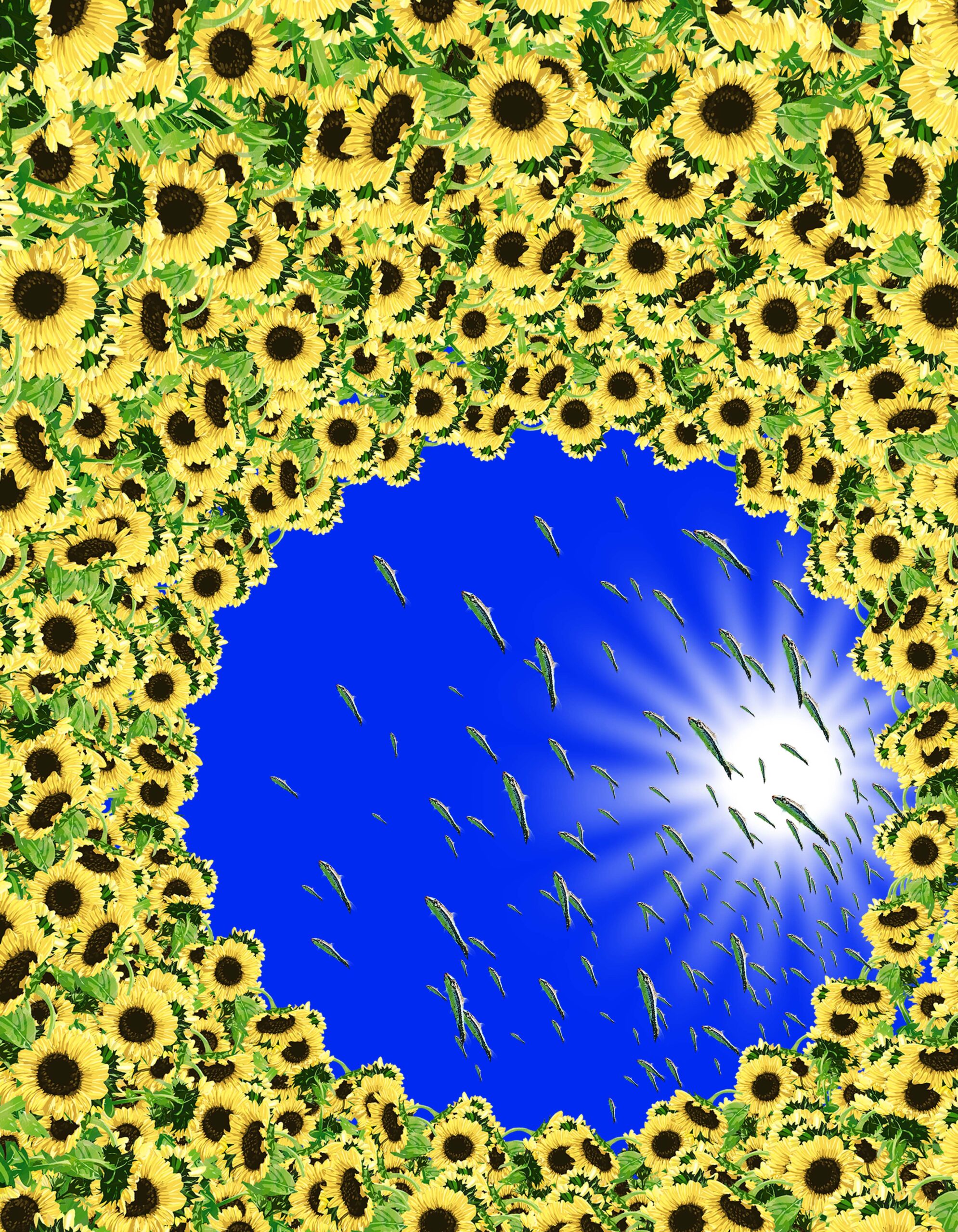 黄色いひまわり畑の上の真っ青な夏空は海のよう。熱帯魚が泳ぎ舞い上がっていくような幻覚にとらわれます。