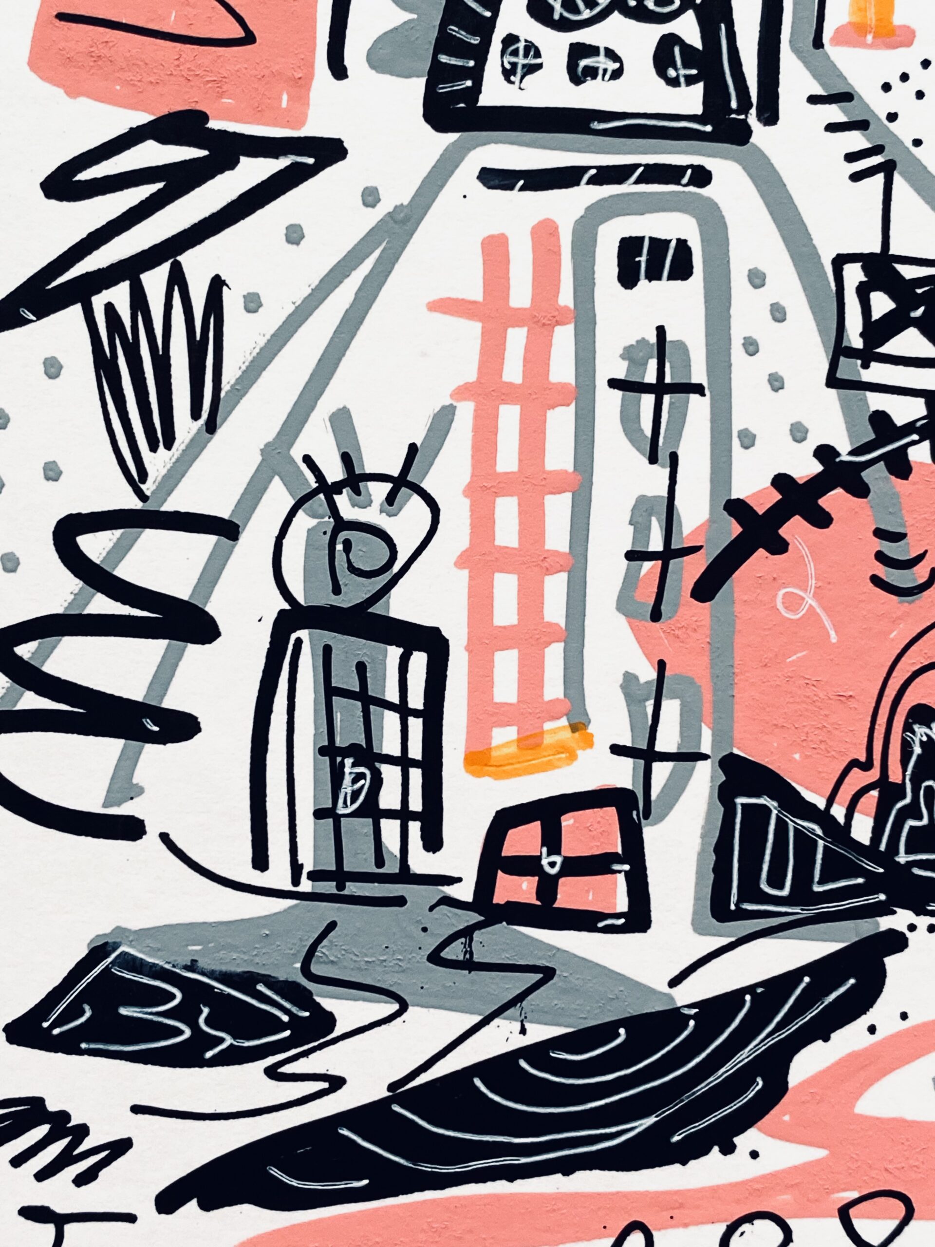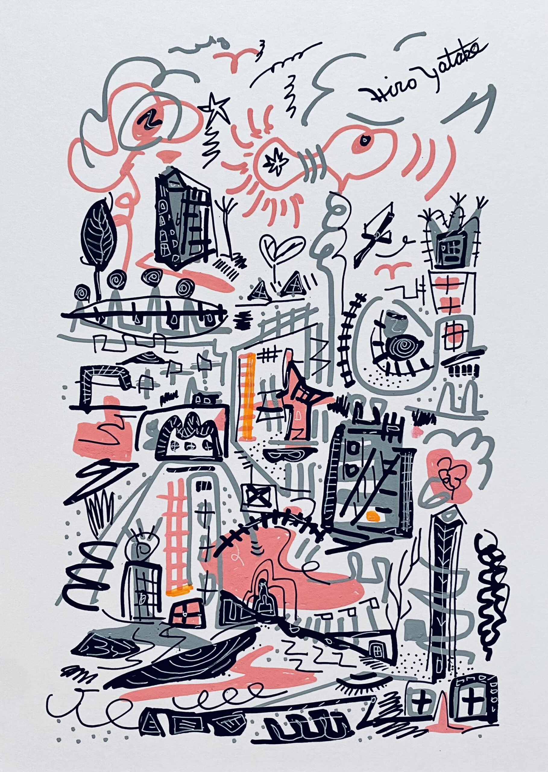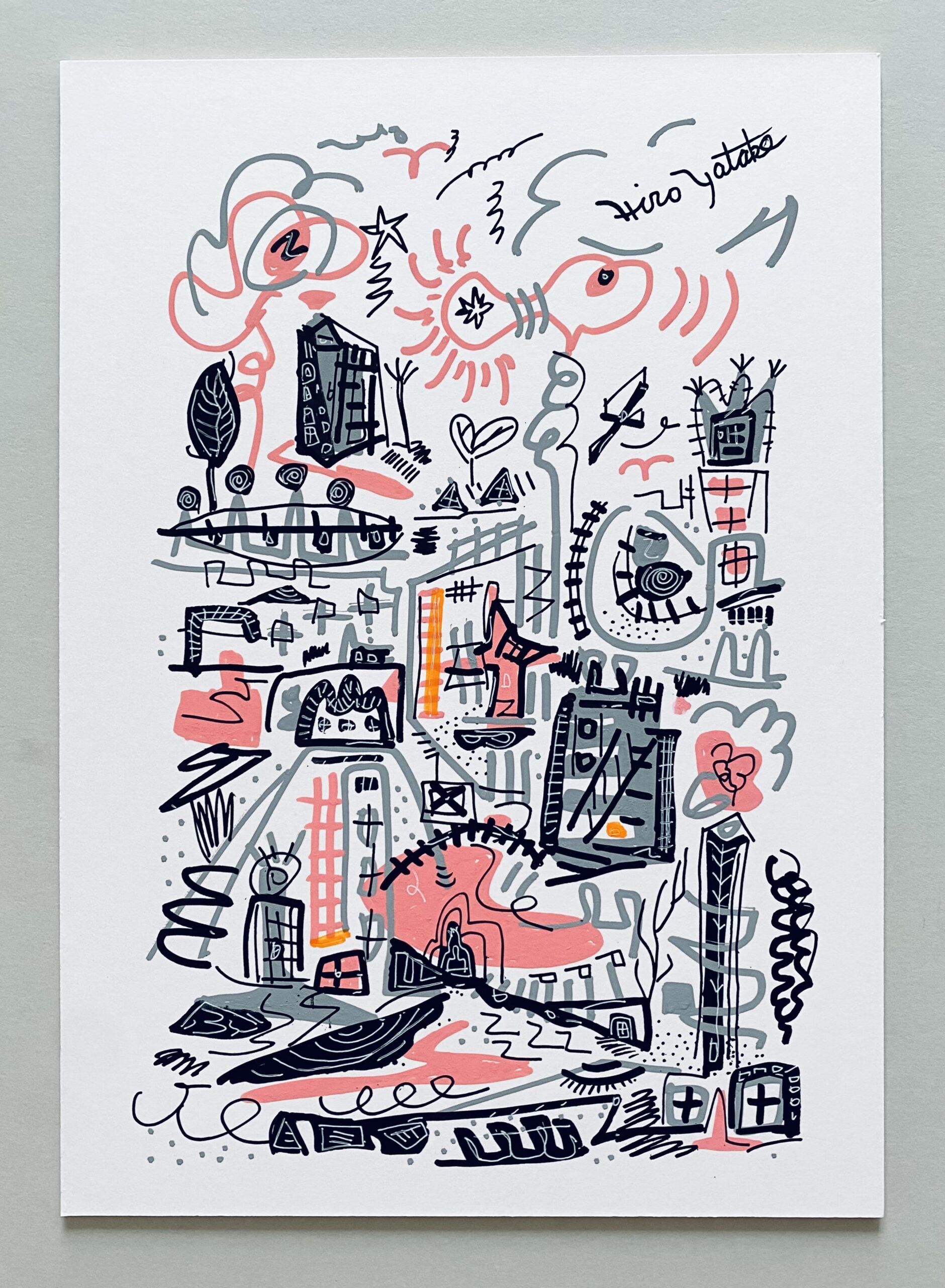 2008年 浮かんだイメージを付箋にボールペンでスケッチ。2012年になりそれをまとめたものを知人に見せたところサイズや画材をかえて絵画として発表することを勧められ、2013年、公募展にA4サイズのカードボードにペン・パステルで描いた作品を出品。その後アクリル絵具での創作をスタート。
