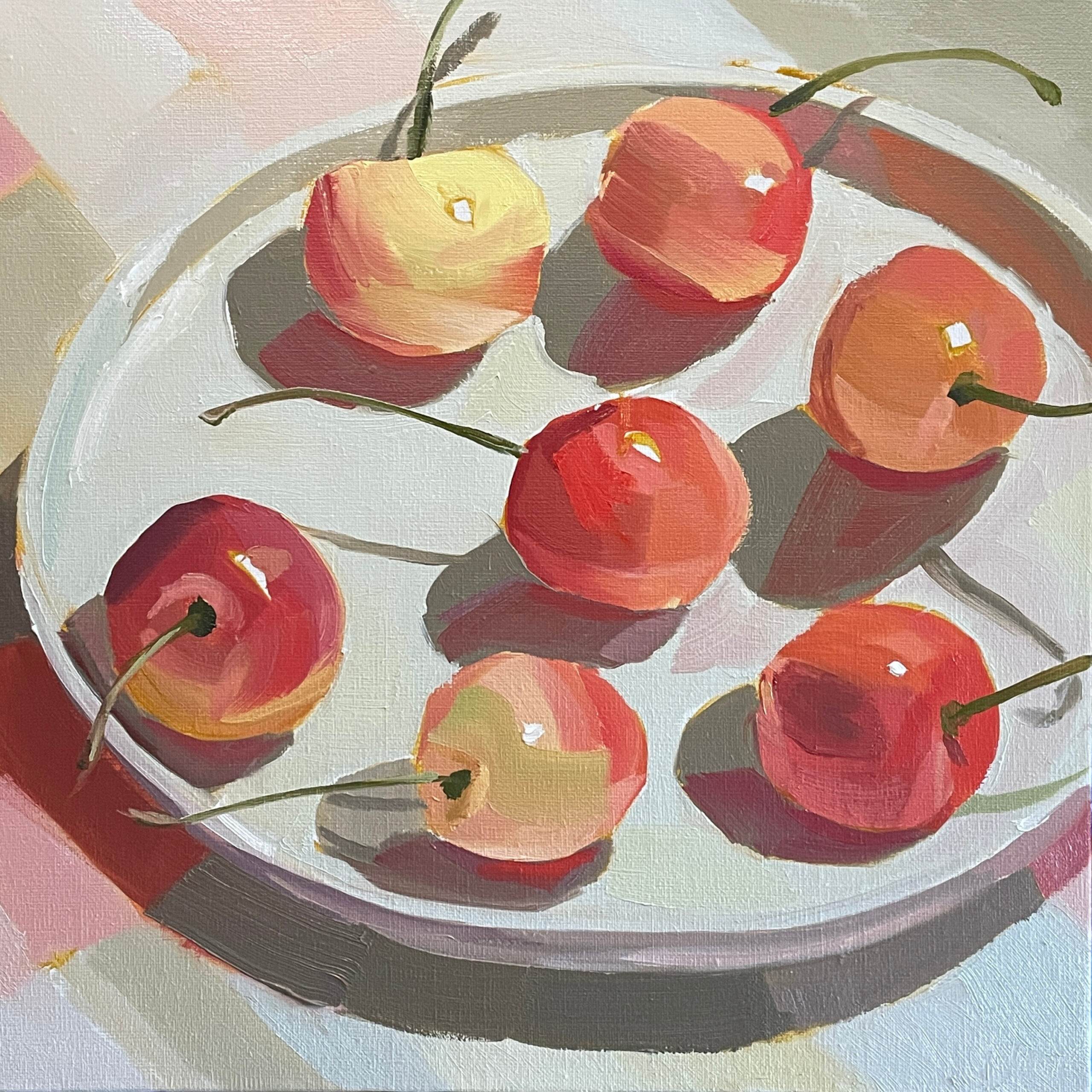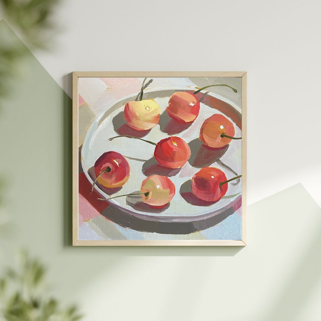 自然光を受けて輝く瑞々しいさくらんぼを描きました。