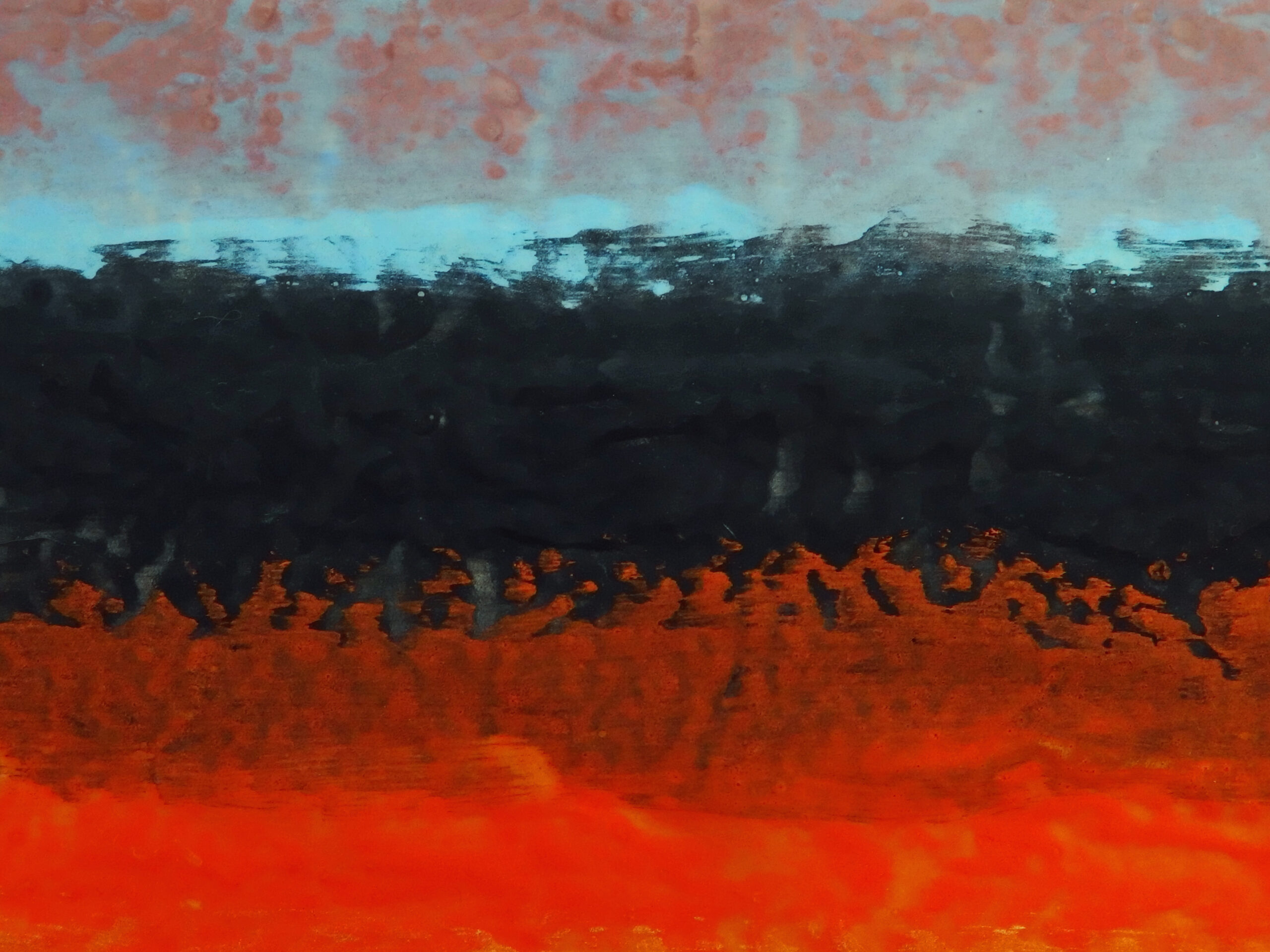 天然素材の和紙に膠を使うのが「日本画」の常識ですが、あえて人工素材を使っています。