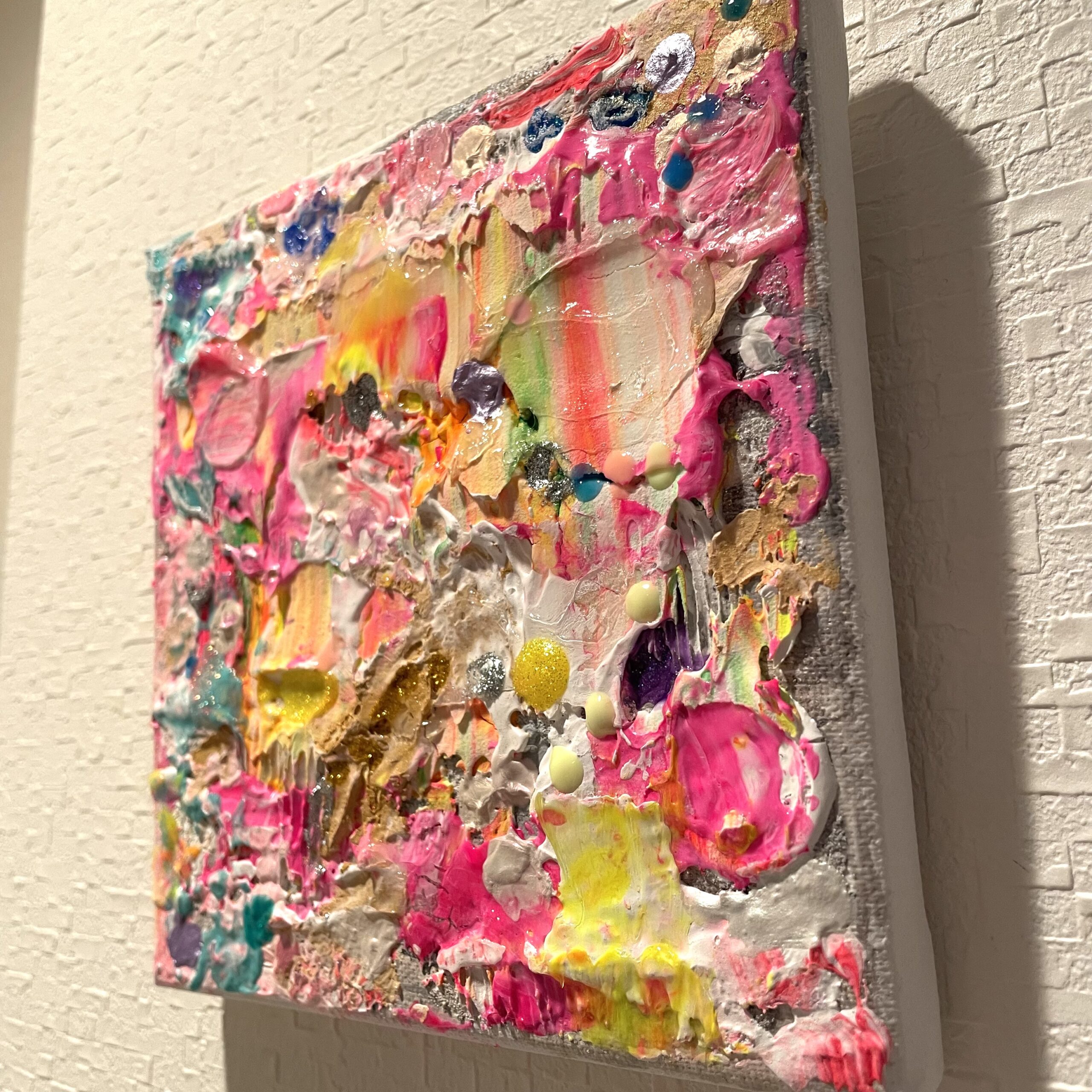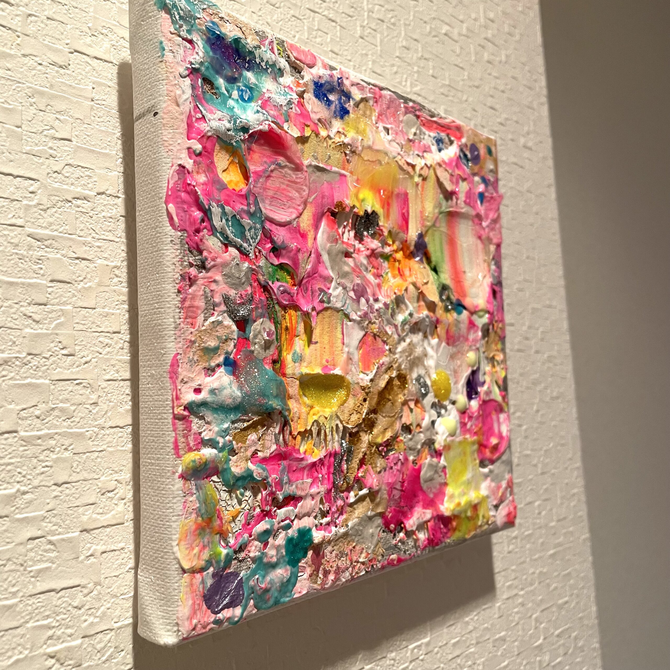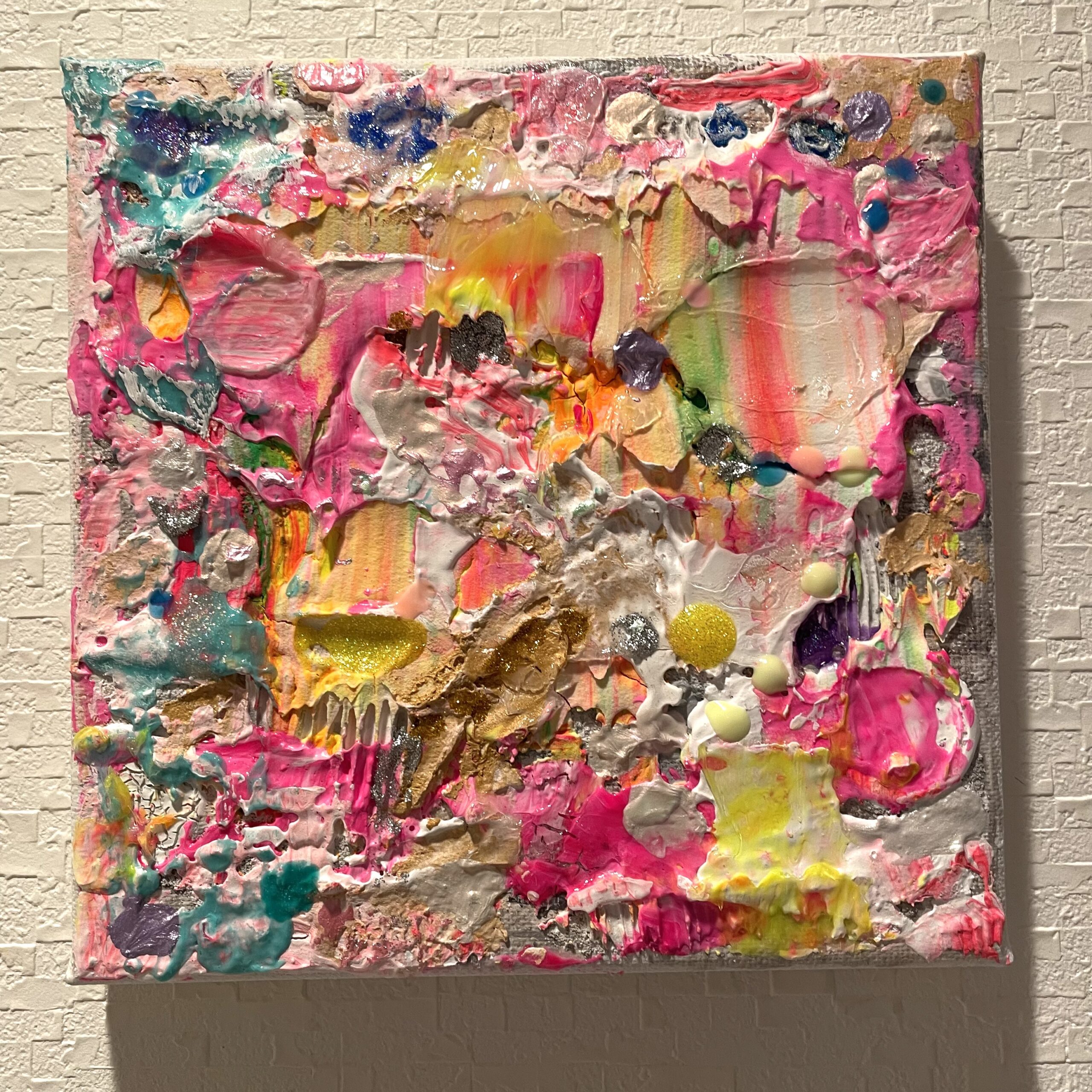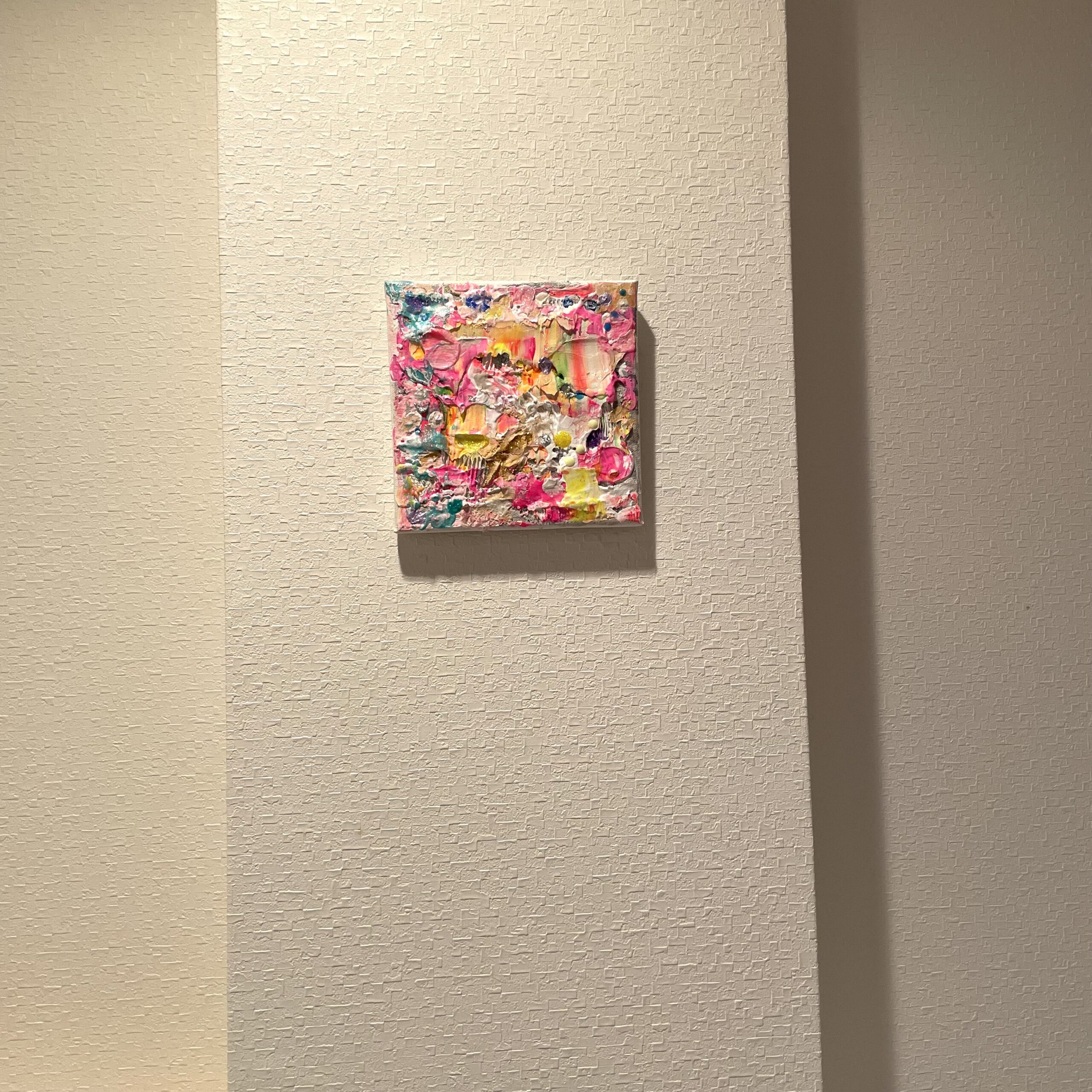 抽象画ですのでお好きなように想像して下さい。自然光と電気光では見え方も違い、テクスチャーがおもしろく、ずーっと観ていても飽きません。
