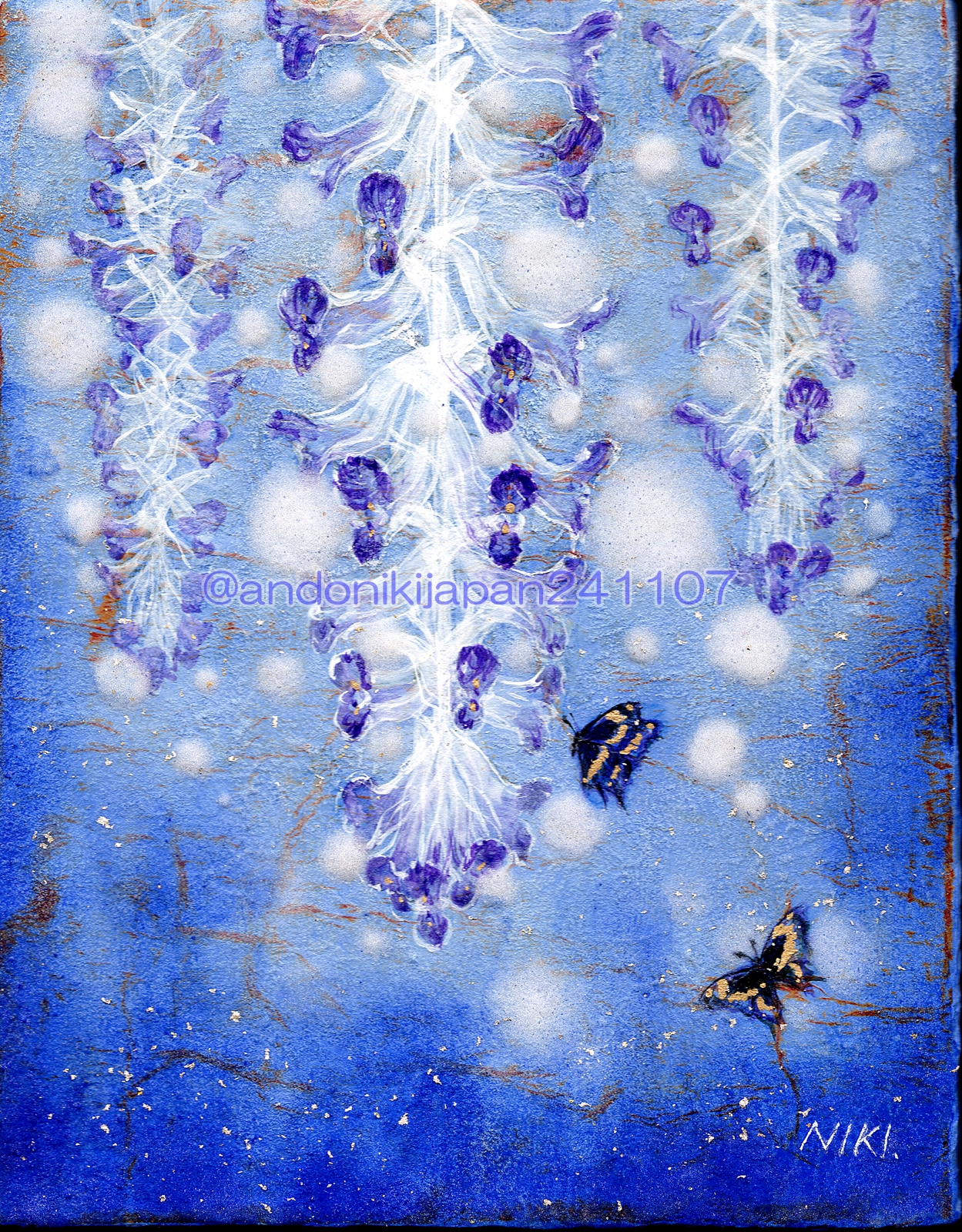横浜高島屋美術画廊で25年7月に展示していた作品です。アクリルと日本画の混合技法により、一種独特な物質感を持つ花の絵となっております。額なしですがそのまま飾れるよう、背面に紐をつけてあります。