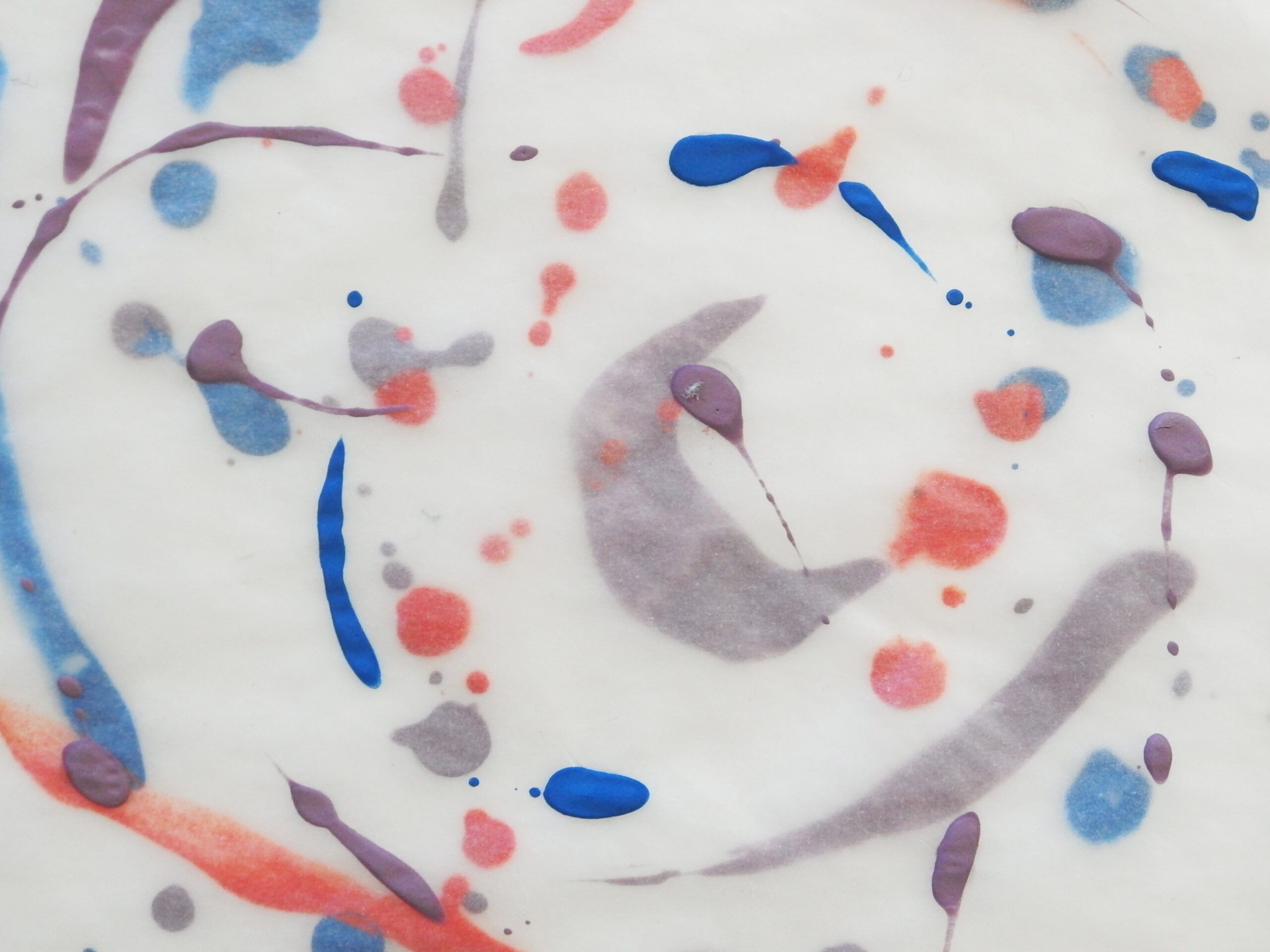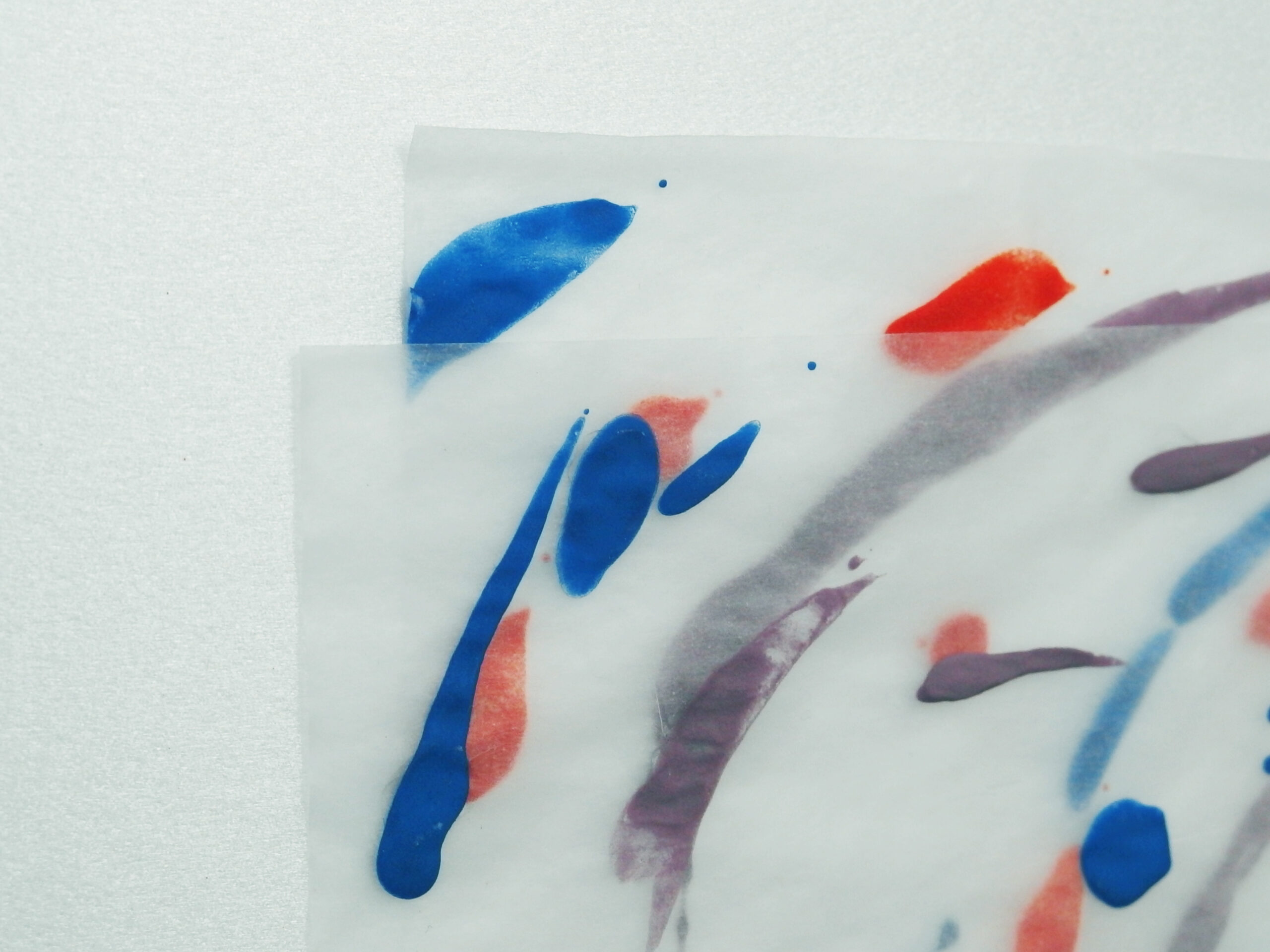 天然素材の和紙に膠を使うのが「日本画」の常識ですが、あえて人工素材を使っています。